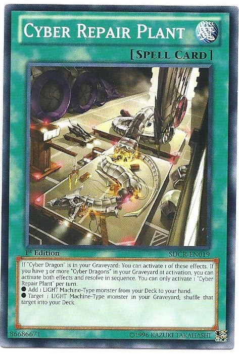 PICTURE IN LISTING IS ONLY FOR EXAMPLE ,it is a stock picture. Item condition is listed as "Used" because Ebay requires UPC codes for any item that is listed as "New", and trading cards do not have UPC Codes, so they must be listed as "Used". Card condition is listed in the listing title and in the item description. Rarity and edition of the card are described in the listing title and description. From this listing you will receive 1 card(s) for each purchase Description Set : Cyber Dragon Revolution Name : Cyber Repair Plant Number : SDCR-EN019 Rarity : Common Condition : Near Mint Language : English We get your package in the mail quickly, please rate our service based on how quickly we gave your package to the post office. Not on how long it took the post office to deliver it. As we all know we cannot control that. If you have concerns about our shipping service, please send us a message and we will gladly talk to you about it and explain it. Domestic Buyers: Domestic orders within the United States are shipped for one flat rate, no cost for additional cards purchased on the same invoice. International Buyers: International orders are shipped First Class Mail International with and an additional item fee of $0.50. Orders over $50.00 USD require additional postage fees because of shipping method changes. SPECIAL REQUIREMENTS For International Orders Any International order greater than $100.00 USD will require shipment by : USPS Global Express Mail This is a flat rate service and you may ship cards totaling up to 16 ounces, the weight limit on the package. The following International Countries can request USPS First Class Mail International Package as the shipment method for orders over $50.00 USD as this service provides electronic tracking to these countries. This service is more expensive than the normal USPS First Class Mail International service, but cheaper than USPS Priority Mail International. Australia Gibraltar Netherlands Belgium Great Britain New Zealand Canada Hungary Northern Ireland Croatia Israel Portugal Denmark Latvia Singapore Estonia Lithuania Spain Finland Luxembourg Switzerland France Malaysia Germany Malta Special Handling of International orders : We reserve the right to hold and/or cancel any International order in which it appears the buyer is attempting to circumvent our Global Express shipping requirements by breaking up larger purchases into smaller orders. Orders made within a 30 day window and having previous orders that have not yet been acknowledged as received, via Feedback and Ebay messages will be subject to this condition and may be held until all previous orders have been acknowledged as received. International Buyers – Please Note: Import duties, taxes and charges are not included in the item price or shipping charges. These charges are the buyer's responsibility. Please check with your country's customs office to determine what these additional costs will be prior to bidding/buying. SHIPPING: Every attempt is made to send your item out within 1 business day of receipt of payment. Check our feedback! Pre-sell items are shipped within 1 business day of us getting merchandise in hand. Default Shipping Methods: Domestic Orders: Shipped First Class Mail Cards will be shipped with a Hard Sleeve and/or a Soft Sleeve for protection in accordance with eBay's standard envelope policy. International Orders: Shipped First Class Mail International Cards will be shipped with a Hard Sleeve and/or a Soft Sleeve for protection in accordance with eBay's standard envelope policy. We use all new and clean products to package your cards. If you have any questions, please do not hesitate to ask!