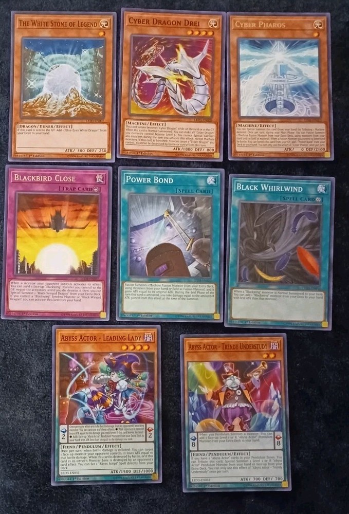 | Card Name | Power Bond, Blackbird Close, Cyber Dragon Drei, Cyber Pharos, Black Whirlwind, The White Stone of Legend, Abyss Actor - Leading Lady, Abyss Actor - Trendy Understudy, Cyber End Dragon |