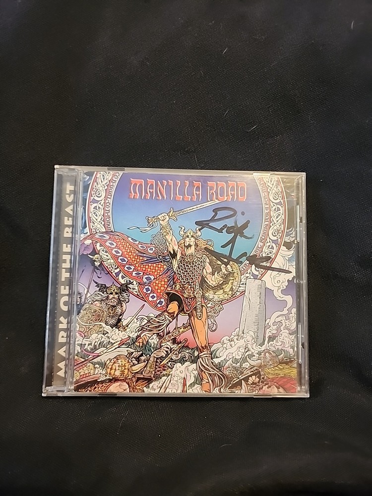 The "Mark of the Beast" CD by Manilla Road, released in 2003 under Monster Music, is a signed copy by Rick Fisher. This hard rock album features a run time of 66 minutes and comes in a standard jewel case. With a Very Good (VG) CD grading, this CD is a must-have for fans of rock and hard rock music.