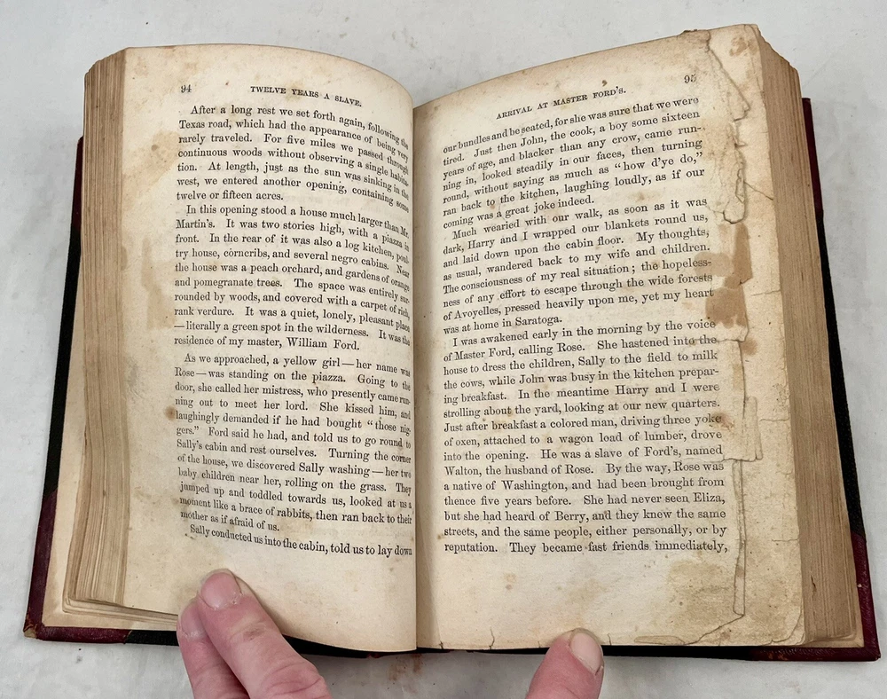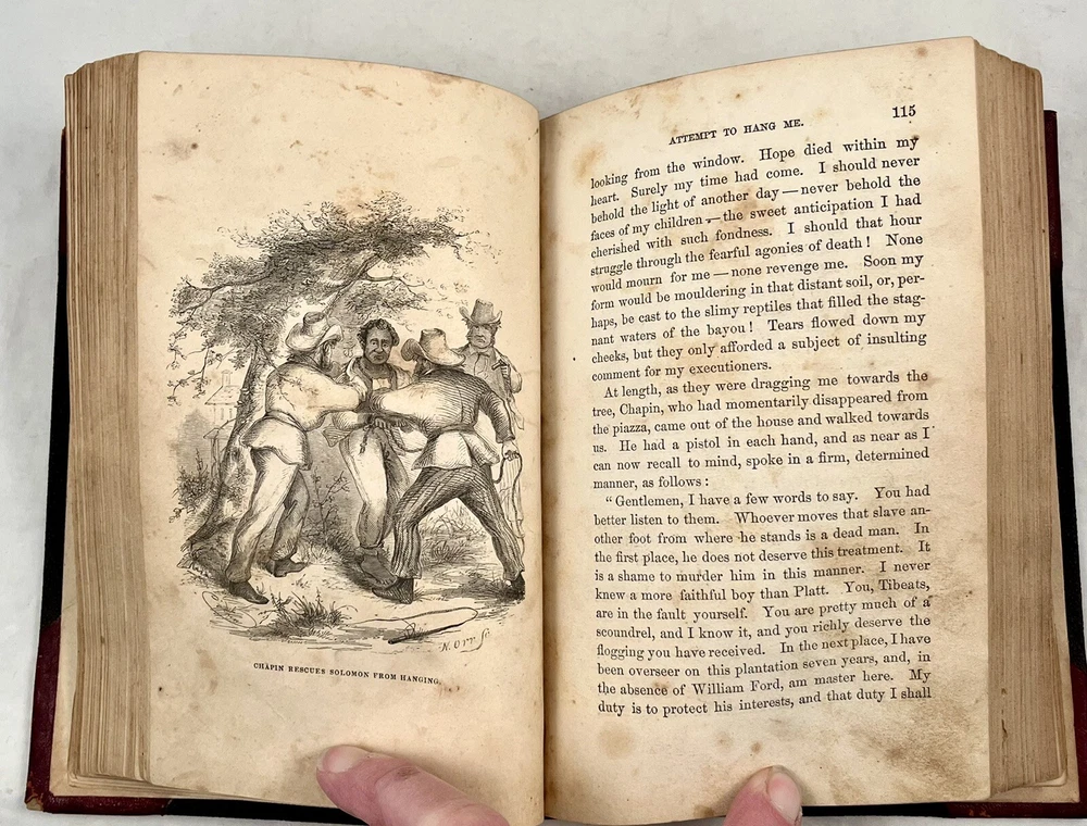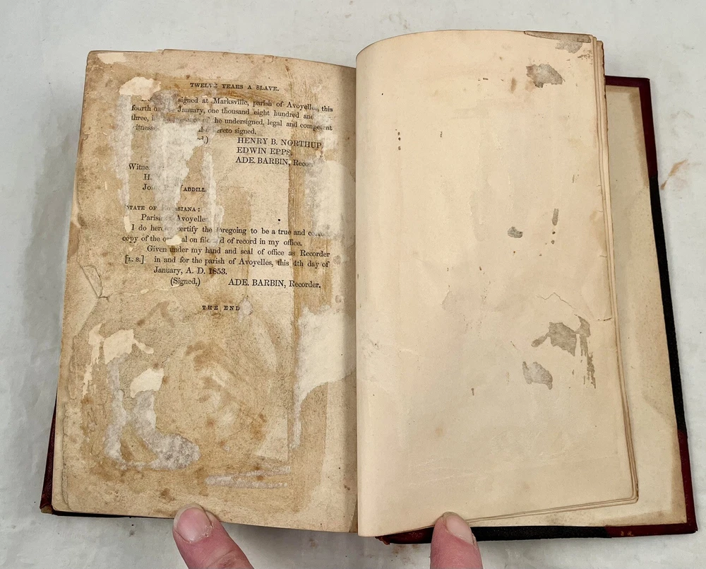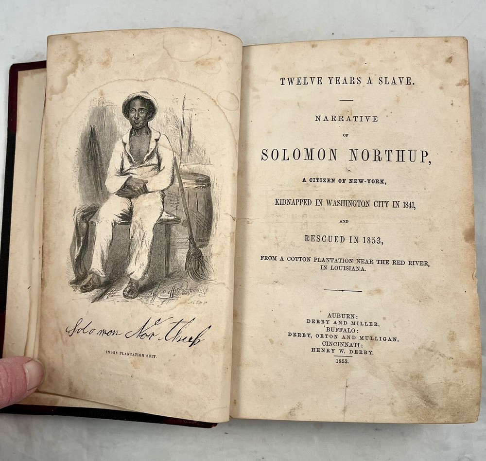 First Edition; First Printing, 336 pages. Frontispiece portrait and 6 plates. Good condition. Bound in three-quarter red leather and pebbled dark green cloth boards, with gilt-paneled spine with no titling. Boards show light rubbing to binding with cracking to hinges, and reinforcement to both front and rear gutters. Text blocks shows light to moderate foxing, light finger wear and smudging, and some fraying to fore-edges, damage to page 336 (appears to have been pasted to the next page.) See all pictures. Provenance: "Presented to Mary Rex by her father Levi Rex September 10, 1898" inscribed to front free endpaper. The memoir of Solomon Northup. A free-born African American, he was drugged and kidnapped in Washington, D.C. before being transported to New Orleans and sold into enslavement. Published during the first year of his regained freedom, the narrative was hugely popular. The first edition was reprinted several times with three additional editions by 1859. The basis of the film of the same name which won the Best Picture Academy Award in 2013. You can bid and buy with confidence. I have been an eBay seller since 2005, and will do whatever it takes to make your buying experience a total success. From a smoke-free home. Thanks for looking!