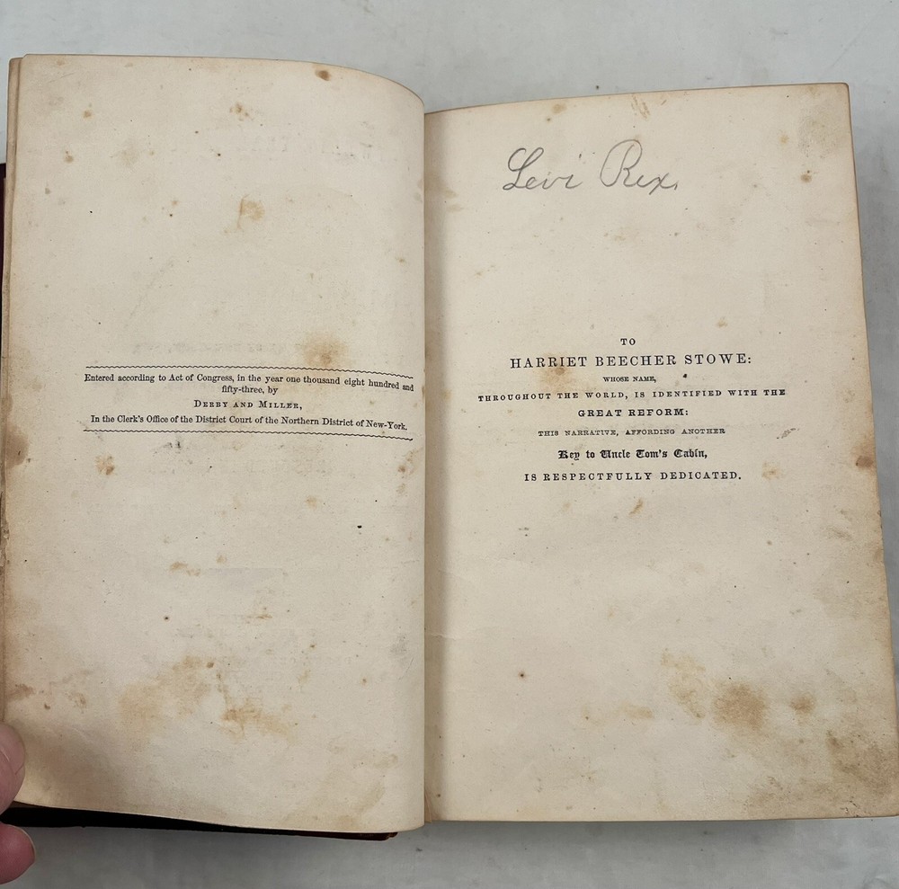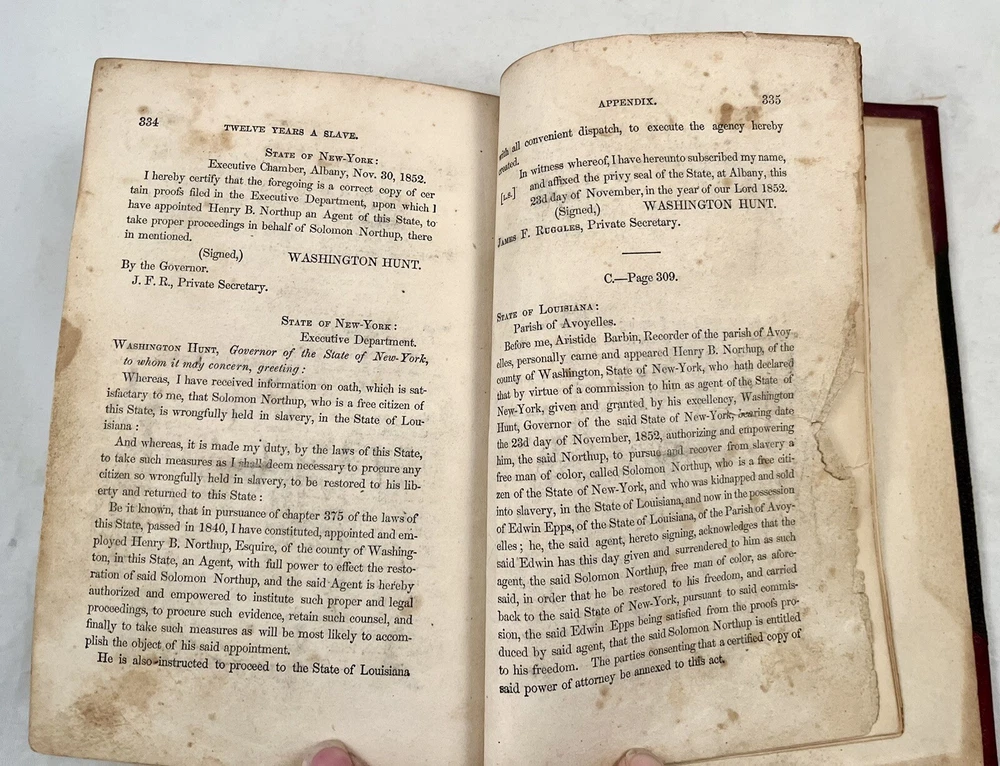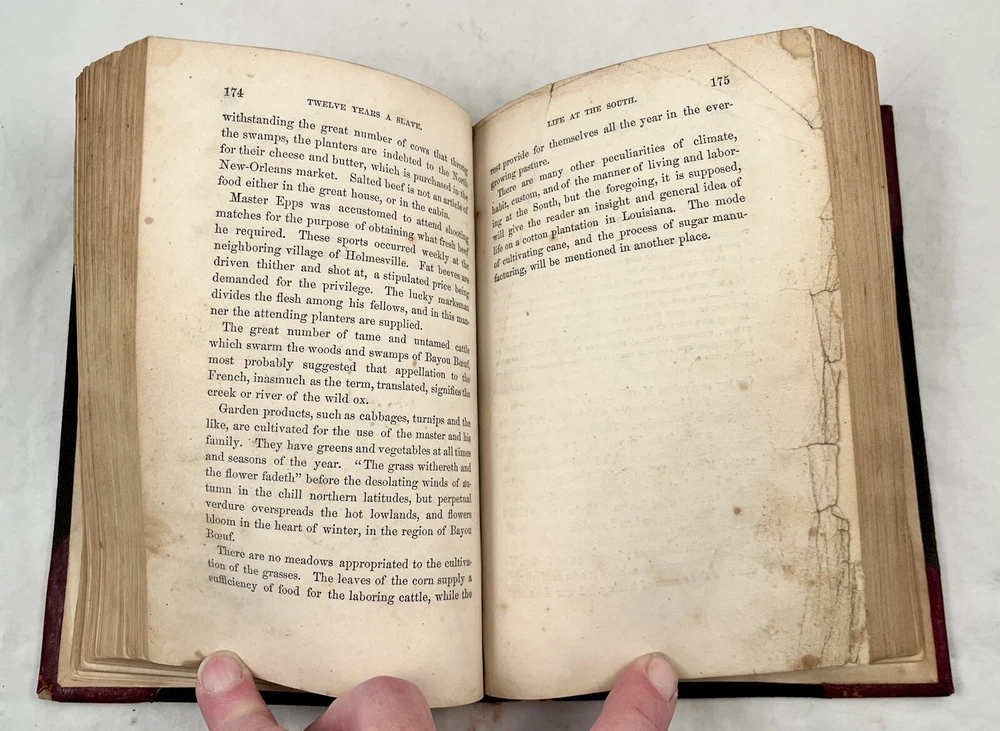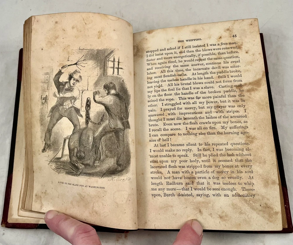 First Edition; First Printing, 336 pages. Frontispiece portrait and 6 plates. Good condition. Bound in three-quarter red leather and pebbled dark green cloth boards, with gilt-paneled spine with no titling. Boards show light rubbing to binding with cracking to hinges, and reinforcement to both front and rear gutters. Text blocks shows light to moderate foxing, light finger wear and smudging, and some fraying to fore-edges, damage to page 336 (appears to have been pasted to the next page.) See all pictures. Provenance: "Presented to Mary Rex by her father Levi Rex September 10, 1898" inscribed to front free endpaper. The memoir of Solomon Northup. A free-born African American, he was drugged and kidnapped in Washington, D.C. before being transported to New Orleans and sold into enslavement. Published during the first year of his regained freedom, the narrative was hugely popular. The first edition was reprinted several times with three additional editions by 1859. The basis of the film of the same name which won the Best Picture Academy Award in 2013. You can bid and buy with confidence. I have been an eBay seller since 2005, and will do whatever it takes to make your buying experience a total success. From a smoke-free home. Thanks for looking!