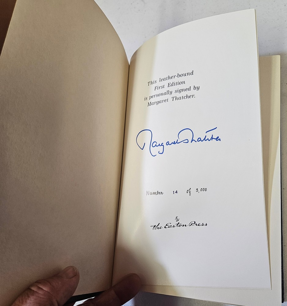 This is an extremely low number! #14 of 3,000. Signed Easton Press Autobiography Book by The Iron Lady, former British Prime Minister Margaret Thatcher. Very Good Condition, or better. That’s my guarantee to you! Embossed Leather Hardcover has been protected. and Pages have light wear for 1995 as shown. Perfect for people who like Books by or about Women in History or Politics. 655 pages plus. Extra Large Book. #primebooksellers #book #books #autobiography #biography #margaretthatcher #britishpm #british #primeminister #england #english #uk #unitedkingdom #history #politics #easton #eastonpress #leather #signed #signature #autograph #popculture