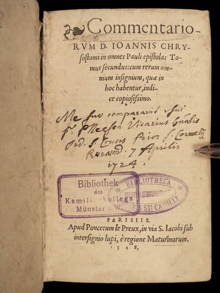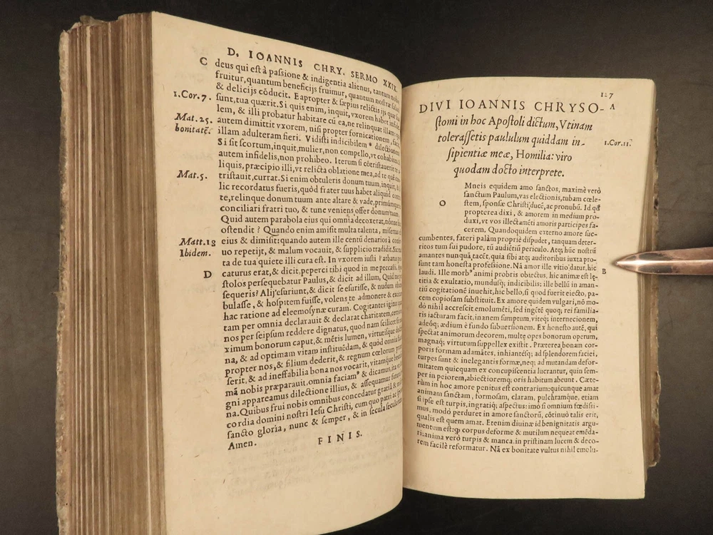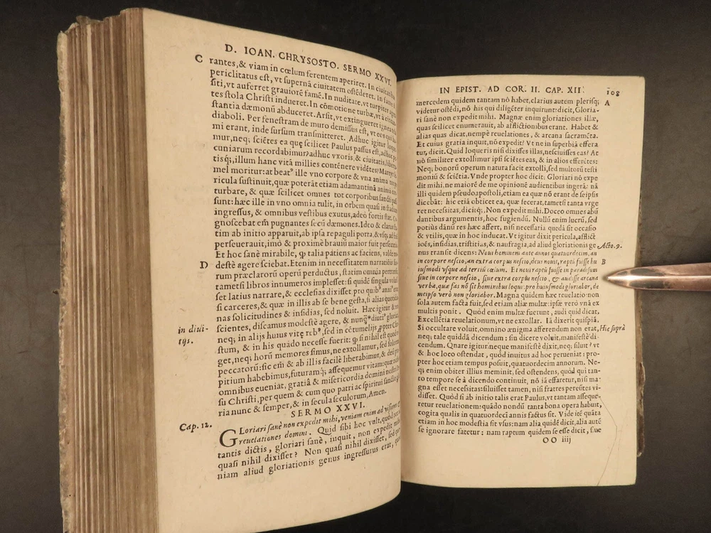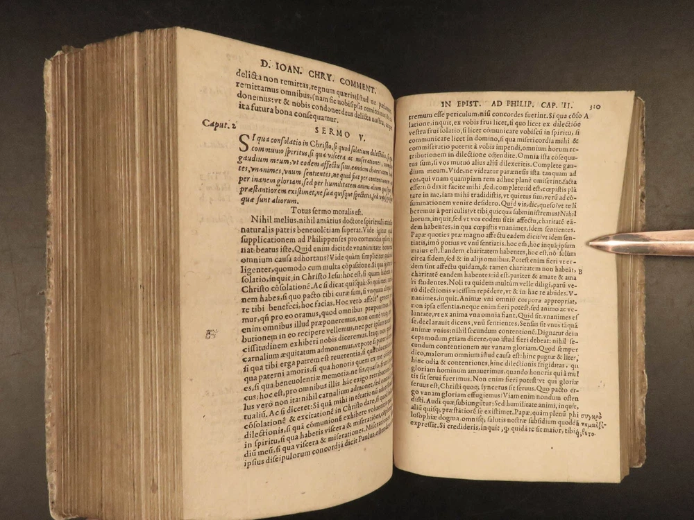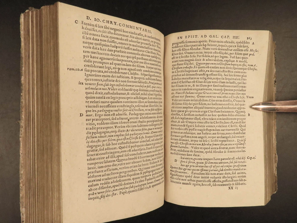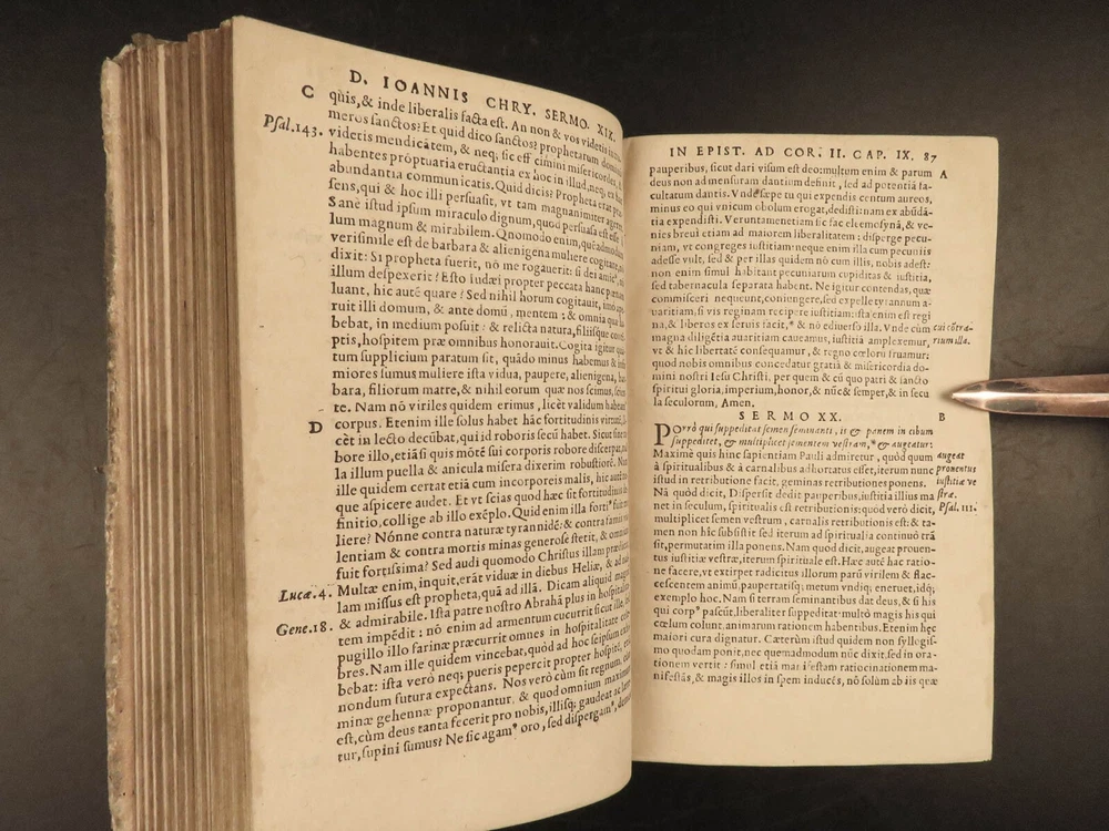 1548 Saint John Chrysostom + ERASMUS Bible Commentary Pauline Epistles Galatians “Happiness can only be achieved by looking inward & learning to enjoy whatever life has and this requires transforming greed into gratitude.” ― John Chrysostom A rare 16 th -century printing of works of John Chrysostom. Chrysostom was one of the most important Early Christian Church authors and preachers and is most remembered for his sermons and homilies. He preached on many different subjects, but his most frequented topic was helping the needy. Chrysostom calls for followers of Jesus to set aside their material desires to help the poor, often in a way that shamed the rich and guilted them in to giving. “Do you pay such honor to your excrements as to receive them into a silver chamber-pot when another man made in the image of God is perishing in the cold?” (Chrysostom in Liebeschuetz ) One of his best works was his commentary on the New Testament Pauline epistles, a work on which Erasmus of Rotterdam wrote is own commentary. This 1548 volume of Erasmus’s commentary on Chrysostom was published in Paris by Poncet le Preux and contains commentary on 2 Corinthians, Galatians, Ephesians, Philippians, and Colossians. Item number: #25435 Price: $795 CHRYSOSTOM, John Saint Commentariorum D. Ioannis Chrysostomi in omnes D. Pauli epistolas tomus secundus Paris: Poncet Le Preux, 1548. Details : · Collation: Complete with all pages; o [16], 422 leaves · References: Liebeschuetz, Barbarians and Bishops, p. 176 · Language: Latin · Binding: Leather; tight and secure · Size: ~6.75in X 4.25in (17cm x 11cm) Our Guarantee: Very Fast. Very Safe. Free Shipping Worldwide. Customer satisfaction is our priority! Notify us with 7 days of receiving, and we will offer a full refund without reservation! 25435