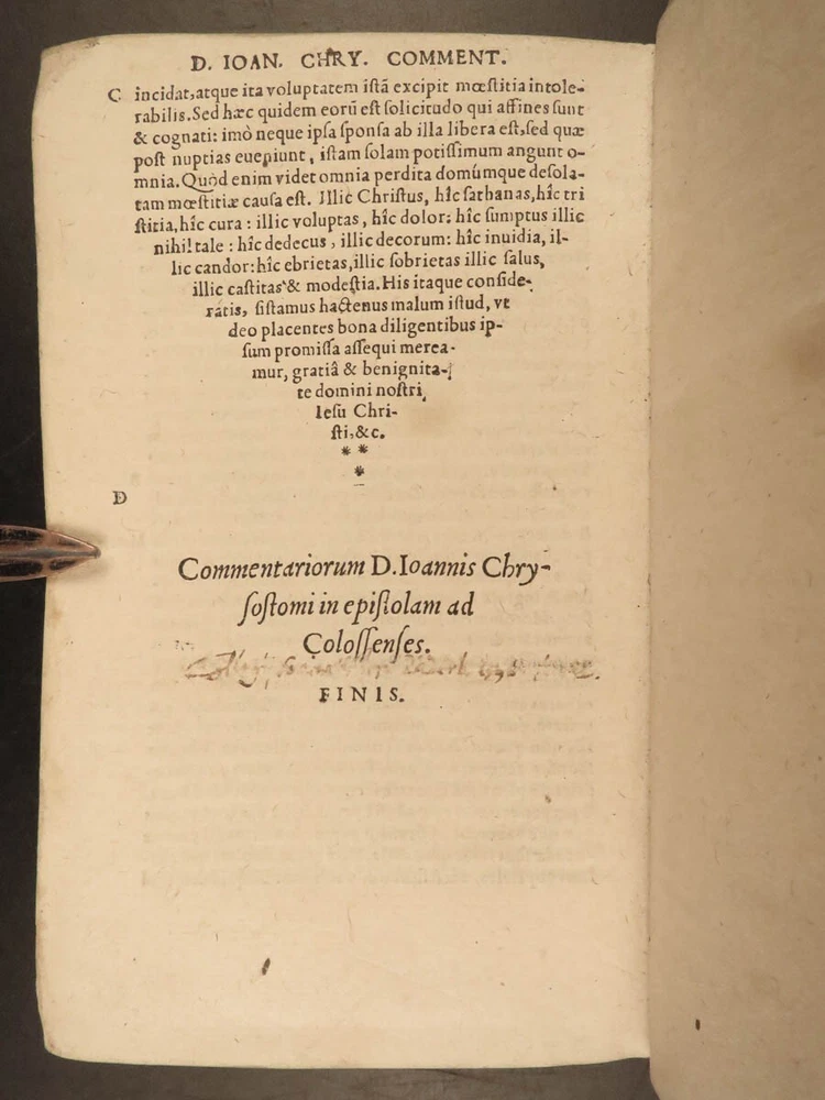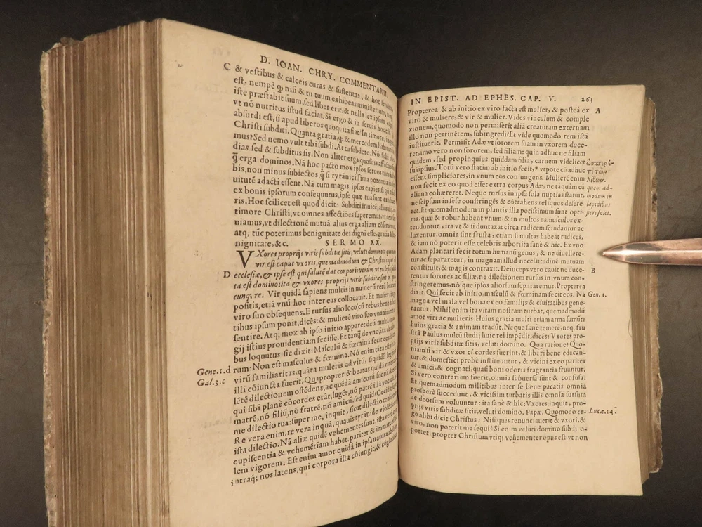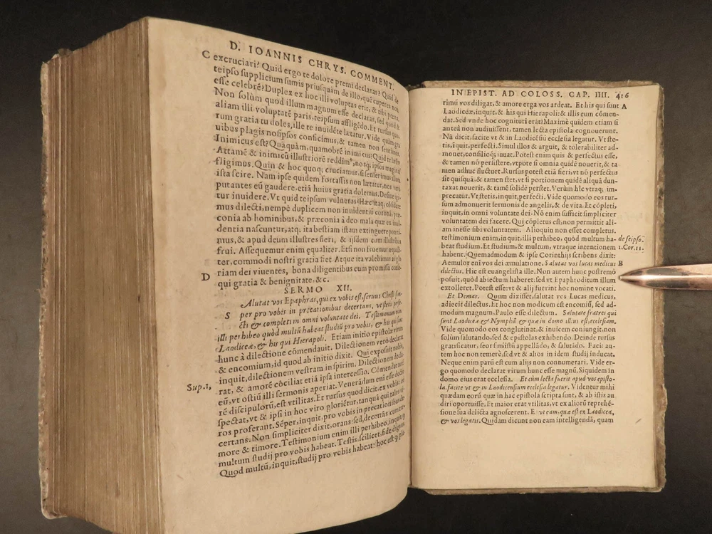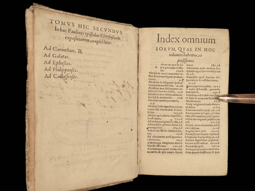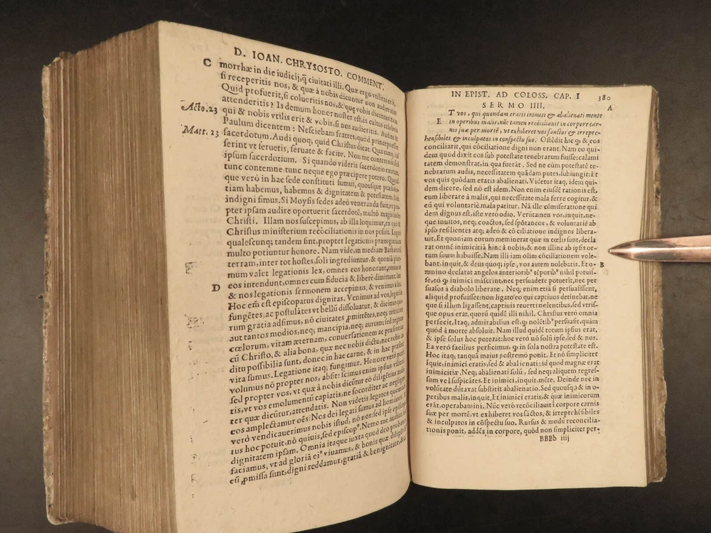 1548 Saint John Chrysostom + ERASMUS Bible Commentary Pauline Epistles Galatians “Happiness can only be achieved by looking inward & learning to enjoy whatever life has and this requires transforming greed into gratitude.” ― John Chrysostom A rare 16 th -century printing of works of John Chrysostom. Chrysostom was one of the most important Early Christian Church authors and preachers and is most remembered for his sermons and homilies. He preached on many different subjects, but his most frequented topic was helping the needy. Chrysostom calls for followers of Jesus to set aside their material desires to help the poor, often in a way that shamed the rich and guilted them in to giving. “Do you pay such honor to your excrements as to receive them into a silver chamber-pot when another man made in the image of God is perishing in the cold?” (Chrysostom in Liebeschuetz ) One of his best works was his commentary on the New Testament Pauline epistles, a work on which Erasmus of Rotterdam wrote is own commentary. This 1548 volume of Erasmus’s commentary on Chrysostom was published in Paris by Poncet le Preux and contains commentary on 2 Corinthians, Galatians, Ephesians, Philippians, and Colossians. Item number: #25435 Price: $795 CHRYSOSTOM, John Saint Commentariorum D. Ioannis Chrysostomi in omnes D. Pauli epistolas tomus secundus Paris: Poncet Le Preux, 1548. Details : · Collation: Complete with all pages; o [16], 422 leaves · References: Liebeschuetz, Barbarians and Bishops, p. 176 · Language: Latin · Binding: Leather; tight and secure · Size: ~6.75in X 4.25in (17cm x 11cm) Our Guarantee: Very Fast. Very Safe. Free Shipping Worldwide. Customer satisfaction is our priority! Notify us with 7 days of receiving, and we will offer a full refund without reservation! 25435