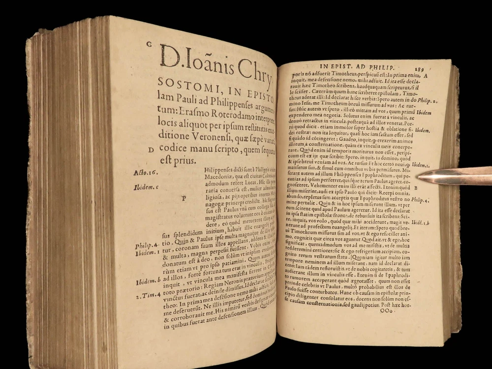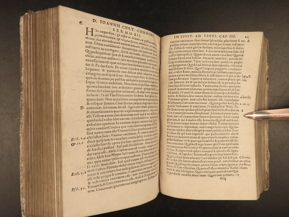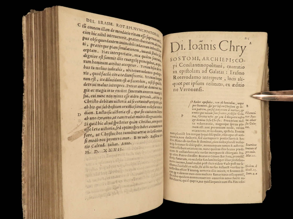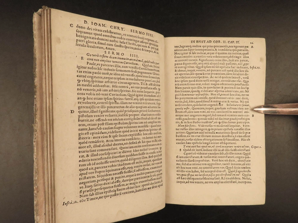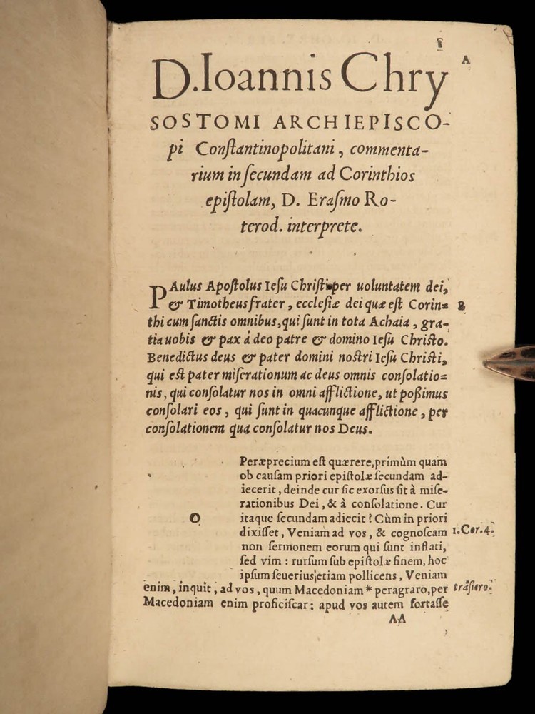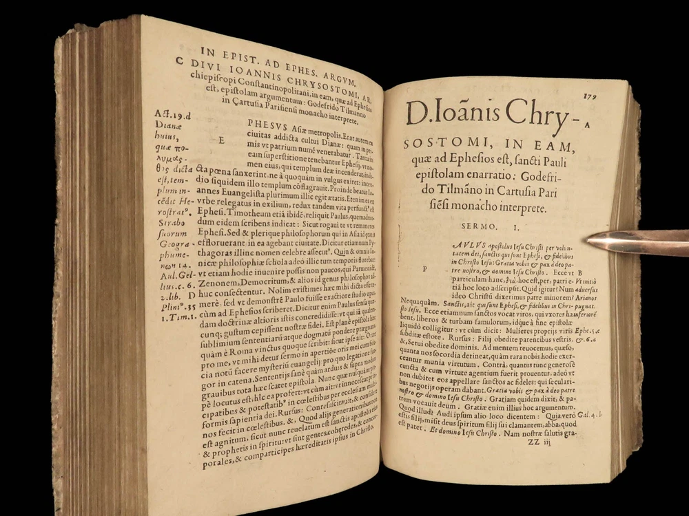 1548 Saint John Chrysostom + ERASMUS Bible Commentary Pauline Epistles Galatians “Happiness can only be achieved by looking inward & learning to enjoy whatever life has and this requires transforming greed into gratitude.” ― John Chrysostom A rare 16 th -century printing of works of John Chrysostom. Chrysostom was one of the most important Early Christian Church authors and preachers and is most remembered for his sermons and homilies. He preached on many different subjects, but his most frequented topic was helping the needy. Chrysostom calls for followers of Jesus to set aside their material desires to help the poor, often in a way that shamed the rich and guilted them in to giving. “Do you pay such honor to your excrements as to receive them into a silver chamber-pot when another man made in the image of God is perishing in the cold?” (Chrysostom in Liebeschuetz ) One of his best works was his commentary on the New Testament Pauline epistles, a work on which Erasmus of Rotterdam wrote is own commentary. This 1548 volume of Erasmus’s commentary on Chrysostom was published in Paris by Poncet le Preux and contains commentary on 2 Corinthians, Galatians, Ephesians, Philippians, and Colossians. Item number: #25435 Price: $795 CHRYSOSTOM, John Saint Commentariorum D. Ioannis Chrysostomi in omnes D. Pauli epistolas tomus secundus Paris: Poncet Le Preux, 1548. Details : · Collation: Complete with all pages; o [16], 422 leaves · References: Liebeschuetz, Barbarians and Bishops, p. 176 · Language: Latin · Binding: Leather; tight and secure · Size: ~6.75in X 4.25in (17cm x 11cm) Our Guarantee: Very Fast. Very Safe. Free Shipping Worldwide. Customer satisfaction is our priority! Notify us with 7 days of receiving, and we will offer a full refund without reservation! 25435
