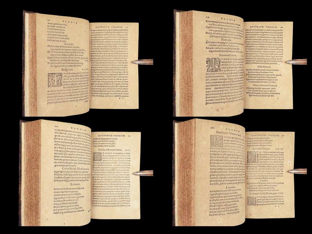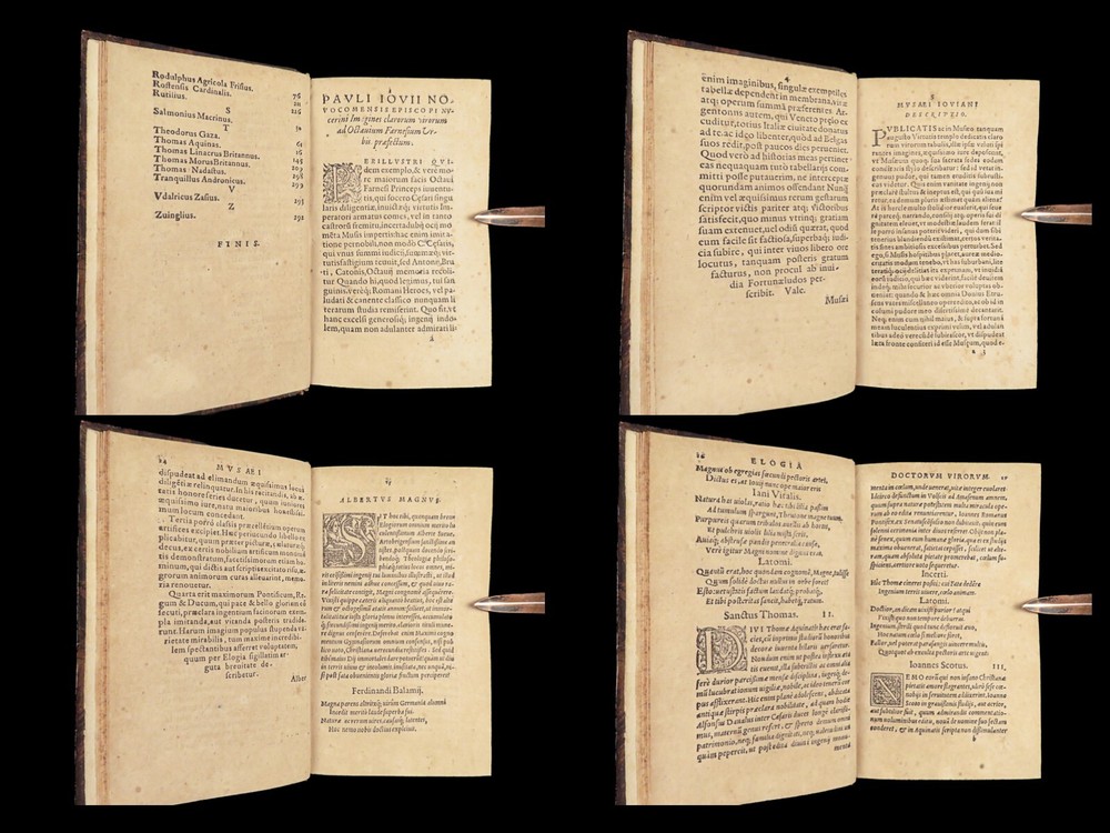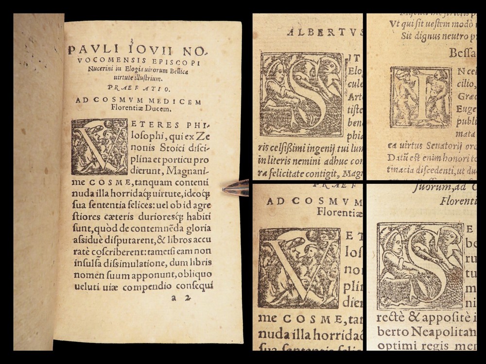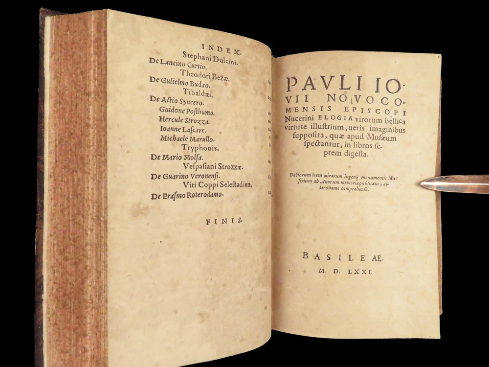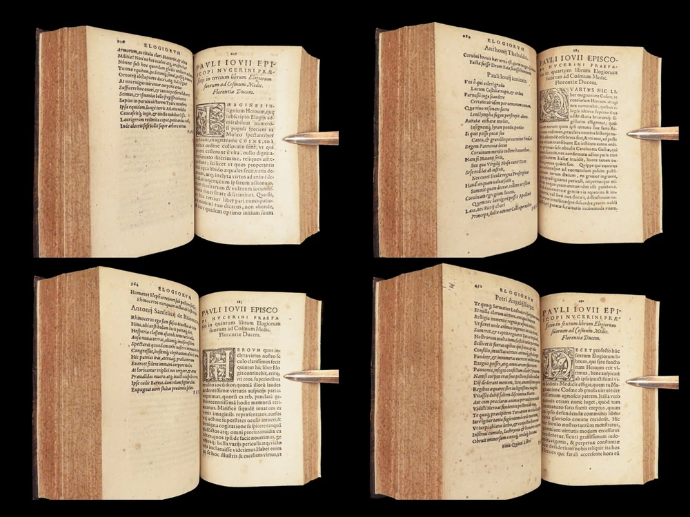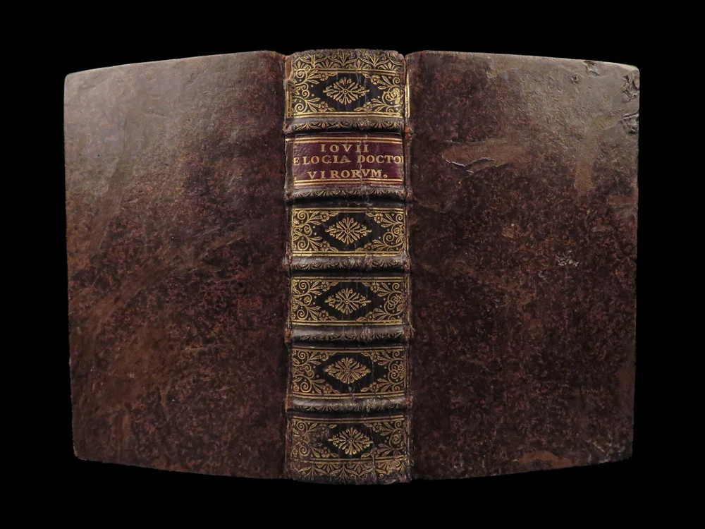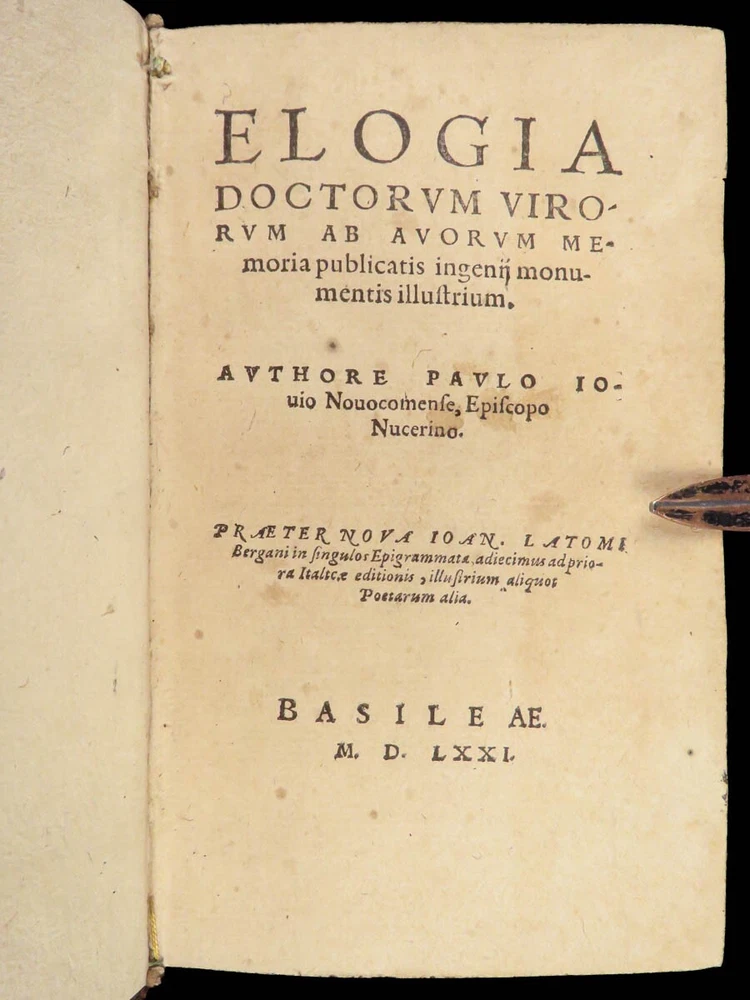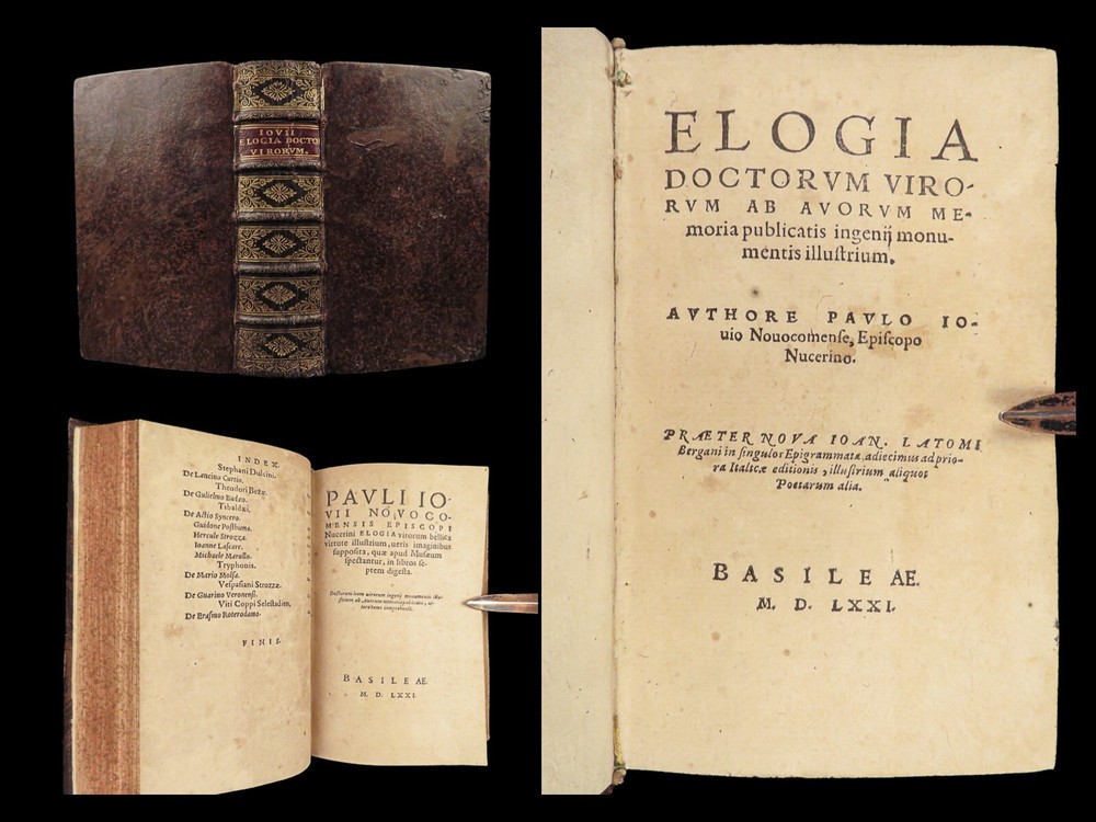 1571 Paolo Giovio Biographies of Alexander the Great Columbus Cortez Charlemagne Paolo Giovio’s “ Eulogies of Men ” is a mid-16 th -century collection of biographies and histories of politicians, explorers, royals, and military heroes. Translated and edited by Johannes Latomus, this 1571 printing includes biographies of figures such as: · Alexander the Great · Christopher Columbus · Ludovico Sforza · Romulus · Hernando Cortez · Charlemagne Item number: #28448 Price: $995 GIOVIO, Paolo Elogia doctorum virorum ingenii monumentis illustrium Basileae: [Petri & Perna], 1571. Details : · Collation: Complete with all pages o Elogia – [16], 312, [8] o Comensis – 592 (i.e., 590), [16] § Includes separate title page · References: USTC 607333; Adams G 642 (Turin ed) · Language: Latin · Binding: Leather; tight and secure · Size: ~6.5in X 4in (16cm x 10cm) Our Guarantee: Very Fast. Very Safe. Free Shipping Worldwide. Customer satisfaction is our priority! Notify us with 7 days of receiving, and we will offer a full refund without reservation!