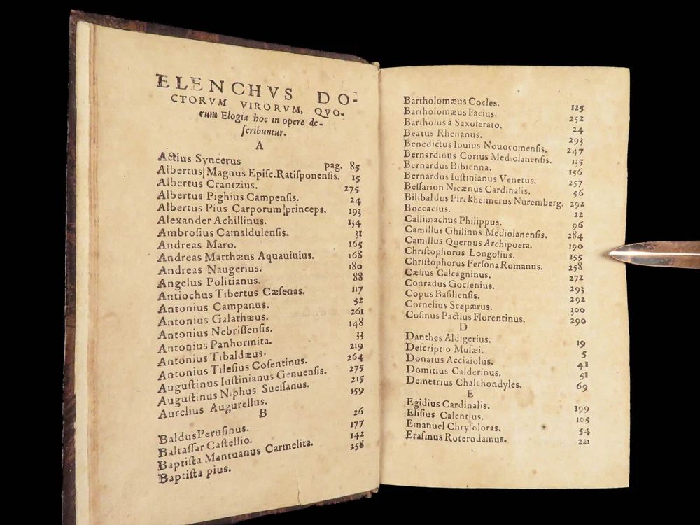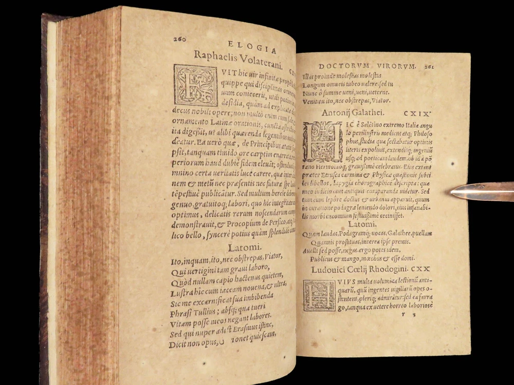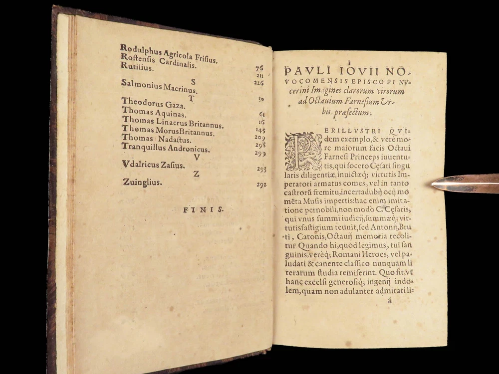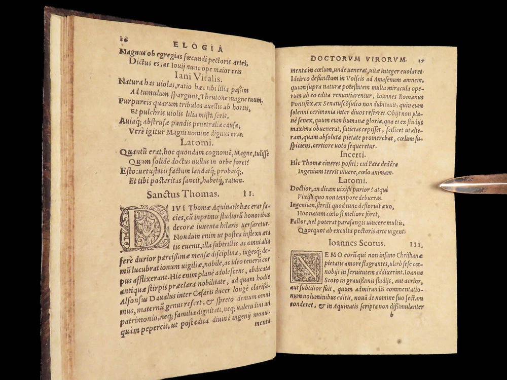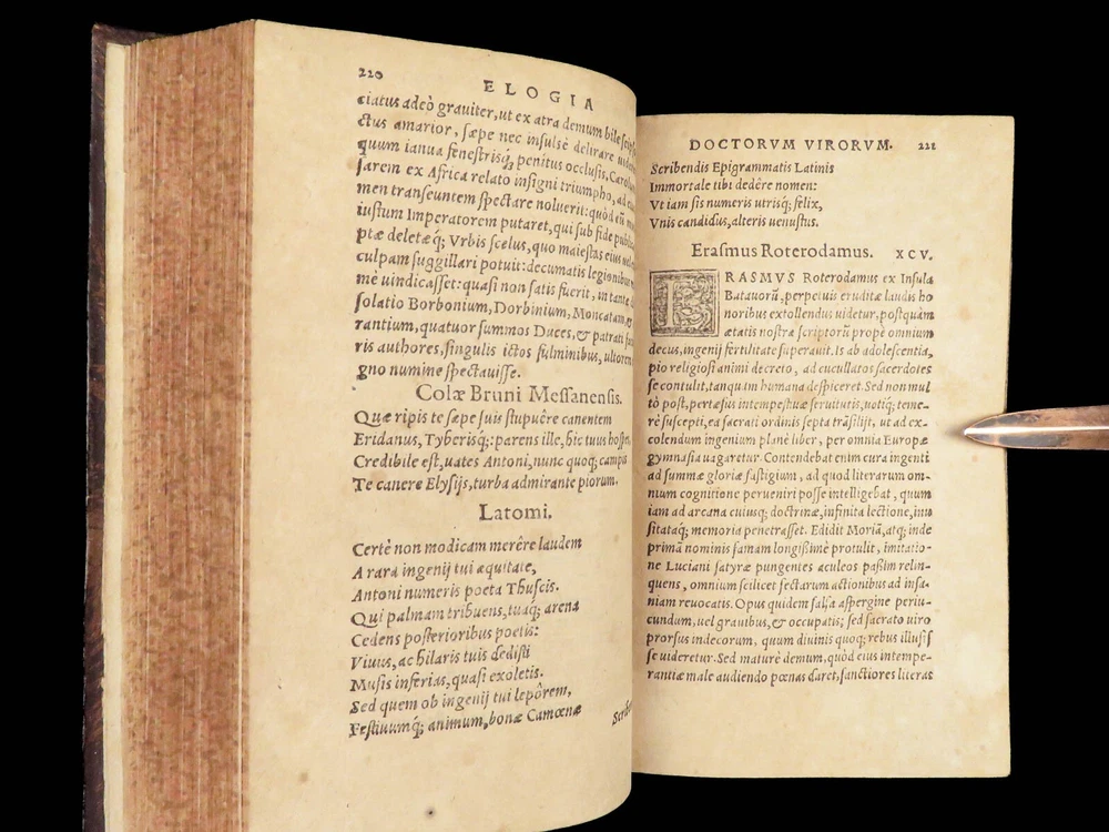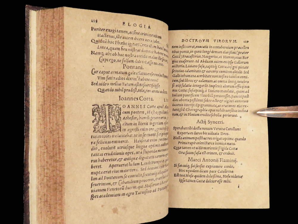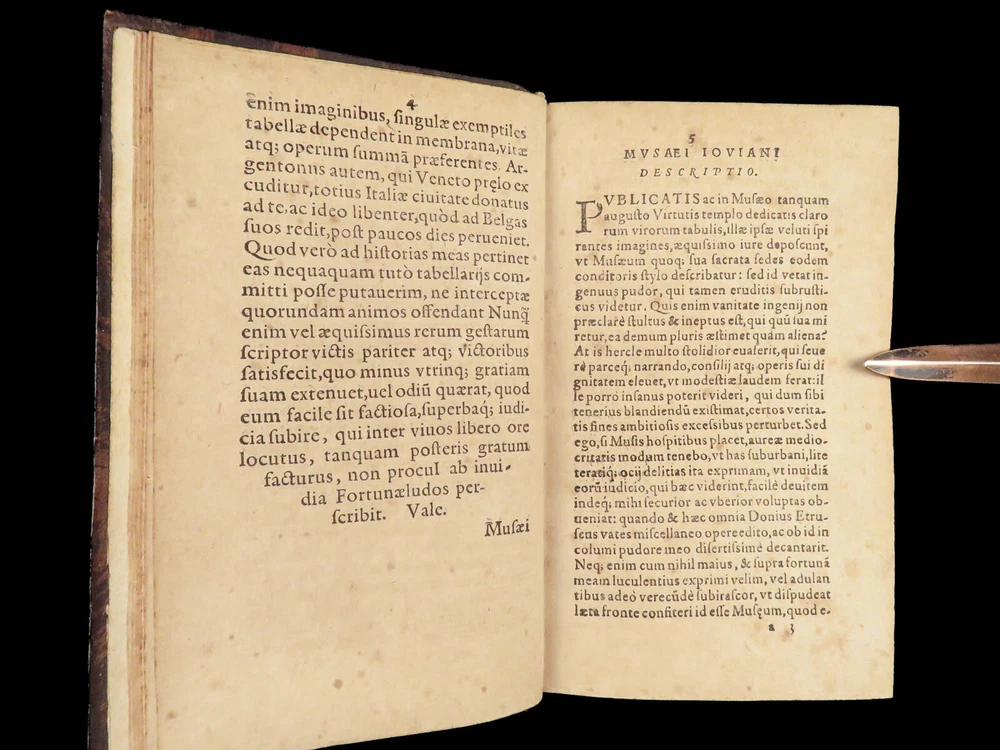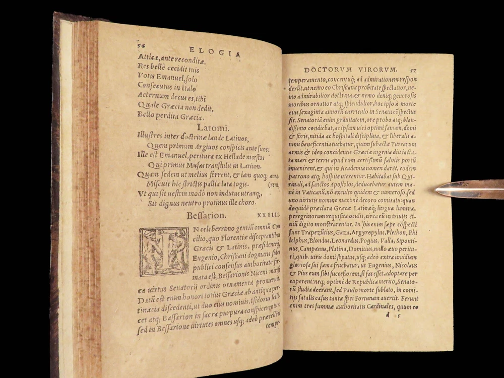 1571 Paolo Giovio Biographies of Alexander the Great Columbus Cortez Charlemagne Paolo Giovio’s “ Eulogies of Men ” is a mid-16 th -century collection of biographies and histories of politicians, explorers, royals, and military heroes. Translated and edited by Johannes Latomus, this 1571 printing includes biographies of figures such as: · Alexander the Great · Christopher Columbus · Ludovico Sforza · Romulus · Hernando Cortez · Charlemagne Item number: #28448 Price: $995 GIOVIO, Paolo Elogia doctorum virorum ingenii monumentis illustrium Basileae: [Petri & Perna], 1571. Details : · Collation: Complete with all pages o Elogia – [16], 312, [8] o Comensis – 592 (i.e., 590), [16] § Includes separate title page · References: USTC 607333; Adams G 642 (Turin ed) · Language: Latin · Binding: Leather; tight and secure · Size: ~6.5in X 4in (16cm x 10cm) Our Guarantee: Very Fast. Very Safe. Free Shipping Worldwide. Customer satisfaction is our priority! Notify us with 7 days of receiving, and we will offer a full refund without reservation!