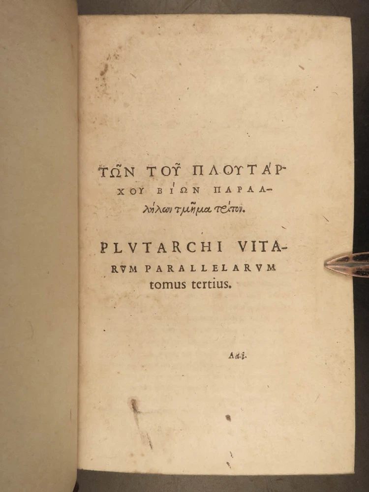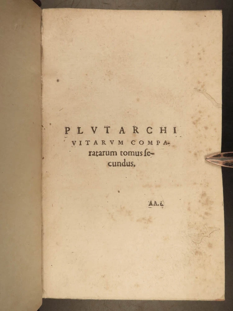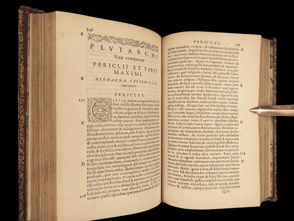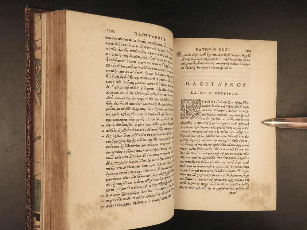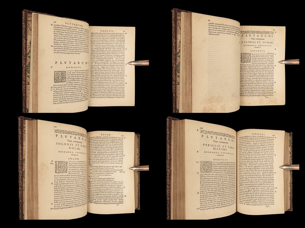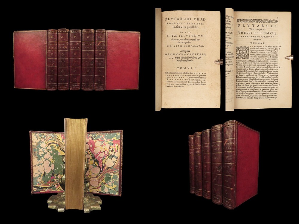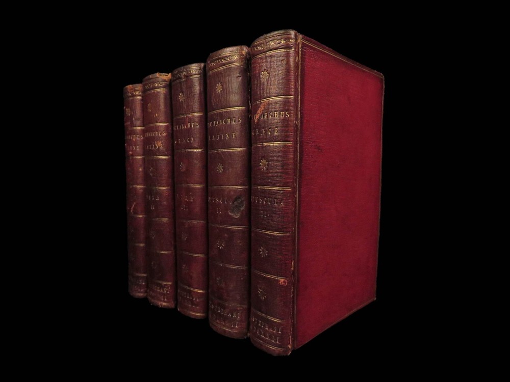 1572 PLUTARCH Parallel Lives Latin & GREEK Alexander Great 5v FAMED Estienne “The mind is not a vessel to be filled, but a fire to be kindled.” ― Plutarch ‘ Plutarch’s Lives’ or ‘ Parallel Lives’ is one of the most important and comprehensive collection of biographies of famous Greek and Roman figures. Plutarch was not so much focused on providing a historical account of these famous individuals as much as he was seeking to write of the type of person they were and the life in which they lived. He focuses on Alexander the Great, Romulus and Remus, Demosthenes, Cicero, Brutus, Julius Caesar, and many other important figures. This rare undated 16 th -century edition was edited and translated by Wilhelm Xylander, a notable German scholar and published by the famed Henri Estienne . Xylander was well known for his commentary and edits of Greek and Roman masters found in these volumes including Fabius Maximus, Timoleon, Pelopidas, and many others. Item number: #25060 Price: $1500 PLUTARCH Plutarchi Chaeronensis summi philosophi et historici Vitæ parallelæ seu comparatæ Geneva: Henri Estienne, [1572]. Details : · Collation: Complete with all pages; 5 volumes o Latine Vitae, Vol. I – 16, 506 o Latine Vitae, Vol. II – [2], 3-552 o Latine Opuscula, Vol. II – 683, [1] o Graece Vitae, Vol. III – [2], 1219-1923 o Graece Opuscula, Vol. II – [2], 781-1381, [1] · References: USTC 684412 · Language: Latin / Greek · Binding: Leather; tight and secure o Red Moroccan leather · Size : ~6.75in X 4.5in (17cm x 11cm) · Rare and desirable Our Guarantee: Very Fast. Very Safe. Free Shipping Worldwide. Customer satisfaction is our priority! Notify us with 7 days of receiving, and we will offer a full refund without reservation! 25060