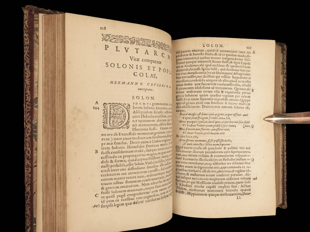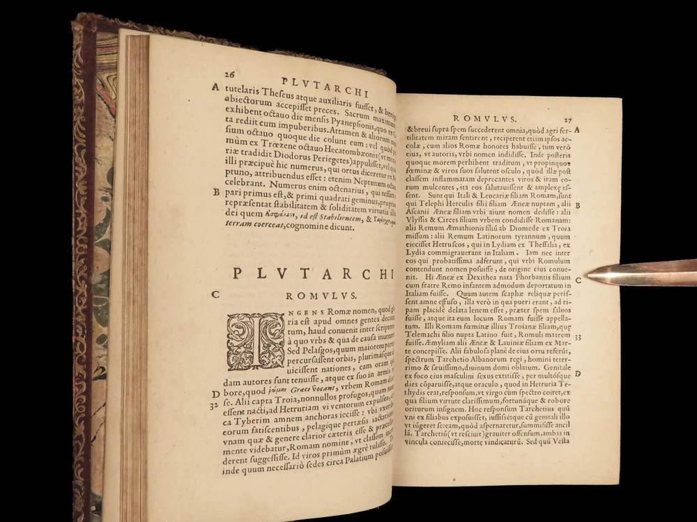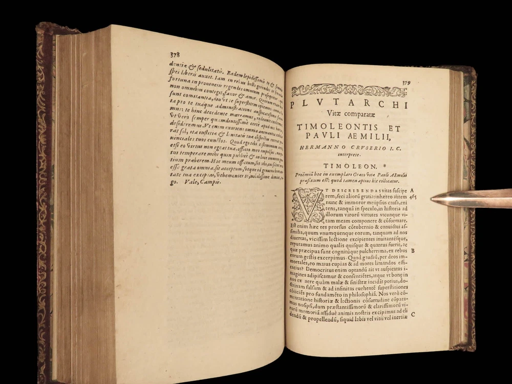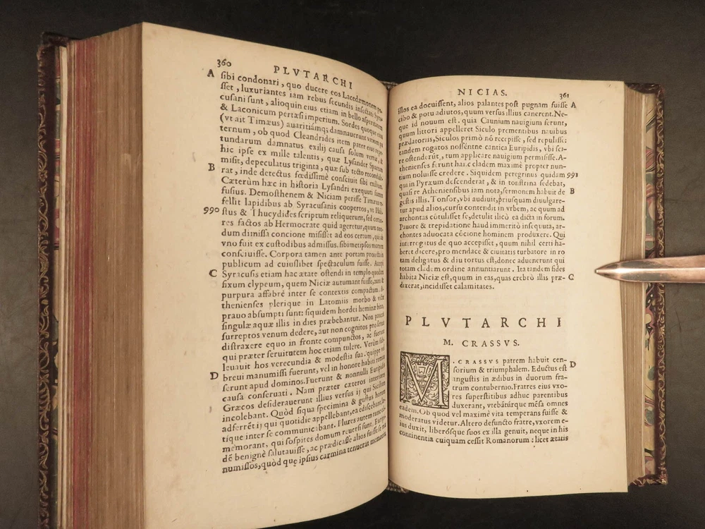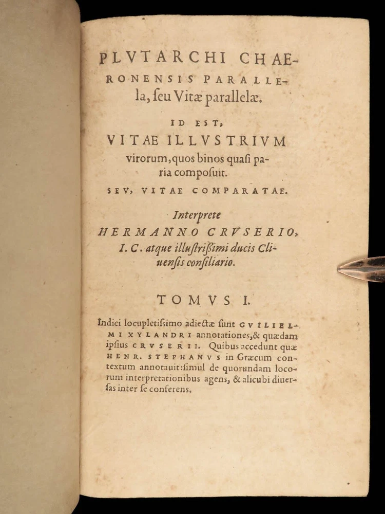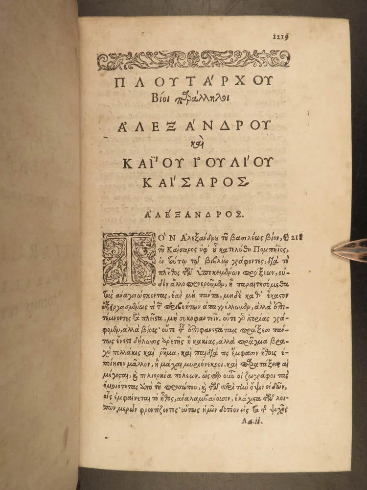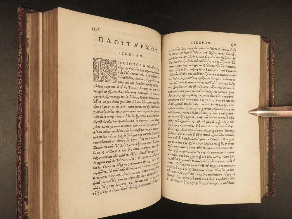 1572 PLUTARCH Parallel Lives Latin & GREEK Alexander Great 5v FAMED Estienne “The mind is not a vessel to be filled, but a fire to be kindled.” ― Plutarch ‘ Plutarch’s Lives’ or ‘ Parallel Lives’ is one of the most important and comprehensive collection of biographies of famous Greek and Roman figures. Plutarch was not so much focused on providing a historical account of these famous individuals as much as he was seeking to write of the type of person they were and the life in which they lived. He focuses on Alexander the Great, Romulus and Remus, Demosthenes, Cicero, Brutus, Julius Caesar, and many other important figures. This rare undated 16 th -century edition was edited and translated by Wilhelm Xylander, a notable German scholar and published by the famed Henri Estienne . Xylander was well known for his commentary and edits of Greek and Roman masters found in these volumes including Fabius Maximus, Timoleon, Pelopidas, and many others. Item number: #25060 Price: $1500 PLUTARCH Plutarchi Chaeronensis summi philosophi et historici Vitæ parallelæ seu comparatæ Geneva: Henri Estienne, [1572]. Details : · Collation: Complete with all pages; 5 volumes o Latine Vitae, Vol. I – 16, 506 o Latine Vitae, Vol. II – [2], 3-552 o Latine Opuscula, Vol. II – 683, [1] o Graece Vitae, Vol. III – [2], 1219-1923 o Graece Opuscula, Vol. II – [2], 781-1381, [1] · References: USTC 684412 · Language: Latin / Greek · Binding: Leather; tight and secure o Red Moroccan leather · Size : ~6.75in X 4.5in (17cm x 11cm) · Rare and desirable Our Guarantee: Very Fast. Very Safe. Free Shipping Worldwide. Customer satisfaction is our priority! Notify us with 7 days of receiving, and we will offer a full refund without reservation! 25060