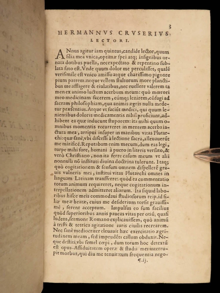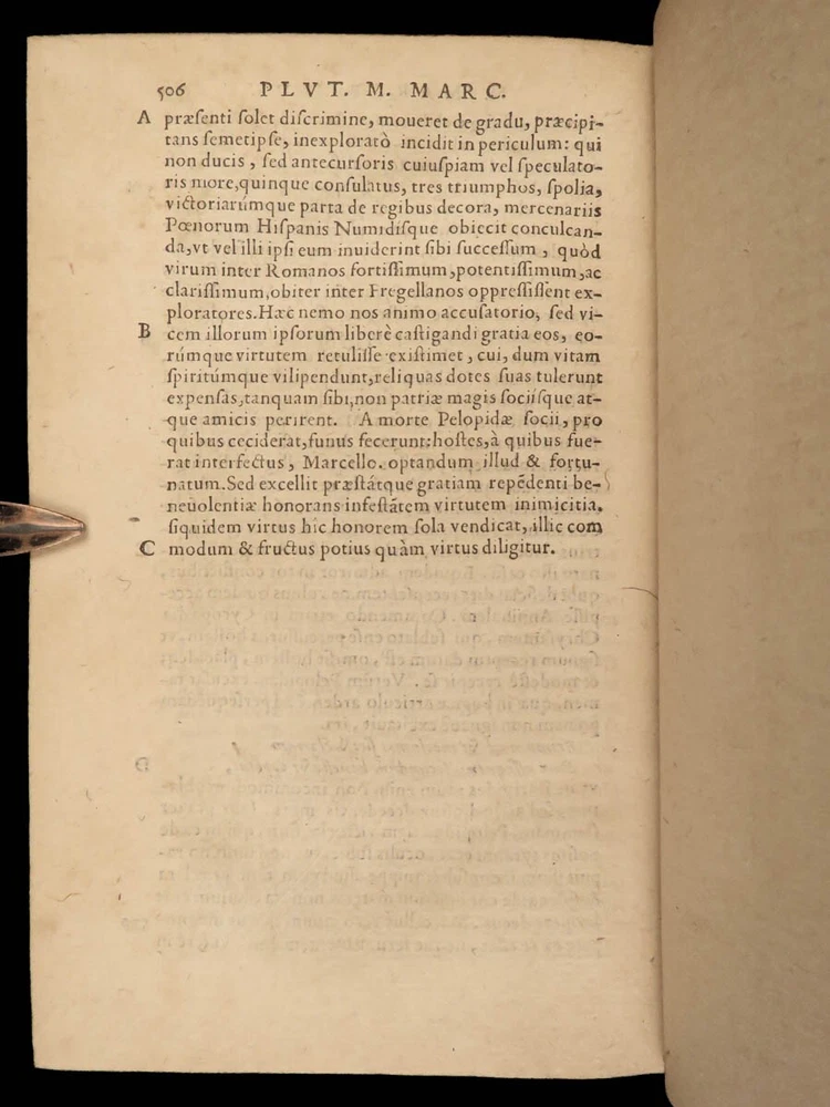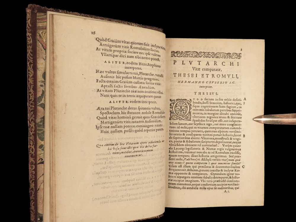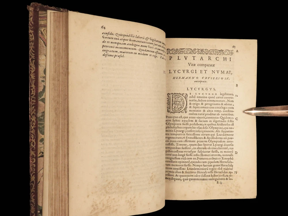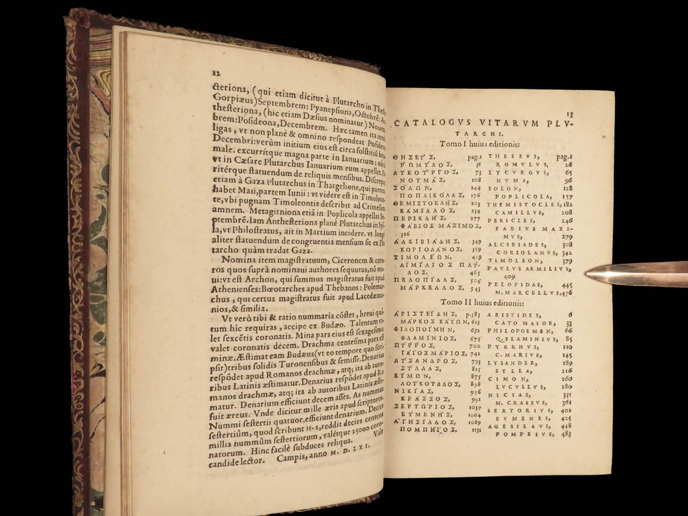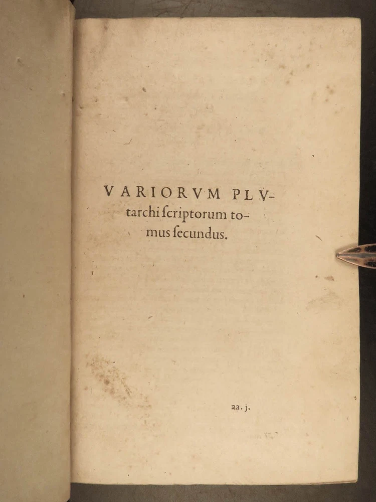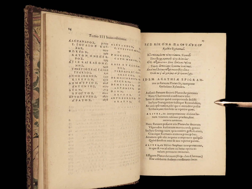 1572 PLUTARCH Parallel Lives Latin & GREEK Alexander Great 5v FAMED Estienne “The mind is not a vessel to be filled, but a fire to be kindled.” ― Plutarch ‘ Plutarch’s Lives’ or ‘ Parallel Lives’ is one of the most important and comprehensive collection of biographies of famous Greek and Roman figures. Plutarch was not so much focused on providing a historical account of these famous individuals as much as he was seeking to write of the type of person they were and the life in which they lived. He focuses on Alexander the Great, Romulus and Remus, Demosthenes, Cicero, Brutus, Julius Caesar, and many other important figures. This rare undated 16 th -century edition was edited and translated by Wilhelm Xylander, a notable German scholar and published by the famed Henri Estienne . Xylander was well known for his commentary and edits of Greek and Roman masters found in these volumes including Fabius Maximus, Timoleon, Pelopidas, and many others. Item number: #25060 Price: $1500 PLUTARCH Plutarchi Chaeronensis summi philosophi et historici Vitæ parallelæ seu comparatæ Geneva: Henri Estienne, [1572]. Details : · Collation: Complete with all pages; 5 volumes o Latine Vitae, Vol. I – 16, 506 o Latine Vitae, Vol. II – [2], 3-552 o Latine Opuscula, Vol. II – 683, [1] o Graece Vitae, Vol. III – [2], 1219-1923 o Graece Opuscula, Vol. II – [2], 781-1381, [1] · References: USTC 684412 · Language: Latin / Greek · Binding: Leather; tight and secure o Red Moroccan leather · Size : ~6.75in X 4.5in (17cm x 11cm) · Rare and desirable Our Guarantee: Very Fast. Very Safe. Free Shipping Worldwide. Customer satisfaction is our priority! Notify us with 7 days of receiving, and we will offer a full refund without reservation! 25060