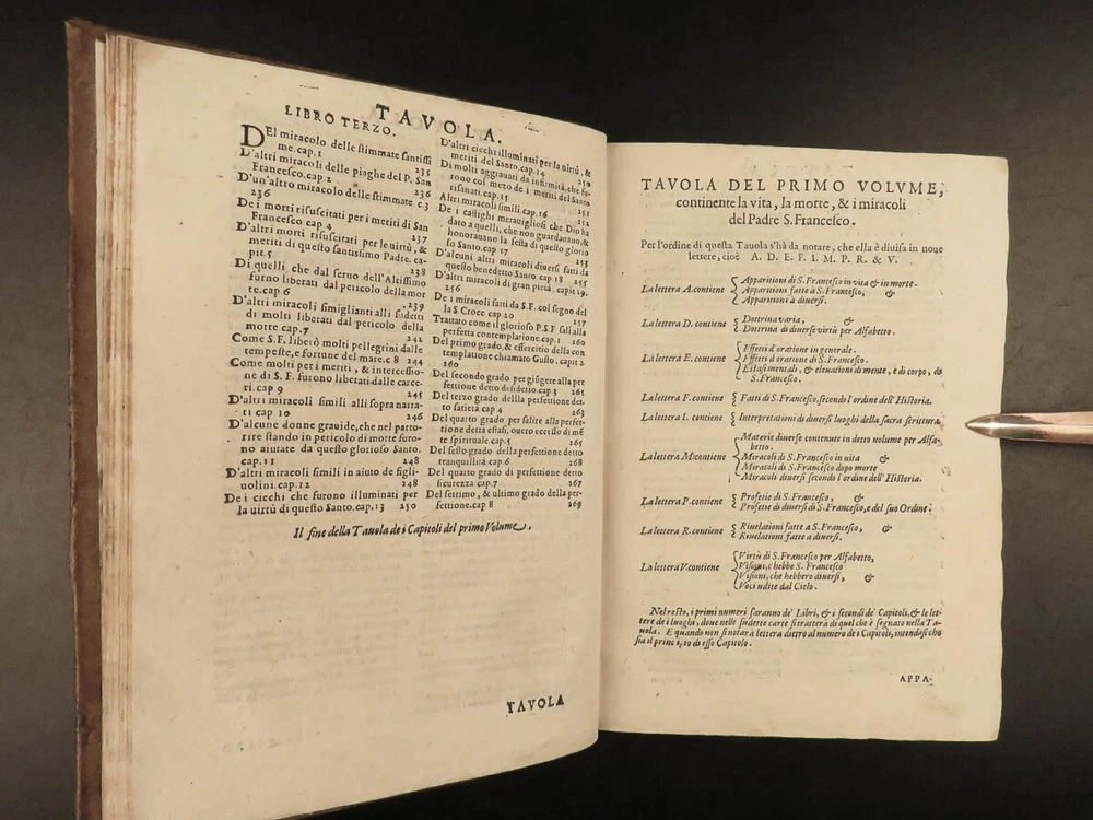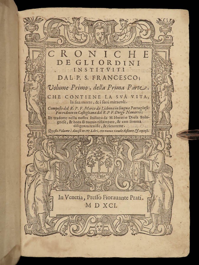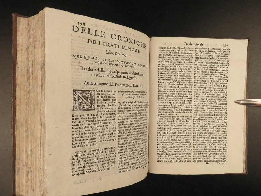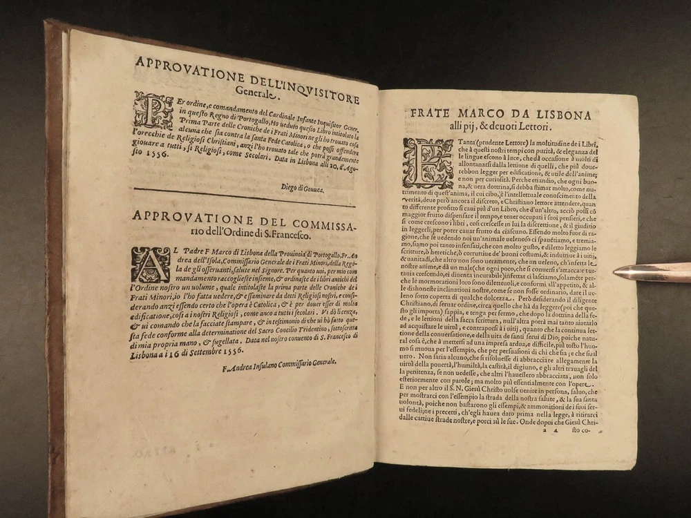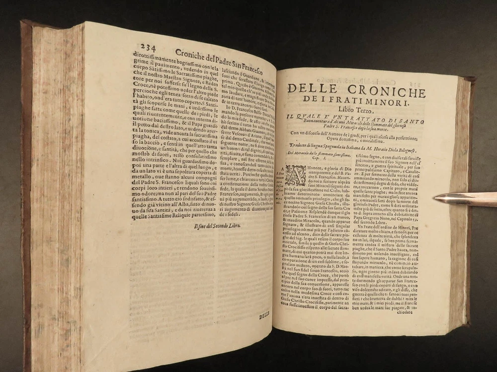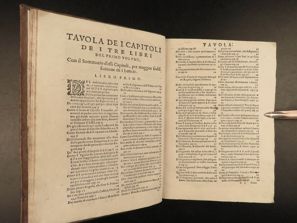 1590 Mark of Lisbon Silva FRANCISCAN Chronicle Friars Portugal Venice MONASTIC Mark of Lisbon, or ‘da Silva’, was a 16 th -century Portuguese historian and bishop who was known for his contributions to the history and development of the Franciscan order. His most important book on the subject was ‘ Chronicle of the Minor Friars’ – a collection of documents from the 15 th -century pertaining to the Franciscan Order. The work is mostly a series of biographical sketches of the men of the most illustrious men from that era of monastics including descriptions of friars such as Giovanna da Citina, Bartolomeo da Pisa, Beato Tomaso, Roberto Malatesta, Alberto da Sartiano, and many others. Item number: #24171 Price: $1500 MARCOS, of Lisboa [da Silva] Delle croniche de' frati minori del serafico p. san Francesco; parte seconda, divisa in dieci libri; ne quali si descrivono le vite e miracoli di ducento e più santi e sante In Venetia: Presso Erasmo Viotti, 1590-91. Details : · Collation: Complete with all pages; 3 volumes o Vol. 1 – in two parts § Part I – [48], 269, § Part II – [16], 207, [1] o Vol. 2 – [60], 628 o Vol. 3 – [86], 348 leaves · References: USTC 840743 · Language: Italian · Binding: Leather; tight and secure · Size : ~8.5in X 6.25in (21.5cm x 16cm) · VERY rare and desirable Our Guarantee: Very Fast. Very Safe. Free Shipping Worldwide. Customer satisfaction is our priority! Notify us with 7 days of receiving, and we will offer a full refund without reservation! 24171