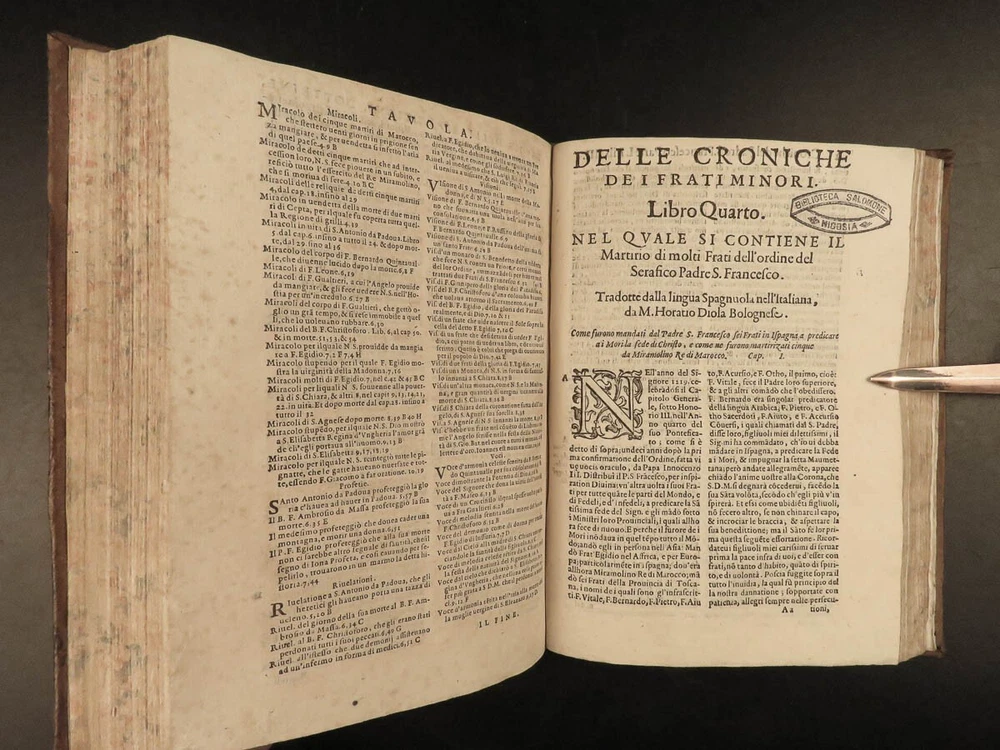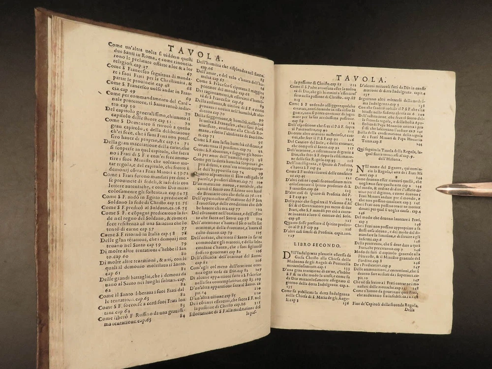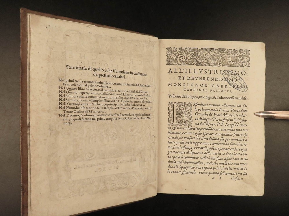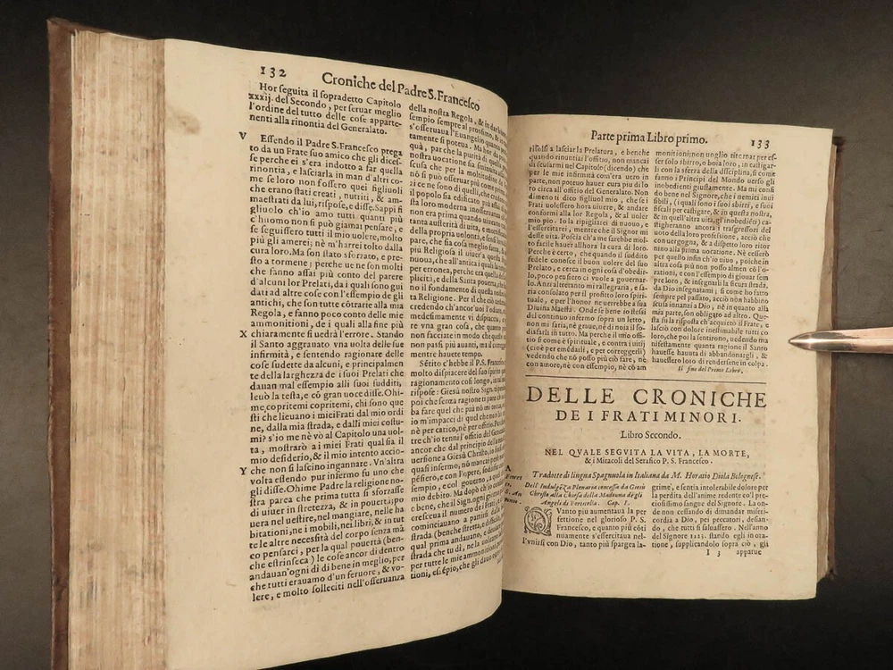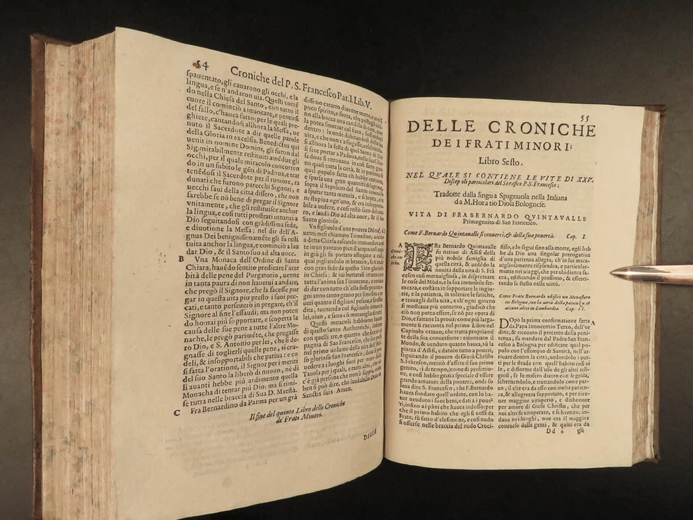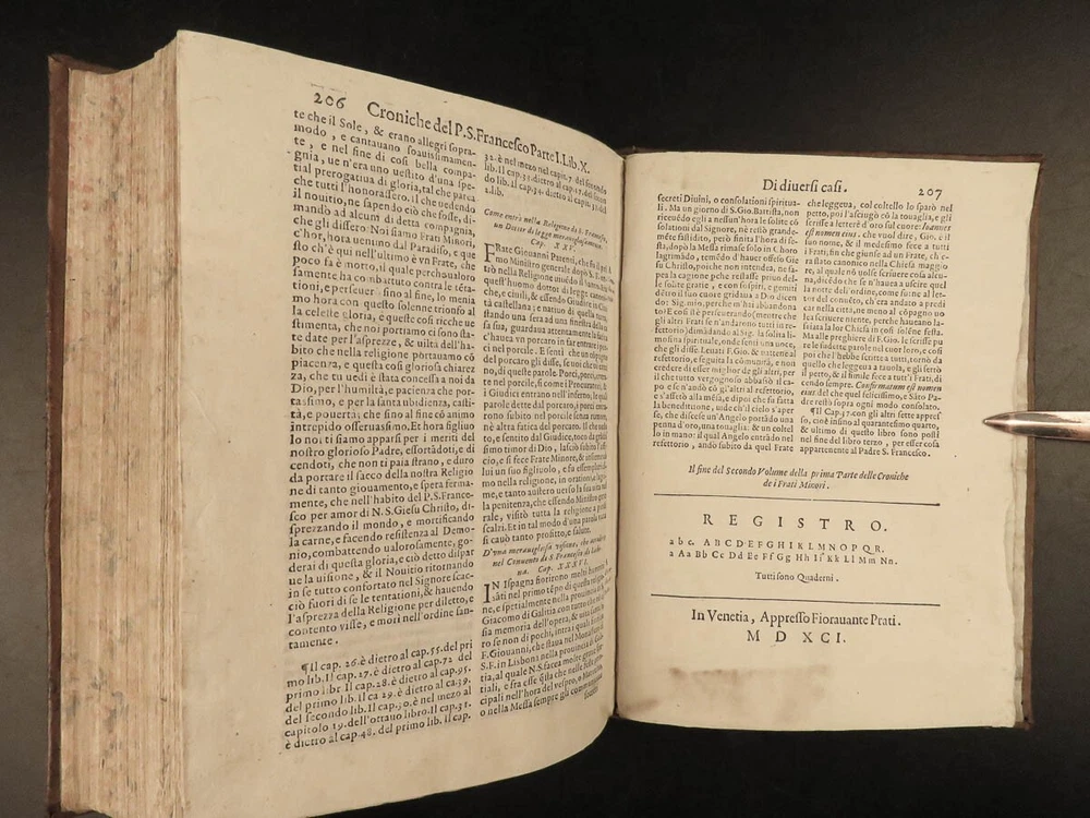 1590 Mark of Lisbon Silva FRANCISCAN Chronicle Friars Portugal Venice MONASTIC Mark of Lisbon, or ‘da Silva’, was a 16 th -century Portuguese historian and bishop who was known for his contributions to the history and development of the Franciscan order. His most important book on the subject was ‘ Chronicle of the Minor Friars’ – a collection of documents from the 15 th -century pertaining to the Franciscan Order. The work is mostly a series of biographical sketches of the men of the most illustrious men from that era of monastics including descriptions of friars such as Giovanna da Citina, Bartolomeo da Pisa, Beato Tomaso, Roberto Malatesta, Alberto da Sartiano, and many others. Item number: #24171 Price: $1500 MARCOS, of Lisboa [da Silva] Delle croniche de' frati minori del serafico p. san Francesco; parte seconda, divisa in dieci libri; ne quali si descrivono le vite e miracoli di ducento e più santi e sante In Venetia: Presso Erasmo Viotti, 1590-91. Details : · Collation: Complete with all pages; 3 volumes o Vol. 1 – in two parts § Part I – [48], 269, § Part II – [16], 207, [1] o Vol. 2 – [60], 628 o Vol. 3 – [86], 348 leaves · References: USTC 840743 · Language: Italian · Binding: Leather; tight and secure · Size : ~8.5in X 6.25in (21.5cm x 16cm) · VERY rare and desirable Our Guarantee: Very Fast. Very Safe. Free Shipping Worldwide. Customer satisfaction is our priority! Notify us with 7 days of receiving, and we will offer a full refund without reservation! 24171