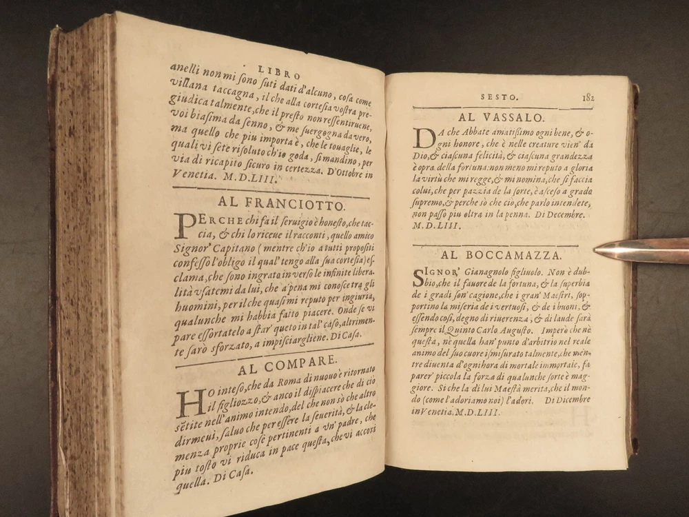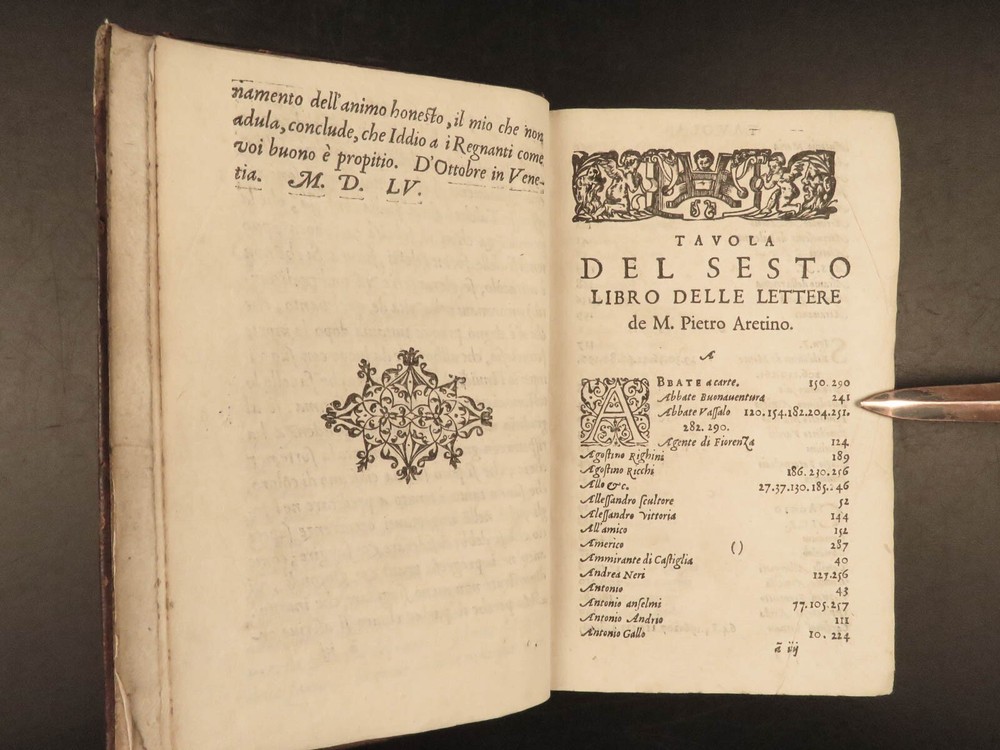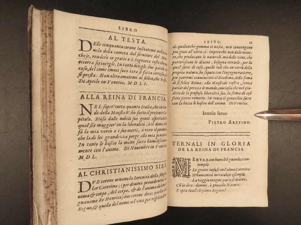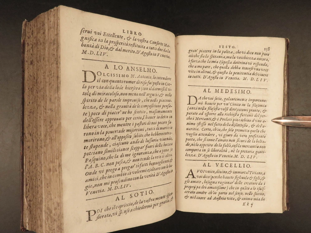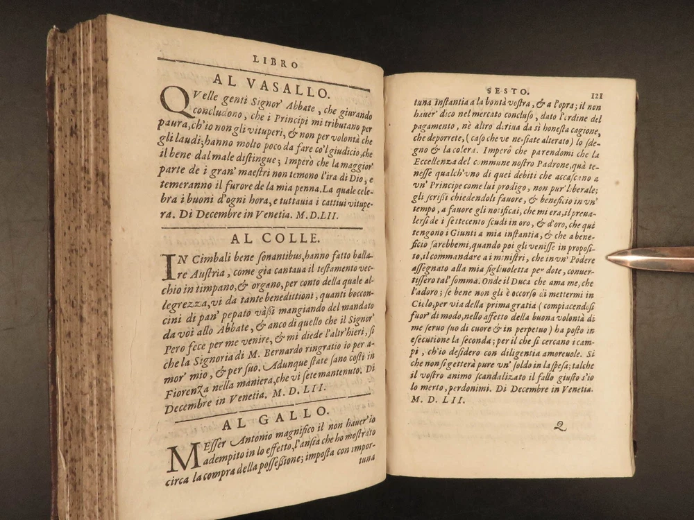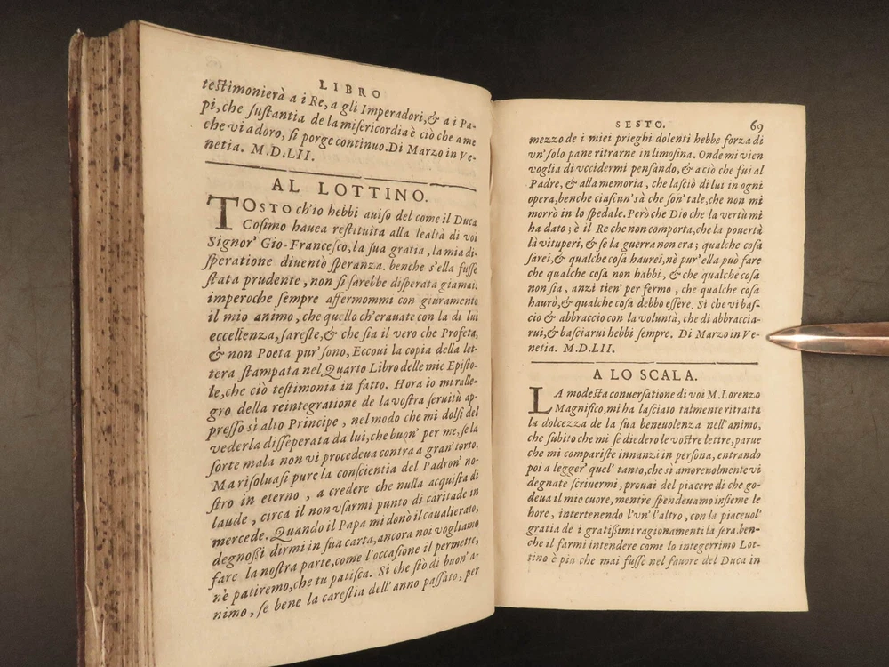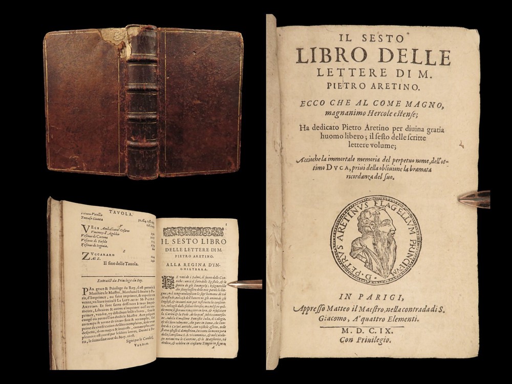 1609 Letters of Pietro Aretino 1 ed Erotic Italian Art SECRETS Controversy Paris Pietro Aretino was a 16 th -century Italian author who is best remembered for his exceptional collection of letters. Many of these letters were quite controversial – including highly racy and unsettling material. Much of this correspondence was with iconic artists, politicians, and churchmen, many of which are erotic responses to Italian art. (Kren) Item number: #25429 Price: $499 ARETINO, Pietro Lettere di M. Pietro Aretino. Parigi [Paris]: Matteo il Maestro, 1609. First collected edition. Details : · Collation: Complete with all pages; o [8], 301 leaves · References: Kren, The Renaissance Nude , p.11 · Language: Italian · Binding: Leather; tight and secure · Size: ~6.5in X 4.25in (16.5cm x 11cm) Our Guarantee: Very Fast. Very Safe. Free Shipping Worldwide. Customer satisfaction is our priority! Notify us with 7 days of receiving, and we will offer a full refund without reservation! 25429