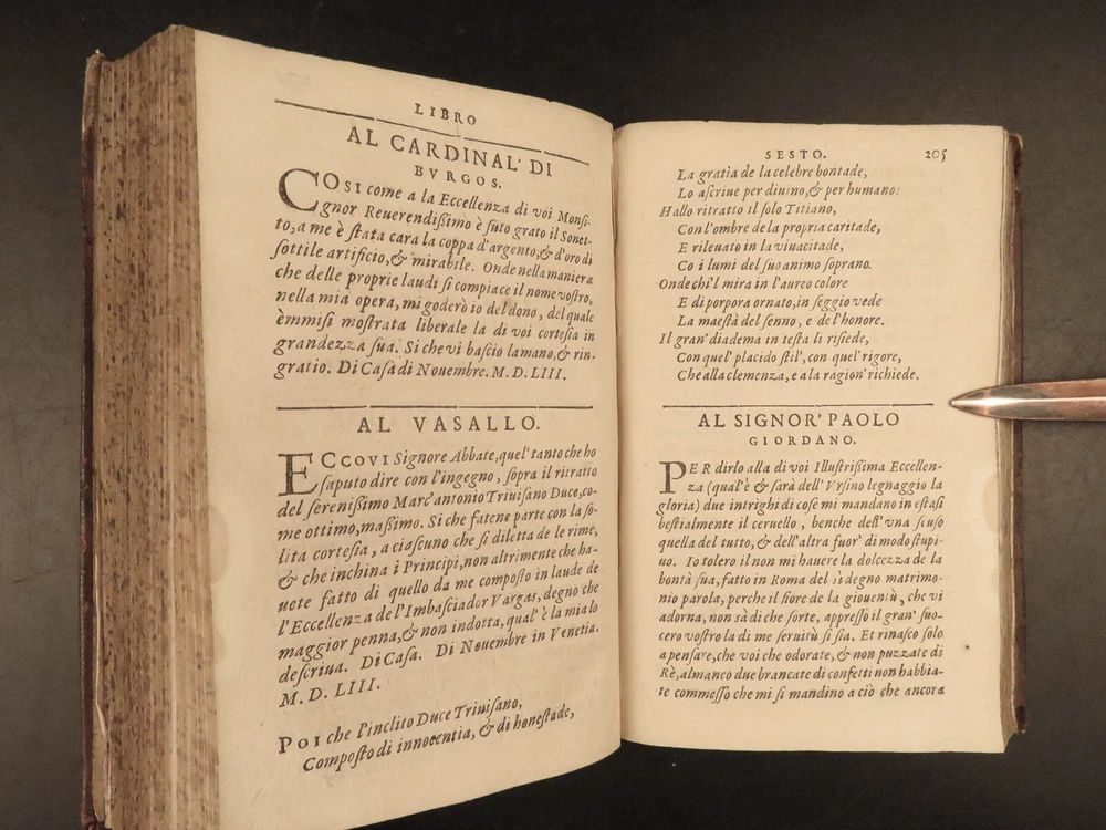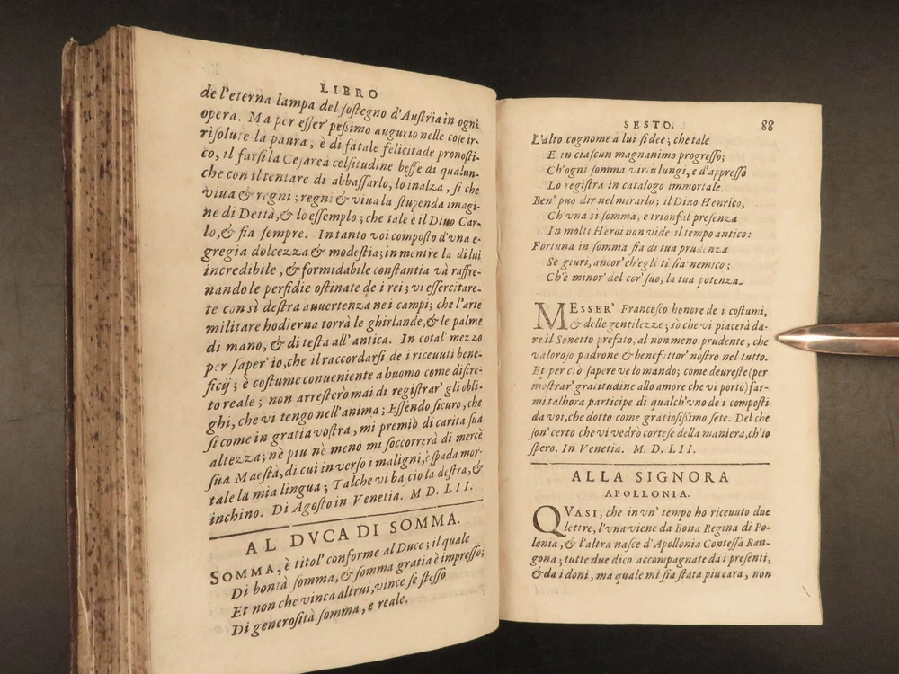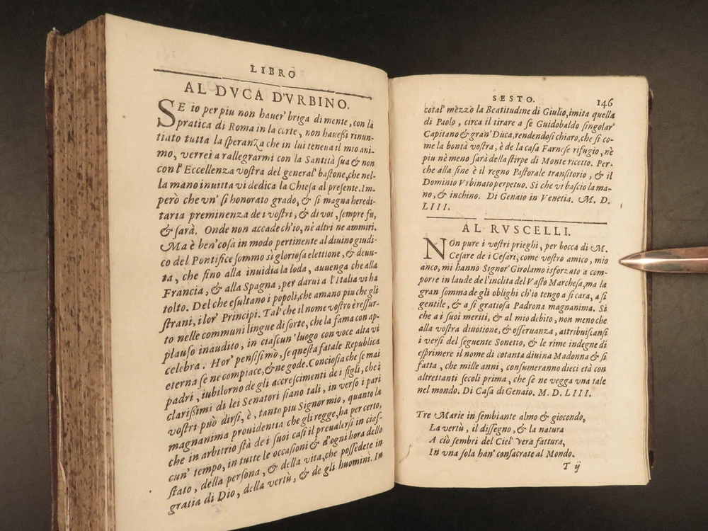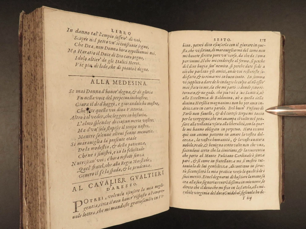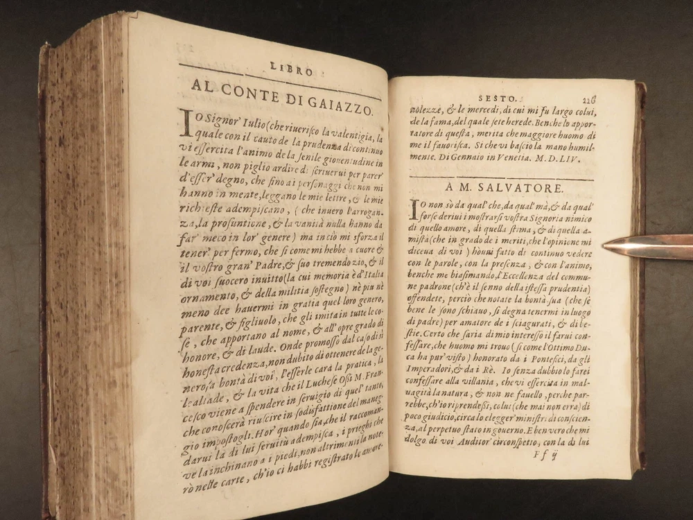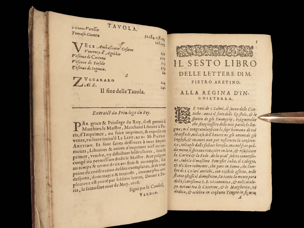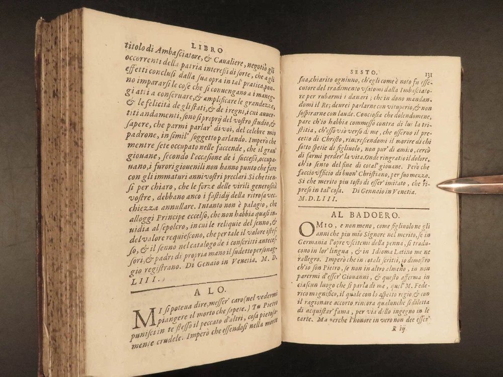 1609 Letters of Pietro Aretino 1 ed Erotic Italian Art SECRETS Controversy Paris Pietro Aretino was a 16 th -century Italian author who is best remembered for his exceptional collection of letters. Many of these letters were quite controversial – including highly racy and unsettling material. Much of this correspondence was with iconic artists, politicians, and churchmen, many of which are erotic responses to Italian art. (Kren) Item number: #25429 Price: $499 ARETINO, Pietro Lettere di M. Pietro Aretino. Parigi [Paris]: Matteo il Maestro, 1609. First collected edition. Details : · Collation: Complete with all pages; o [8], 301 leaves · References: Kren, The Renaissance Nude , p.11 · Language: Italian · Binding: Leather; tight and secure · Size: ~6.5in X 4.25in (16.5cm x 11cm) Our Guarantee: Very Fast. Very Safe. Free Shipping Worldwide. Customer satisfaction is our priority! Notify us with 7 days of receiving, and we will offer a full refund without reservation! 25429
