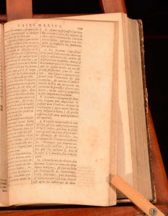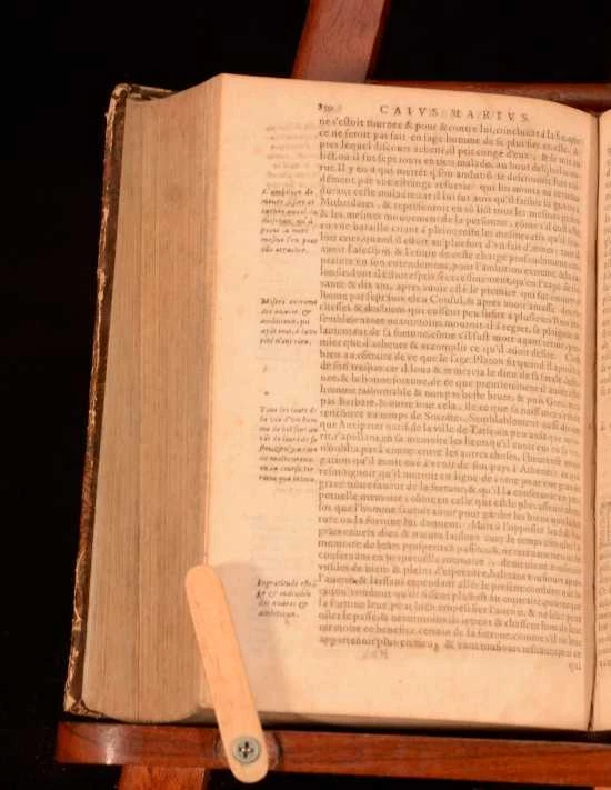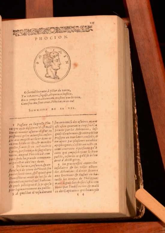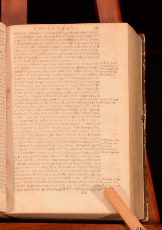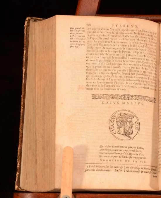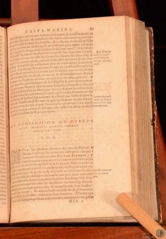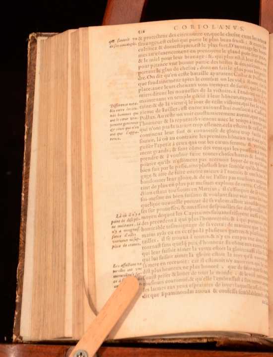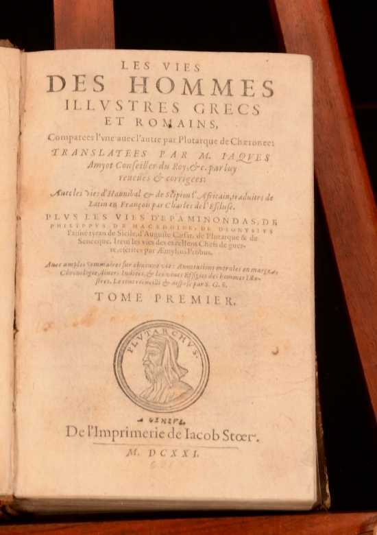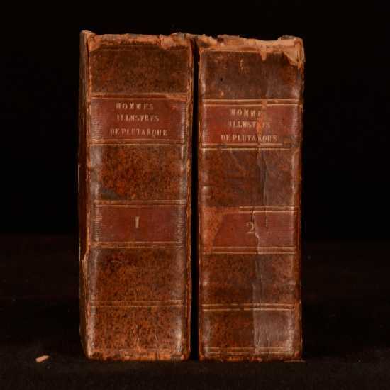 Click here to see our other books! Les Vies Des Hommes Illustres Grecs et Romains, Comparees l'une avec L'autre par Plutarque de Chaeronee Plutarch; Jacques 1621 Jacob Stoer : Geneve 7.5" by 4.5" [28], 1181, [45]; 1294, [26pp] SUMMARY A complete French set of Plutarch's noted collection of biographies on Greek and Roman men. Leather Binding Overall Condition: Good This book weighs 4 KG when packed UK Postage: £ 4.49 US Postage: £ 39.99 EU Postage : £ 26.99 European Postage: £ 36.99 Asia Postage: £ 65.99 Worldwide Postage: £ 99.99 DESCRIPTION Complete in two volumes. In French. Plutarch's 'Lives of the Noble Greeks and Roman's, commonly called Parallel Lives or Plutarch's Lives, is a series of biographies of famous men written in the late 1st century. The surviving Parallel Lives contain twenty-three pairs of biographies, each pair consisting of one Greek and one Roman, and additional single lives. It is a work of considerable importance, not only as a source of information about the individuals mentioned, but also about the times in which they lived. CONDITION In quarter calf bindings with paper covered boards. Externally, a trifle rubbed with some bumping. joints starting. Wear to head and tail of spine. Bookplate to front free-endpaper. Internally, generally firmly bound. Pages bright with spotting throughout. Overall Condition: Good GLOSSARY OF TERMS Overall Condition (Dustwrapper condition rating is shown after that for the book itself, where a dustwrapper is present) Fine - Very well preserved copy showing very little wear Very Good Indeed - Only one or two minor faults, really a very attractive copy Very Good - Quite a wide term meaning no major faults but probably several smaller ones often expected given the age of the book, but still a respectable copy Good - Meaning not very good. Some more serious faults as will be described in the condition report under 'condition' Good Only - Meaning one or more faults that could really do with repair Fair - As with good only above but with other faults leaving a compromised copy even after repair Poor - Really bad and possibly seriously incomplete. We only sell books in this condition where their rarity or value makes them attractive none the less. Major defects will be described. GUARANTEE We offer a full money back guarantee on our descriptions. Please ask for details and conditions. We prefer PAYPAL. If you pay via PAYPAL we will post the item off the same or the next working day with the postage you have selected. Please note we cannot accept USD cheques