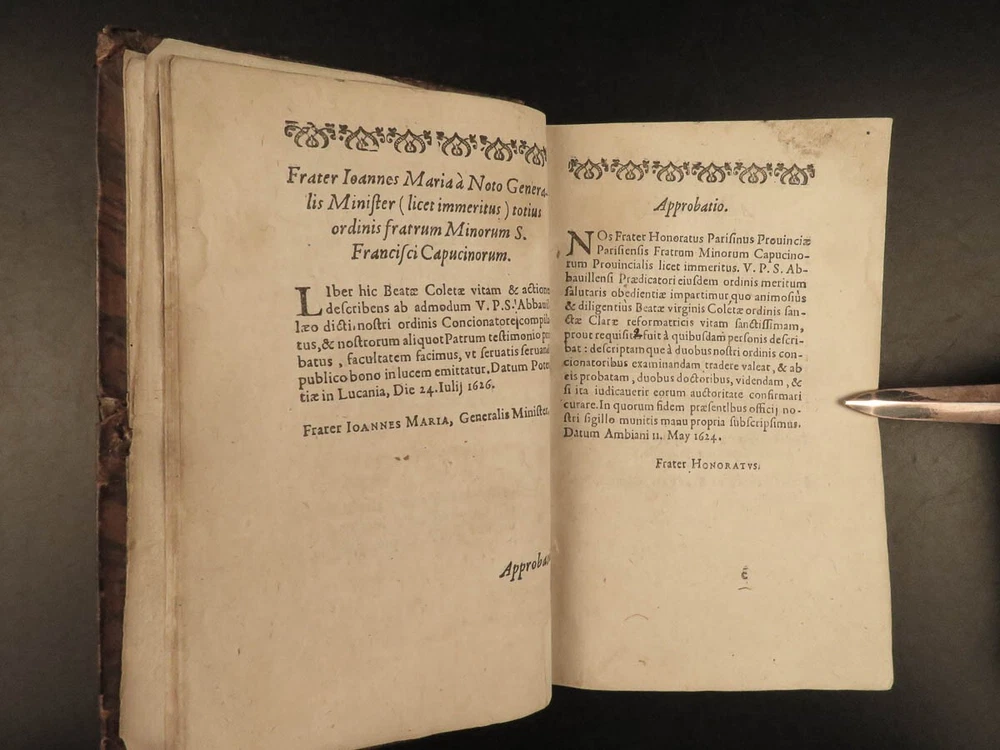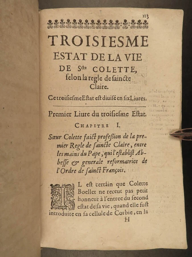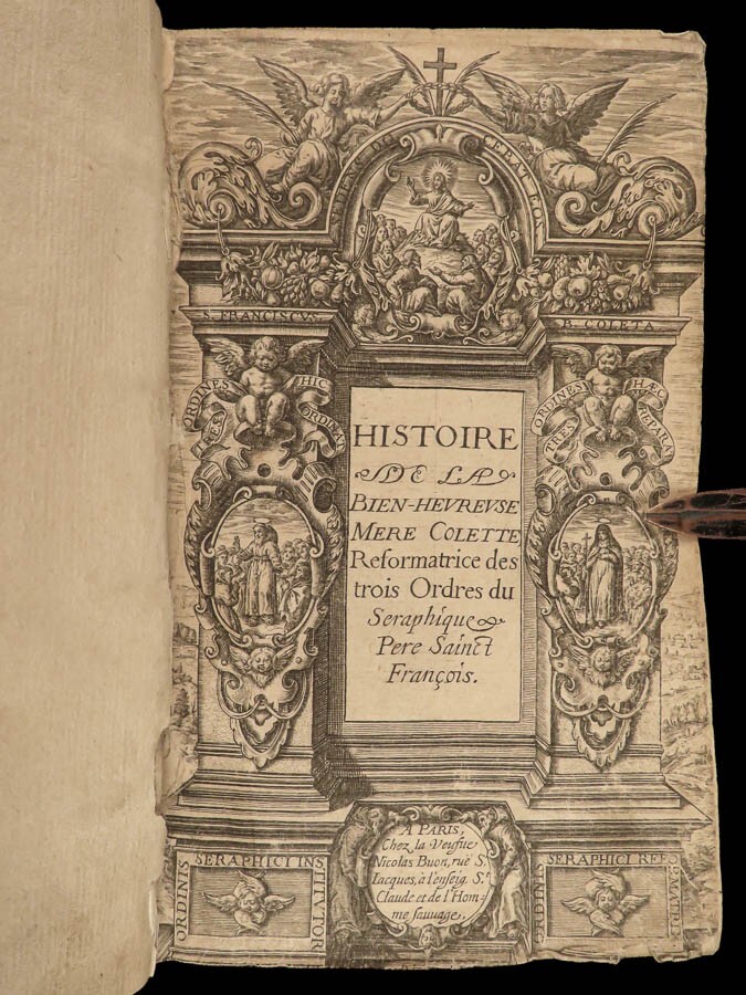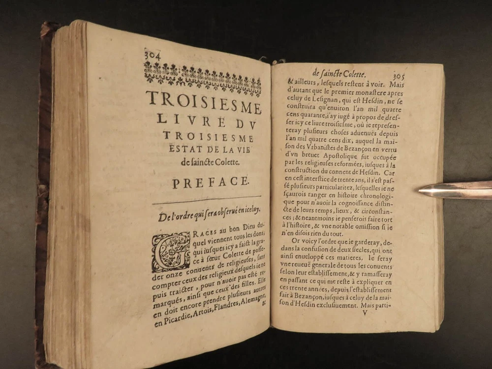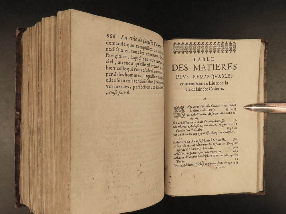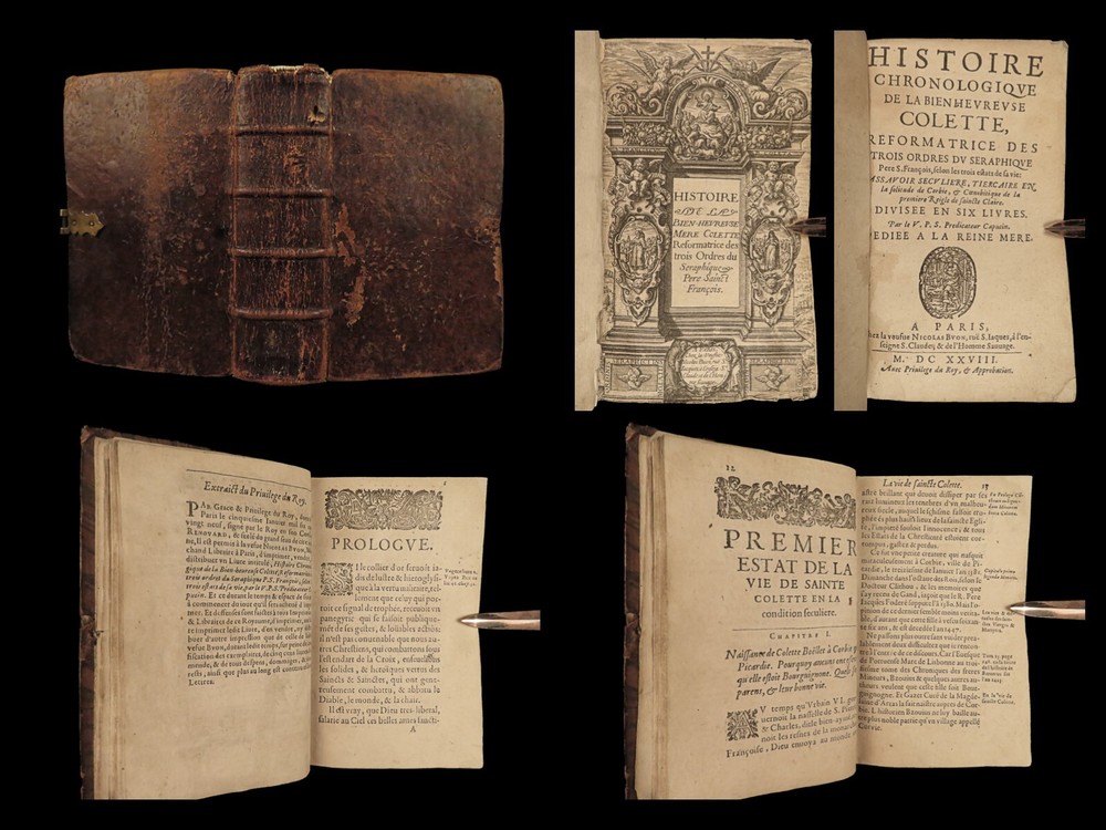 1628 MIRACLES 1 ed Saint Colette PROPHECY Colettine Nuns French Monastics Silvere Colette of Corbie, or Saint Colette, was a 15 th -century French nun who is best known for her intents on helping poor and needy mothers and children. In the 17 th -century French historian Claude Silvere published a thorough account of Saint Colette’s life, prophecies, and her miraculous deeds. One interesting account is of Colette’s prophecy at Bourge Convent, where a sister would fall under a cart and be unharmed. Silvere also describes Colette’s help in providing the nuns in Nièvre with food during a famine. Item number: #24156 Price: $599 SILVERE, Claude Histoire chronologique de la bien heureuse Colette : reformatrice des trois ordres du seraphique pere S. François, selon les trois estats de sa vie Paris: Chez Nicolas Buon, 1628. First edition. Details : · Collation: Complete with all pages o 15, [5], 666, (i.e., 676), [44] · Language: French · Binding: Leather; tight and secure · Size : ~7in X 4.75in (17.5cm x 11.5cm) · Quite rare Our Guarantee: Very Fast. Very Safe. Free Shipping Worldwide. Customer satisfaction is our priority! Notify us with 7 days of receiving, and we will offer a full refund without reservation! 24156