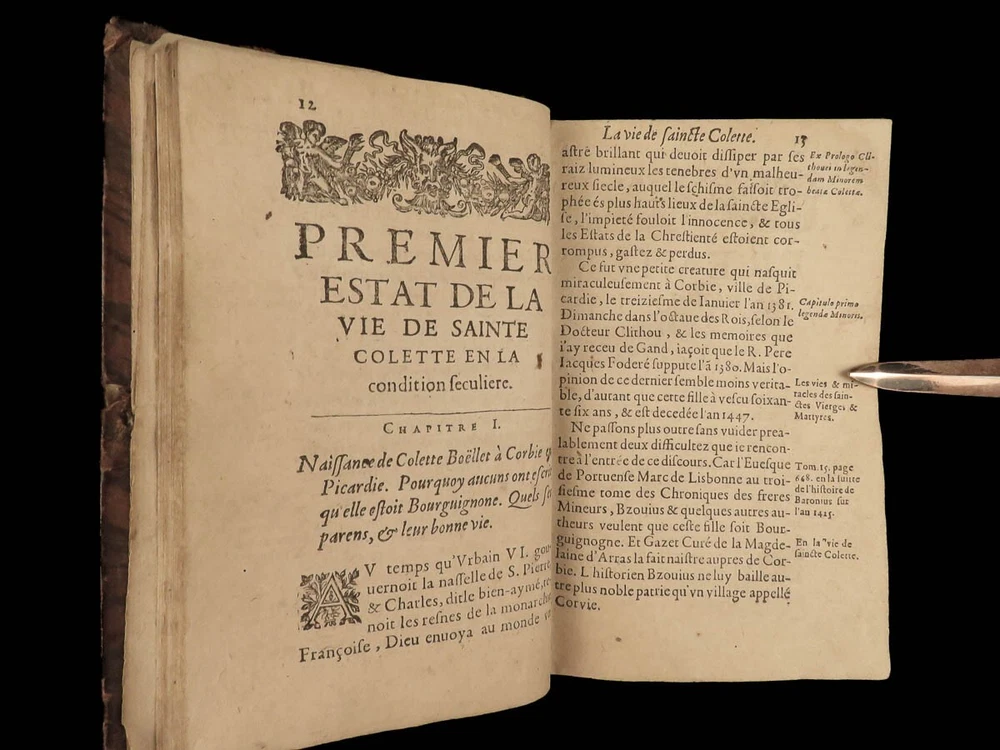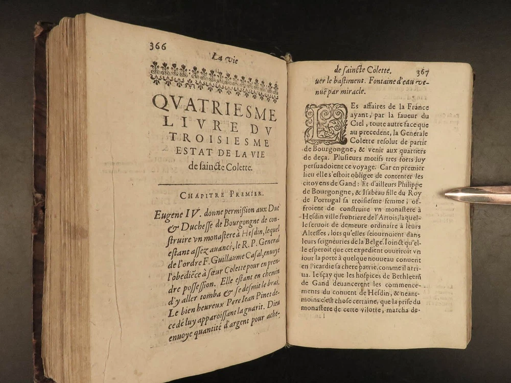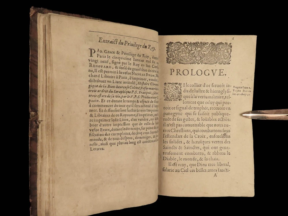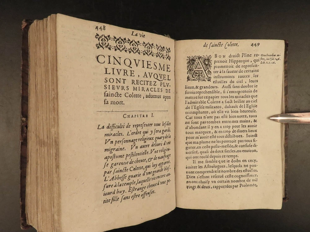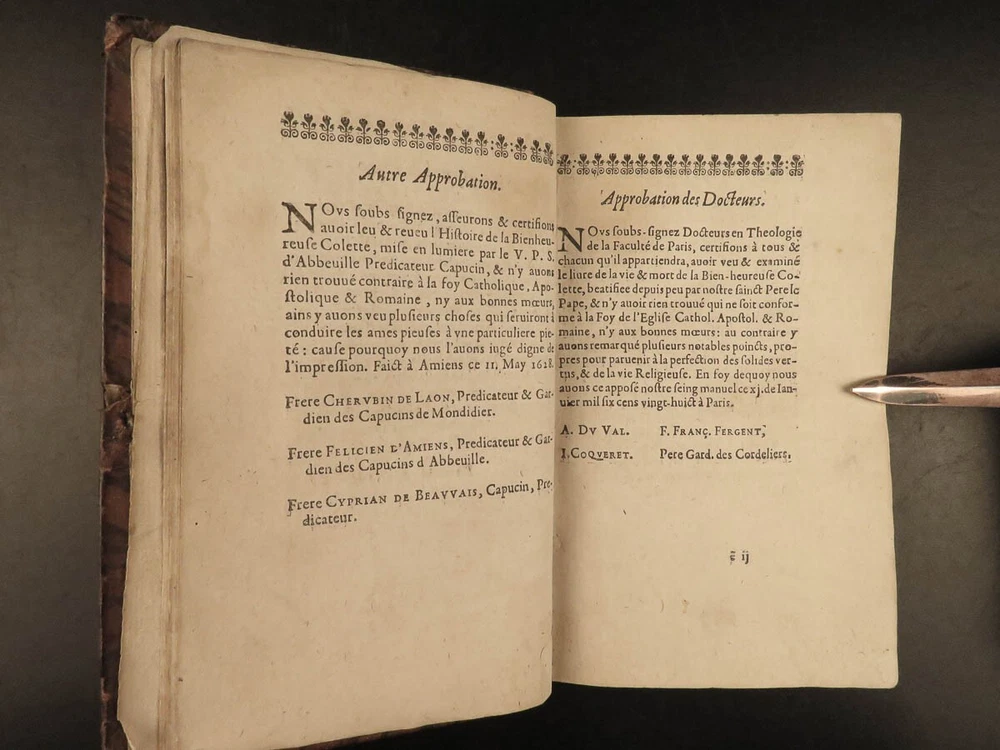 1628 MIRACLES 1 ed Saint Colette PROPHECY Colettine Nuns French Monastics Silvere Colette of Corbie, or Saint Colette, was a 15 th -century French nun who is best known for her intents on helping poor and needy mothers and children. In the 17 th -century French historian Claude Silvere published a thorough account of Saint Colette’s life, prophecies, and her miraculous deeds. One interesting account is of Colette’s prophecy at Bourge Convent, where a sister would fall under a cart and be unharmed. Silvere also describes Colette’s help in providing the nuns in Nièvre with food during a famine. Item number: #24156 Price: $599 SILVERE, Claude Histoire chronologique de la bien heureuse Colette : reformatrice des trois ordres du seraphique pere S. François, selon les trois estats de sa vie Paris: Chez Nicolas Buon, 1628. First edition. Details : · Collation: Complete with all pages o 15, [5], 666, (i.e., 676), [44] · Language: French · Binding: Leather; tight and secure · Size : ~7in X 4.75in (17.5cm x 11.5cm) · Quite rare Our Guarantee: Very Fast. Very Safe. Free Shipping Worldwide. Customer satisfaction is our priority! Notify us with 7 days of receiving, and we will offer a full refund without reservation! 24156