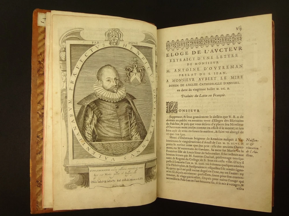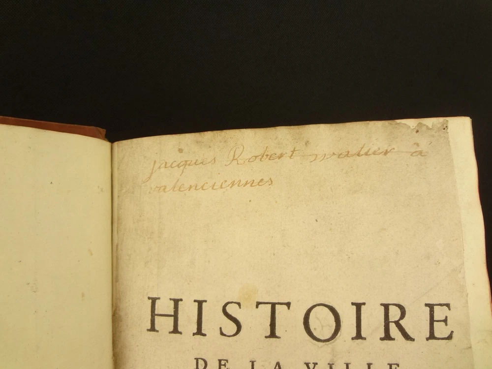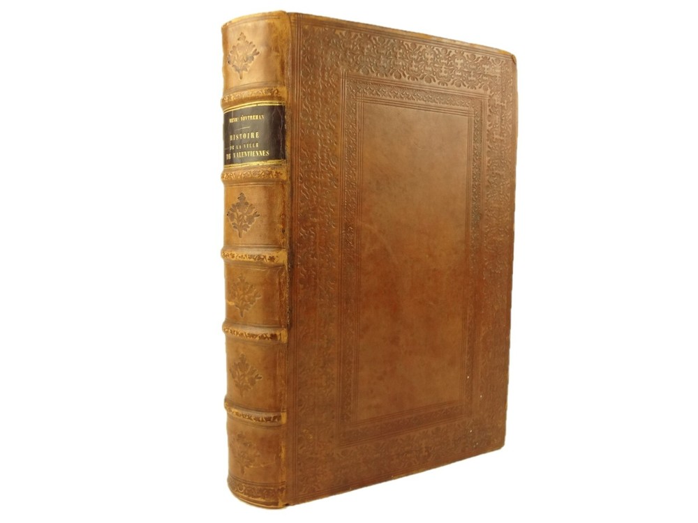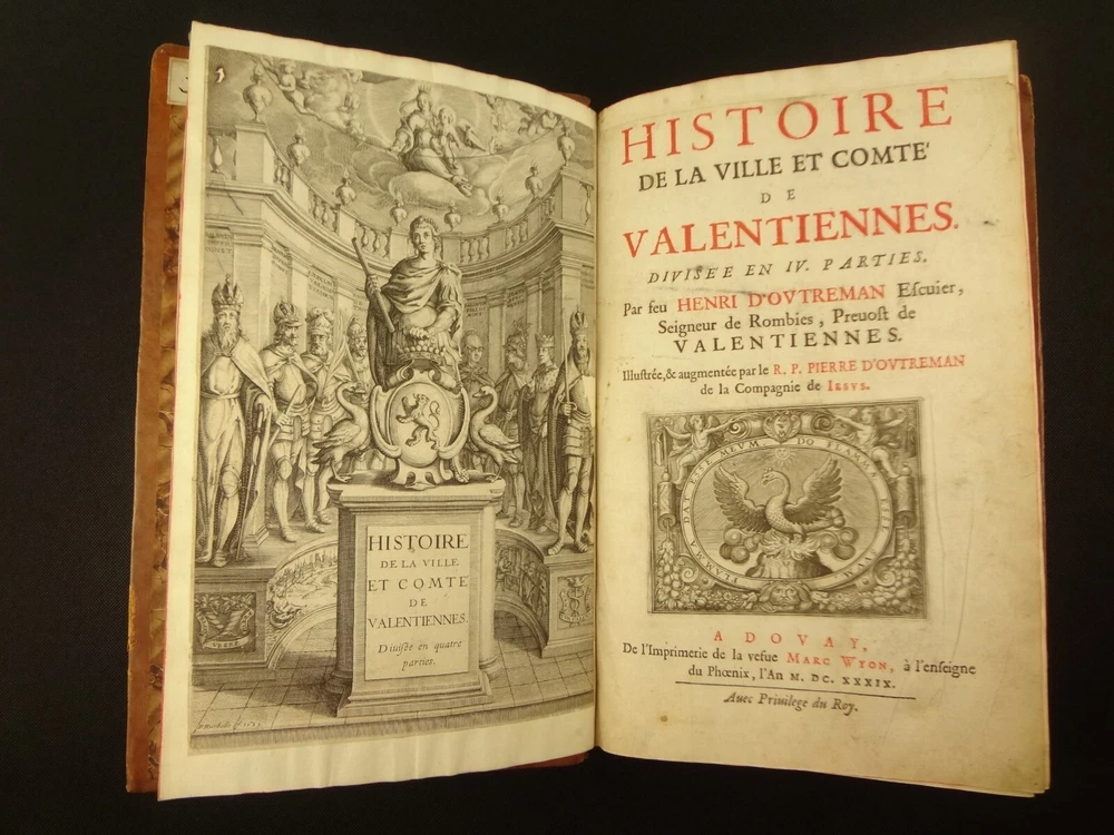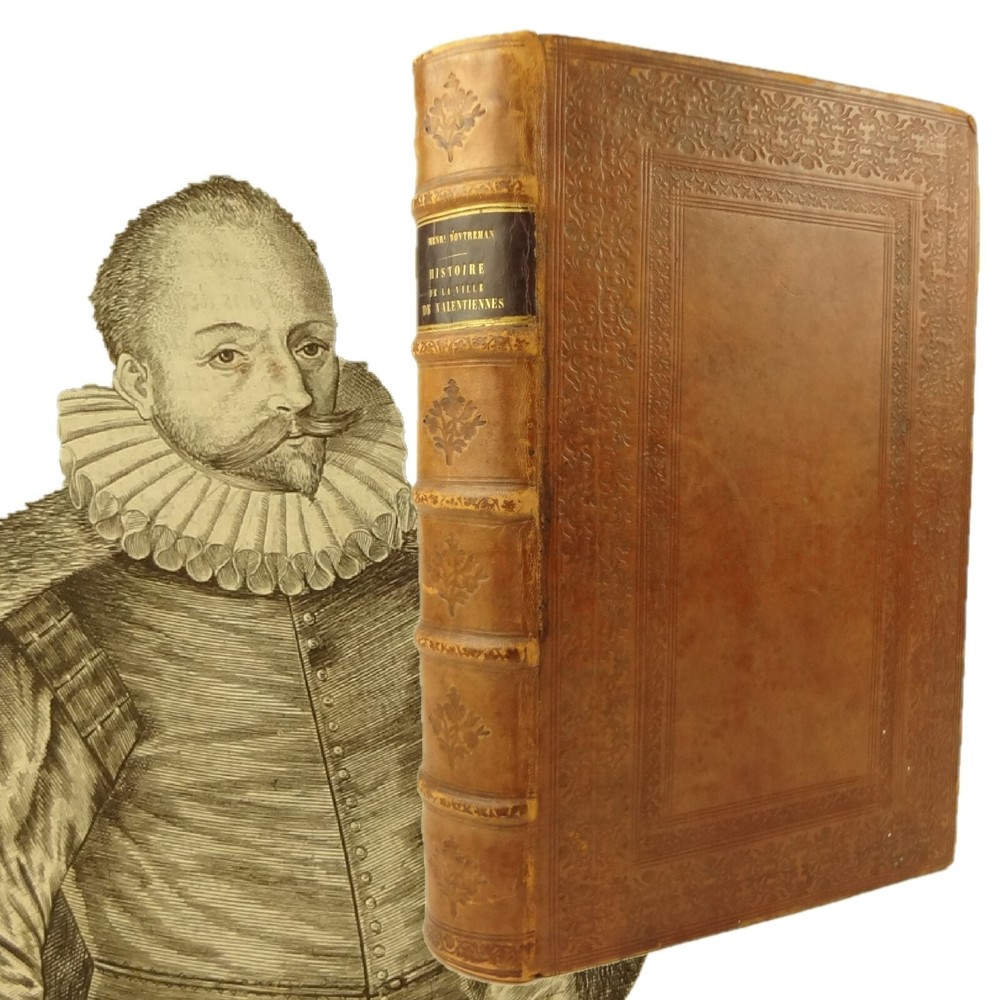 1639 Histoire de la ville et comté de Valentiennes, a detailed look at the French province and city of Valenciennes by the Governor and Historian of the city, Henri d'Outreman. This history of his hometown initially remained unprinted, but in 1639 his son Pierre delivered a posthumous and supplemented edition. Henri's nephew Antoine d'Outreman, Abbot of St. John's Abbey in Valenciennes, provided a biographical sketch of the author on the occasion of this publication. With a frontis, portrait of the author, and map of Valenciennes. Printed by the widow of Marc Wyon, Marie Vanderpiet Wyon. The 1/2 title page reveals the signature of "Jacques Robert Watier a Valenciennes". A 1715 record "Magistrat Renouvele" records Jacques-Robert Watier. (p. 177, Valenciennes au XVIIIe Siecle, Loridan, 1913). A Filae.com entry records that Jacques Robert Watier was an Alderman of Valenciennes (from a January 5th, 1753 marriage certificate of his son, Louis Joseph Watier). Bibliographic Details - Worldcat OCLC catalogue number 62206939, 493082425, among others. Physical Attributes - Measures approx. 31 x 20 x 5 cm. Quarto. Leather binding, likely 19th century. Boards with rich rolls and frames of tooling in blind. Spine with five raised bands; five compartments with a central floret in blind, one compartment with the title and author in gilt on black morocco. All edges red. Frontis, printer's mark (delightful expression of the Golden Phoenix), portrait of the author and map. The map was commonly a fold-out, but in this copy it is bound in as a two-page map extending from verso to recto. Pages - 1/2 title, frontis, i-xxx, privilege, map, 1-244, 3 leaves of genealogie, 2nd part title page, 245-588, [48], (1 - blank leaf). Collation - a-b4, c6, d2, A-Gg4, Hh2, 3 leaves of genealogy, Ii-Kkkk4, Llll6 (last blank) Condition - See pictures. 19th century binding with wear around edges, corners and joints. Several tiny spots of paint at bottom of front board. One worm hole at fore-edge. Worm tracks on book seller ticket, pastedown, and facing flyleaf. Single wormhole near fore-edge goes from front to page 40. 1/2 title page and frontis laid on paper. 1/2 title with ex libris signature at top. Frontis with a piece missing near gutter (see picture). Top of title page repaired. Some toning and thumbing throughout. Occasional fox spot, dog-eared page, candle ember spot, etc. throughout. Moisture mark at bottom corner page xi to 13. 2" tear from bottom edge xvii. Fold-out map mounted at center and bound, several spots and strengthened at fore-edges and gutter. Some pages toned more than others. Genealogie with moisture mark at from top and notes. 2 cm hole in top-edge margin 245. 4" repair fore-edge of 327. Spot fore-edge margin 349. A little darker toning at rear and some moisture marks right at edges, light.
