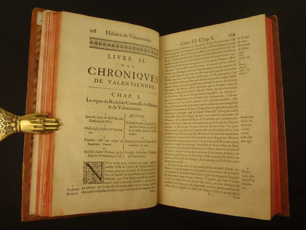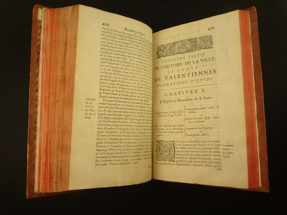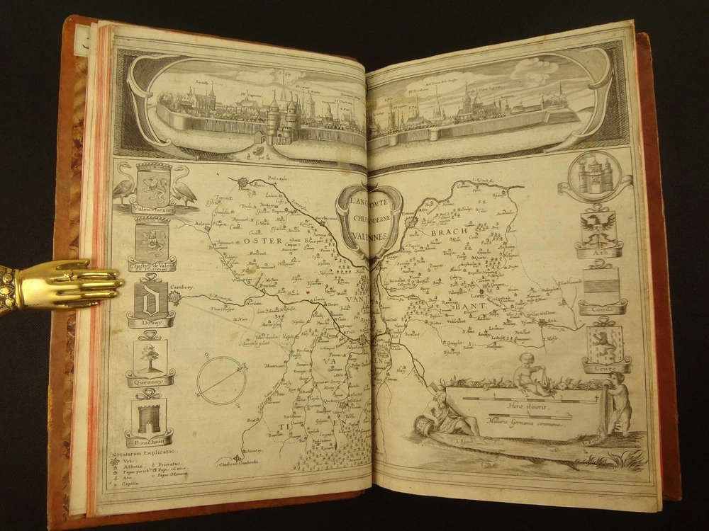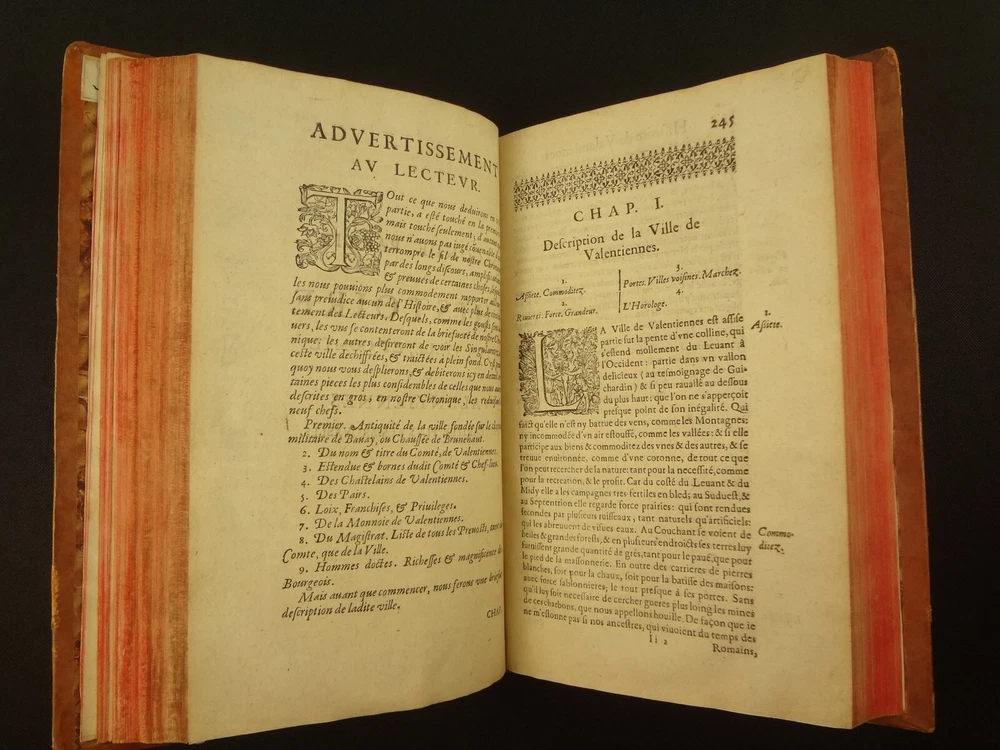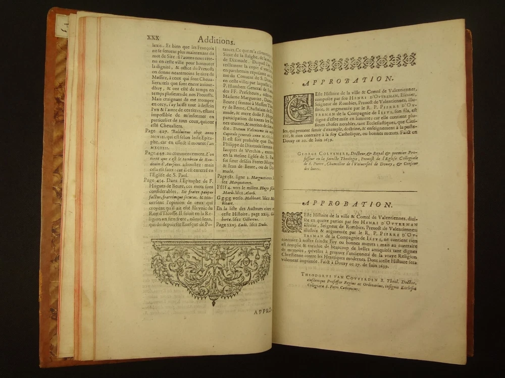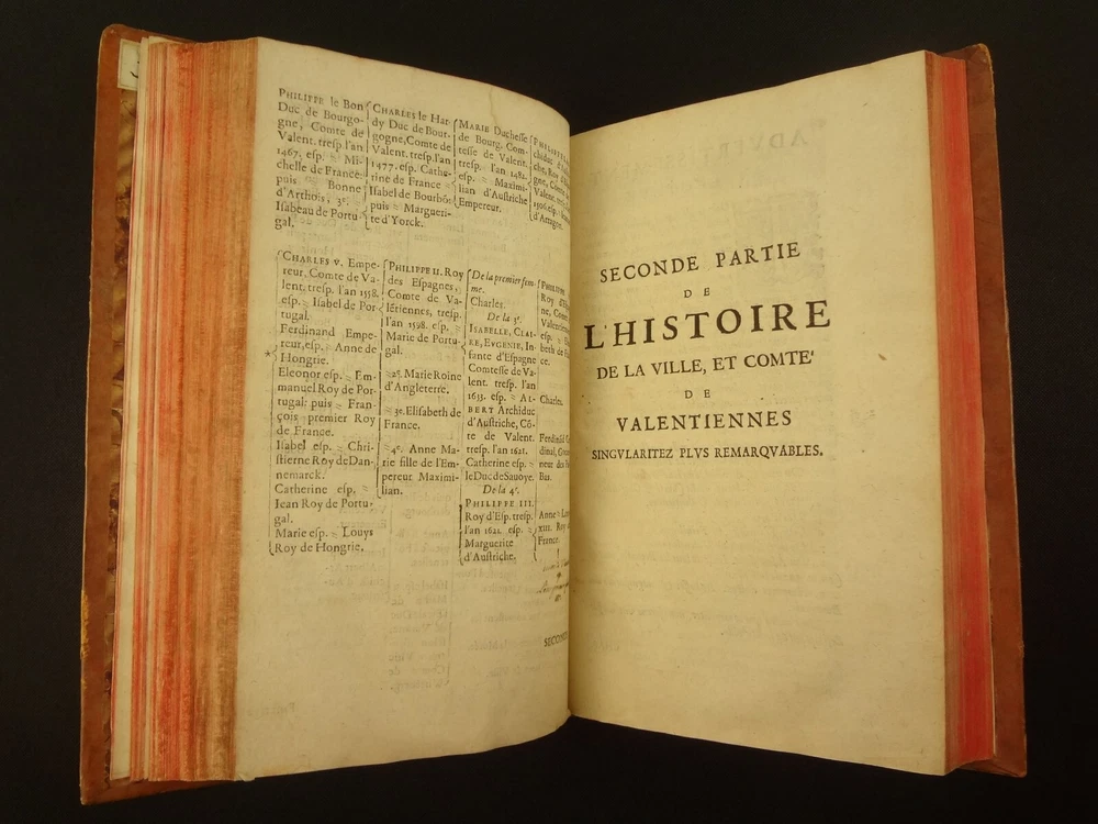 1639 Histoire de la ville et comté de Valentiennes, a detailed look at the French province and city of Valenciennes by the Governor and Historian of the city, Henri d'Outreman. This history of his hometown initially remained unprinted, but in 1639 his son Pierre delivered a posthumous and supplemented edition. Henri's nephew Antoine d'Outreman, Abbot of St. John's Abbey in Valenciennes, provided a biographical sketch of the author on the occasion of this publication. With a frontis, portrait of the author, and map of Valenciennes. Printed by the widow of Marc Wyon, Marie Vanderpiet Wyon. The 1/2 title page reveals the signature of "Jacques Robert Watier a Valenciennes". A 1715 record "Magistrat Renouvele" records Jacques-Robert Watier. (p. 177, Valenciennes au XVIIIe Siecle, Loridan, 1913). A Filae.com entry records that Jacques Robert Watier was an Alderman of Valenciennes (from a January 5th, 1753 marriage certificate of his son, Louis Joseph Watier). Bibliographic Details - Worldcat OCLC catalogue number 62206939, 493082425, among others. Physical Attributes - Measures approx. 31 x 20 x 5 cm. Quarto. Leather binding, likely 19th century. Boards with rich rolls and frames of tooling in blind. Spine with five raised bands; five compartments with a central floret in blind, one compartment with the title and author in gilt on black morocco. All edges red. Frontis, printer's mark (delightful expression of the Golden Phoenix), portrait of the author and map. The map was commonly a fold-out, but in this copy it is bound in as a two-page map extending from verso to recto. Pages - 1/2 title, frontis, i-xxx, privilege, map, 1-244, 3 leaves of genealogie, 2nd part title page, 245-588, [48], (1 - blank leaf). Collation - a-b4, c6, d2, A-Gg4, Hh2, 3 leaves of genealogy, Ii-Kkkk4, Llll6 (last blank) Condition - See pictures. 19th century binding with wear around edges, corners and joints. Several tiny spots of paint at bottom of front board. One worm hole at fore-edge. Worm tracks on book seller ticket, pastedown, and facing flyleaf. Single wormhole near fore-edge goes from front to page 40. 1/2 title page and frontis laid on paper. 1/2 title with ex libris signature at top. Frontis with a piece missing near gutter (see picture). Top of title page repaired. Some toning and thumbing throughout. Occasional fox spot, dog-eared page, candle ember spot, etc. throughout. Moisture mark at bottom corner page xi to 13. 2" tear from bottom edge xvii. Fold-out map mounted at center and bound, several spots and strengthened at fore-edges and gutter. Some pages toned more than others. Genealogie with moisture mark at from top and notes. 2 cm hole in top-edge margin 245. 4" repair fore-edge of 327. Spot fore-edge margin 349. A little darker toning at rear and some moisture marks right at edges, light.