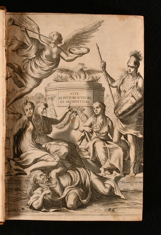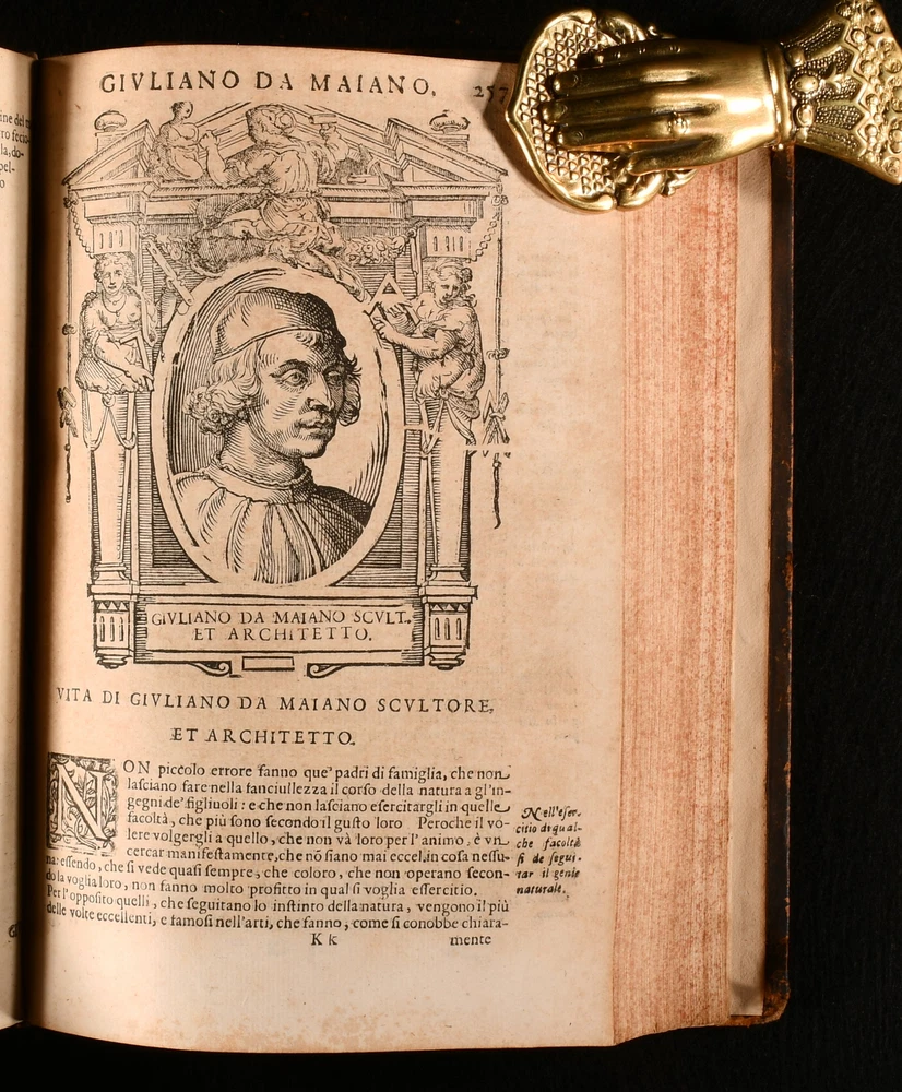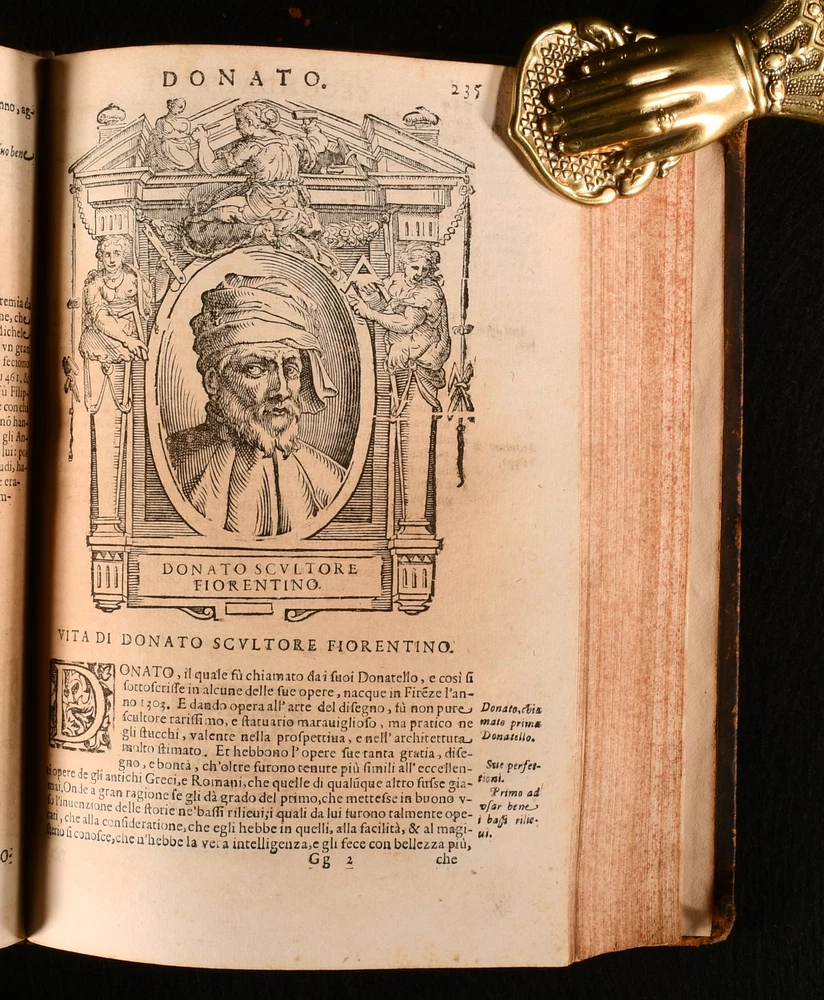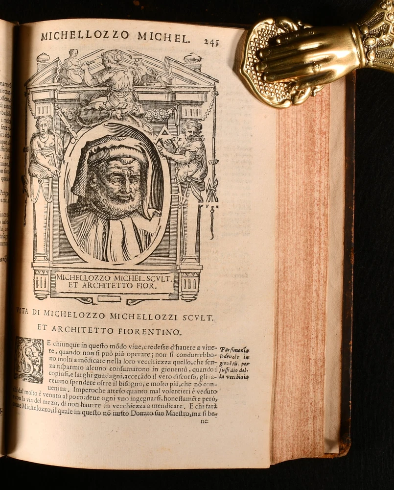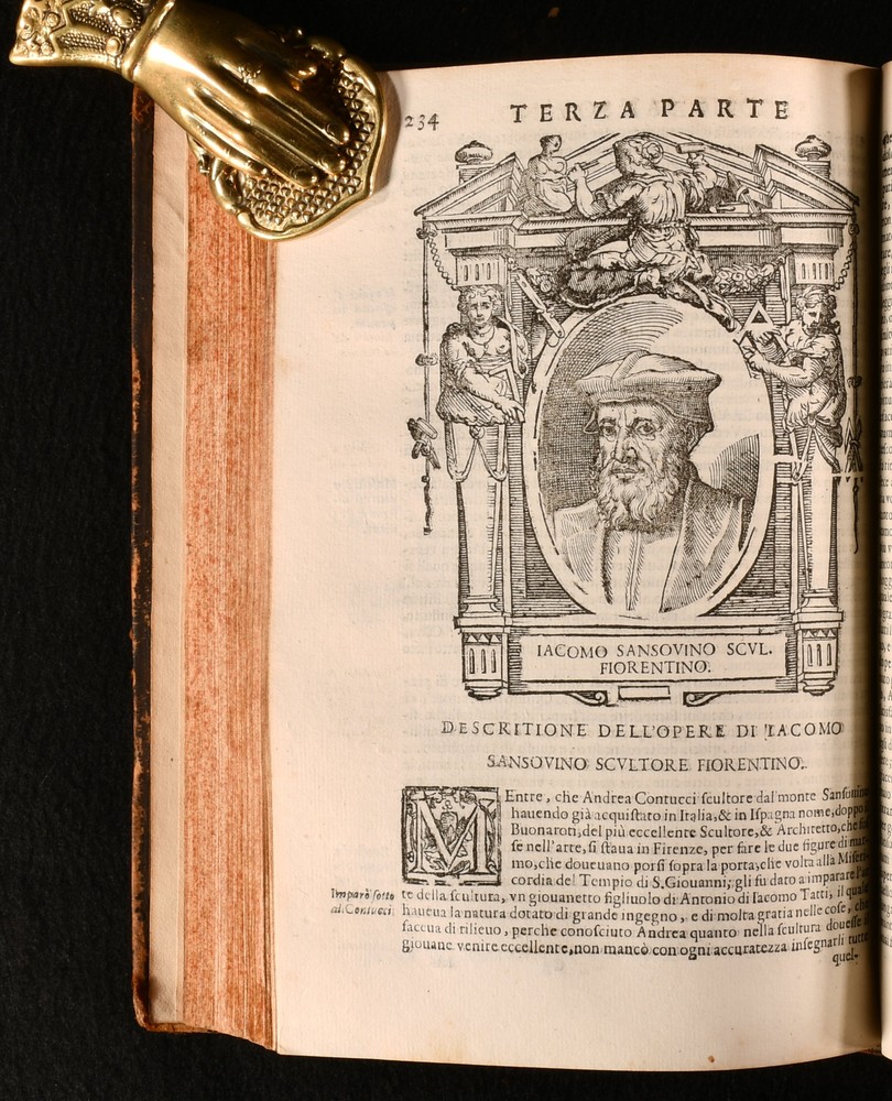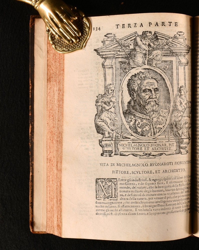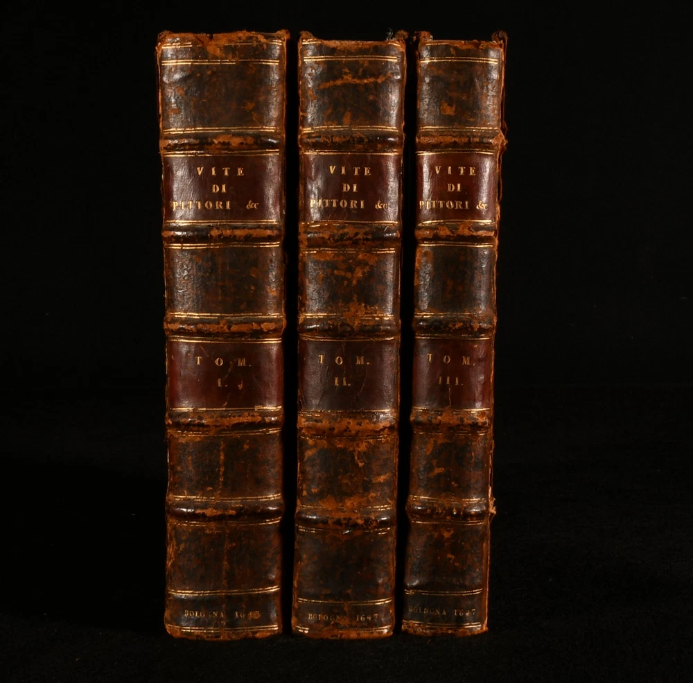 Click here to see our other books! Le Vite de piu Eccellenti Pittori, Scultori et Architetti Giorgio Vasari 1647 Heredi di Euangelista Dozza : Bologna 9" by 6.5" [10], 432, [131]; [2], 3-543; [42], 407, [1pp] SUMMARY An early edition of Giorgio Vasari's influential and important Renaissance work on Italian painters, being a collection of biographies, illustrated with detailed in-text engravings. In the original Italian. An Important Work,Illustrated,Leather Binding,Very Scarce Overall Condition: Very Good This book weighs 4 KG when packed UK Postage: £ 4.49 US Postage: £ 39.99 EU Postage : £ 26.99 European Postage: £ 36.99 Asia Postage: £ 65.99 Worldwide Postage: £ 99.99 DESCRIPTION In the original Italian. Complete in three volumes, with Parts I and II in one volume, and Part III in two volumes. A series of artist biographies, a work that is considered to be the most influential and the first important work on art history. Written by Giorgio Vasari, a noted art historian, Italian painter, historian, and architect. He is known for having been the first to use the term 'Renaissance', in print. Vasari is often considered to be the first art historian. The work is a treatise on the technical methods employed in the art. The biographies, whilst also being informative, also offer a light-hearted collection of amusing gossip and serve as a primary source for the period. Collated, lacking the half-title to Volume 1, otherwise complete. Collated from Jisc from a copy held at the University of Oxford Libraries. An unusually good copy. Volume I illustrated with a frontispiece, and seventy-six in-text engravings. Lacking engraving to the reverse of leaf O3, leaf P3, reverse of leaf P4, and to the reverse of leaf T1, as is usual, being a wider printing error rather than being particular to this one copy. Volume II illustrated with fifty-five in-text engravings. Lacking engraving to the reverse of leaf H1, and leaf Gg1, as is usual, being a wider printing error rather than being particular to this one copy. Volume III illustrated with seventeen in-text engravings. Register for Volume I runs as [5], a-i6, A-Vvv4, Xxx6. Register for Volume II runs as A5, B-Yyy4. Register for Volume III runs as [3], a-c4, d6, A-Eee4. 'Le Vite de piu Eccellenti Pittori, Scultori et Architetti', translated in English as 'Lives of the Most Excellent Painters, Sculptors, and Architects'. In the first edition, Vasari focused more on Florentines, a bias as he was from Florence. In the second and later editions as here however, Vasari extended the work to focus on Venetians as well. Vasari did not research archives for exact dates for the biographies, so there are some inaccuracies. 'Le Vite de piu Eccellenti Pittori' is well known as an influential Renaissance work, and became the standard text for contemporary and late biographers and art historians. CONDITION In a full eighteenth century calf binding. Externally, generally smart. Joints are cracked. Some rubbing and bumping to the extremities with a small amount of loss to the head of the spines. To volume I the front hinge is held by cords only. Hinges are slightly strained but remain firm. Ink annotation to the front pastedown of Volume II, and small ink line to the front pastedown of Volume III. Engraved title is closely trimmed. Internally, firmly bound are only lightly age-toned and are generally very clean with just the odd spot and odd mark. Small tidemarks to the first few pages of Volume I. Light marks to the margins of some pages of Volume I. Leaves i2 and i3 of Volume I are misbound so that leaf i2 follows leave i3. Repaired closed tear to the margin of leaf L3 of Volume I. Mark to leaf C4 of Volume III. Closed tear to the margin of leaf Ddd4, not affecting text. Overall Condition: Very Good GLOSSARY OF TERMS Overall Condition (Dustwrapper condition rating is shown after that for the book itself, where a dustwrapper is present) Fine - Very well preserved copy showing very little wear Very Good Indeed - Only one or two minor faults, really a very attractive copy Very Good - Quite a wide term meaning no major faults but probably several smaller ones often expected given the age of the book, but still a respectable copy Good - Meaning not very good. Some more serious faults as will be described in the condition report under 'condition' Good Only - Meaning one or more faults that could really do with repair Fair - As with good only above but with other faults leaving a compromised copy even after repair Poor - Really bad and possibly seriously incomplete. We only sell books in this condition where their rarity or value makes them attractive none the less. Major defects will be described. GUARANTEE We offer a full money back guarantee on our descriptions. Please ask for details and conditions. We prefer PAYPAL. If you pay via PAYPAL we will post the item off the same or the next working day with the postage you have selected. Please note we cannot accept USD cheques