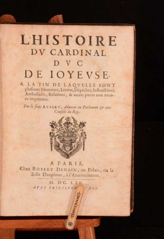 Click here to see our other books! L'Histoire Du Cardinal Duc De Joyeuse Antoine Aubery 1654 Robert Denain : Paris 9.5" by 7" [3], 432pp SUMMARY A first edition of Antoine Auberys history of Francois de Joyeuse, the prominent 16th century French Archbishop and minister. First Edition,Illustrated,Leather Binding,Uncommon Overall Condition: Very Good This book weighs 0.75 KG when packed UK Postage: £ 3.99 US Postage: £ 19.99 EU Postage : £ 15.99 European Postage: £ 16.99 Asia Postage: £ 21.99 Worldwide Postage: £ 25.99 DESCRIPTION Appended are several personal notes and missives, making the work especially useful to both the historian and general reader. Francois de Joyeuse was born in Carcassonne, the second son to Guillaume de Joyeuse and Marie Eleanor de Batarnay. His elder brother held some influence with King Henry II, who made him a Duke in 1581. In that same year he became Archbishop of Narbonne, despite being only 19. He inherited the Dukedom of Joyeuse in 1587, after the death of his brother at the head of the Catholic army at the Battle of Coutras. Later he supported the enemy commander, then Henry IV, and was heavily involved in the politics conducted between the Holy See and the French crown. This was the personal copy of Algernon Capell, Earl of Essex, and contains his bookplate to the reverse of the title page. Dated 1701 CONDITION In full mottled calf with gilt detailing to the spine. Externally sound with general shelfware and light marks of handling. The spine is a little rubbed and the spine label is missing. There are light tidemarks to the boards near the joints. The joints themselves are starting but firm. There is a bookplate and a brief numerical ink inscription to the front pastedown, which has offset. Internally lightly foxed but remains remarkably clean for its age. Firmly bound. Overall Condition: Very Good GLOSSARY OF TERMS Overall Condition (Dustwrapper condition rating is shown after that for the book itself, where a dustwrapper is present) Fine - Very well preserved copy showing very little wear Very Good Indeed - Only one or two minor faults, really a very attractive copy Very Good - Quite a wide term meaning no major faults but probably several smaller ones often expected given the age of the book, but still a respectable copy Good - Meaning not very good. Some more serious faults as will be described in the condition report under 'condition' Good Only - Meaning one or more faults that could really do with repair Fair - As with good only above but with other faults leaving a compromised copy even after repair Poor - Really bad and possibly seriously incomplete. We only sell books in this condition where their rarity or value makes them attractive none the less. Major defects will be described. GUARANTEE We offer a full money back guarantee on our descriptions. Please ask for details and conditions. We prefer PAYPAL. If you pay via PAYPAL we will post the item off the same or the next working day with the postage you have selected. Please note we cannot accept USD cheques