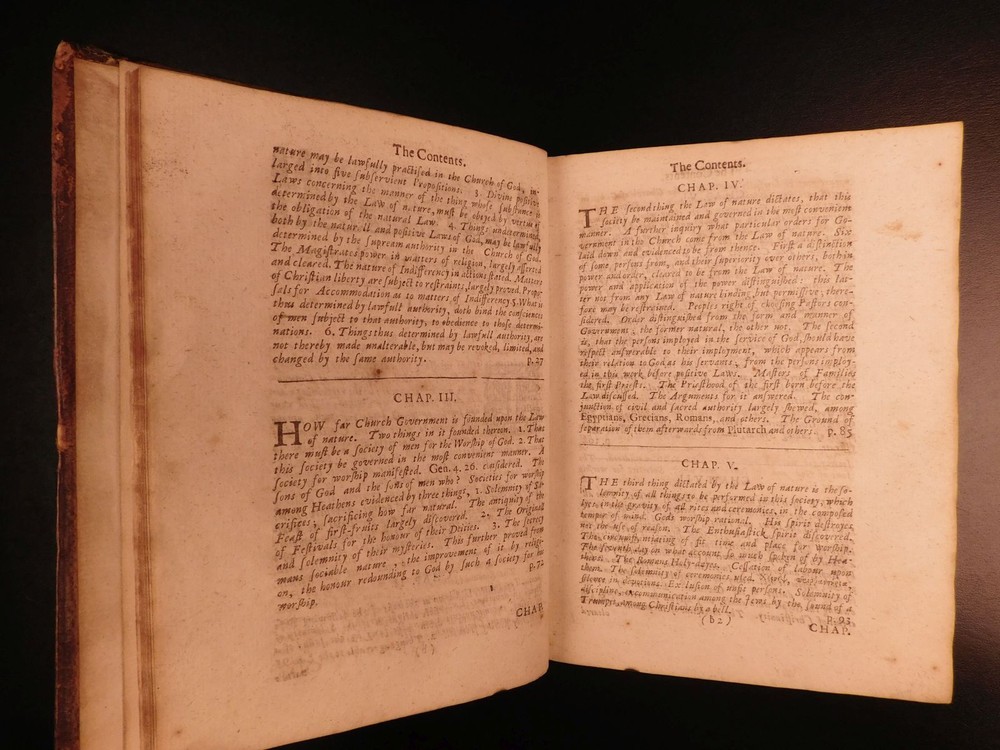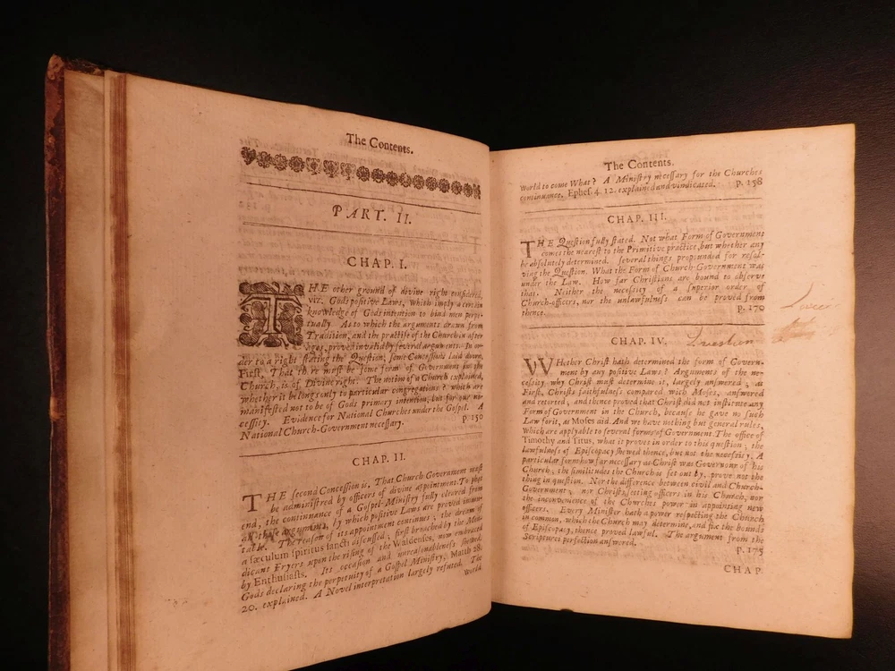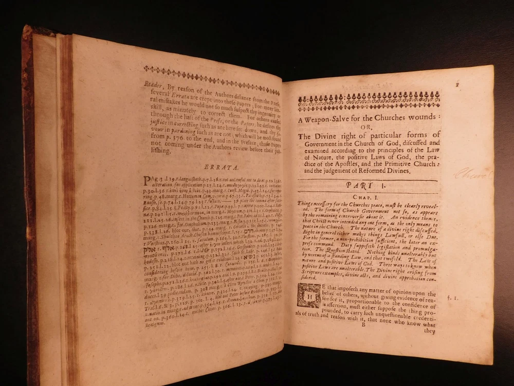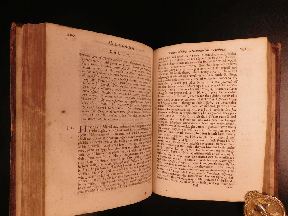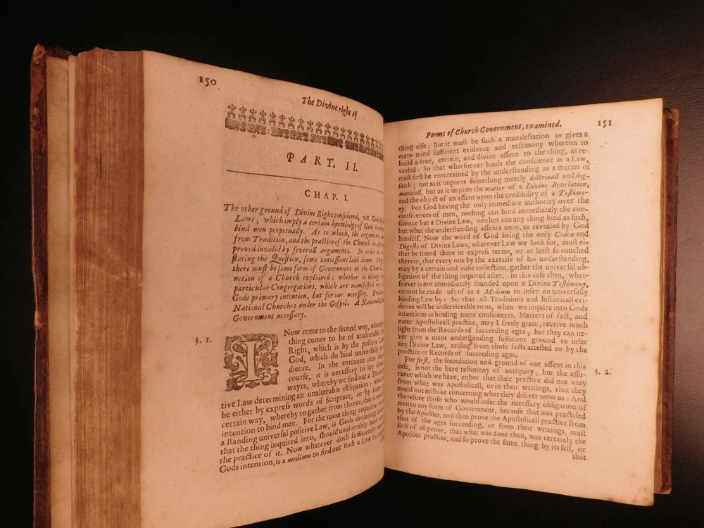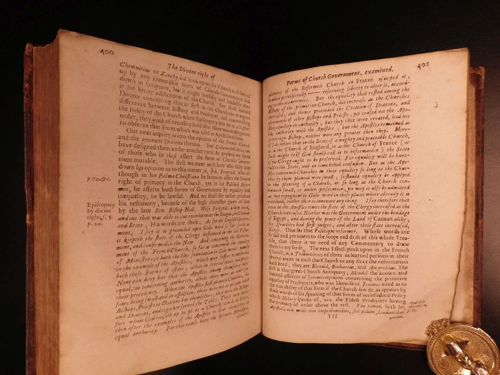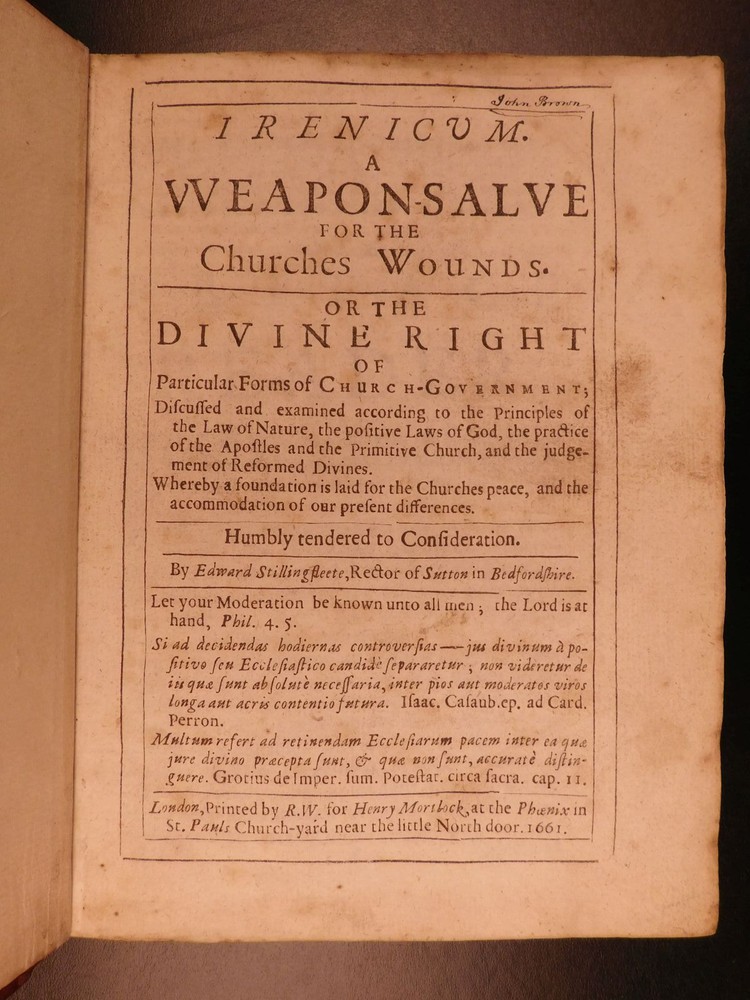 1661 Stillingfleet Irenicum Anglican Church Government vs Presbyterian ENGLISH Edward Stillingfleet was a 17 th -century British theologian known for his defensive views on Anglicanism. His first work, which (negatively) set the tone for his literary career, was ‘The Irenicum’, a work which advocated for compromise between the Presbyterian and Anglican Orthodox churches. While the root of the work is founded in theological church models and structures, Stillingfleet covers a variety of philosophical ideas including the state of natural law. According to Morison and Richardson, “‘The Irenicum’ was set forth the assuage the spirit of sectarian bitterness; it was an attempt to show that there was no plan of Church Order laid down in the New Testament; and it bears just as strongly against notions of divine institution of Presbyterianism.” ‘Irenicum’ was published before the church was re-established and contributed to debates about ecclesiastical restoration by showing the legitimacy of obeying decisions on rites and worship left undetermined in the Bible. (Rose, p.141ff). Stillingfleet made controversial claims about the legal authority the church had over the law – however, he did push the concept of strict obedience to the law as it was divinely inspired. Moreover, the church was responsible for advising on the content of the laws, but the actual governing power and law enforcement remained with the magistrate. (Rose, 143). Item number: #5033 Price: $599 STILLINGFLEET, Edward Irenicum : a weapon-salve for the churches wounds : or, the divine right of particular forms of church-government discussed and examined. London : R.W. for Henry Mortlock, 1661. Details : · Collation: Complete with all pages o [28], 416 · References: Rose, Godly Kingship in Restoration England ; Morison & Richardson, The Church Review p. 209; · Language: English · Binding: Leather; tight & secure · Size : ~7.75in X 6in (19.5cm x 15cm) · Very rare with no other example for sale worldwide at present Our Guarantee: Very Fast. Very Safe. Free Shipping Worldwide. Customer satisfaction is our priority! Notify us with 7 days of receiving, and we will offer a full refund without reservation! 5033