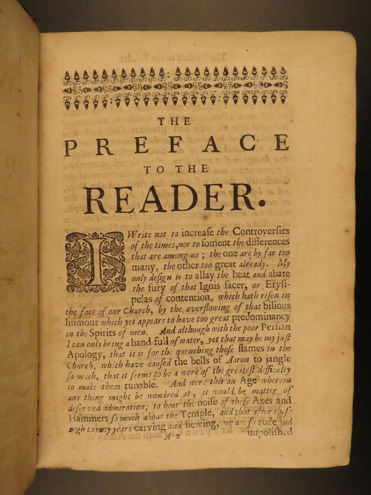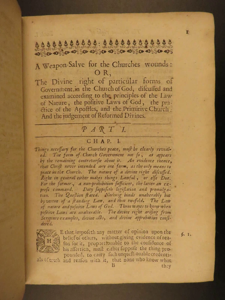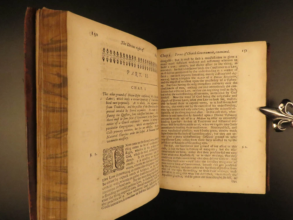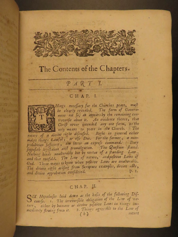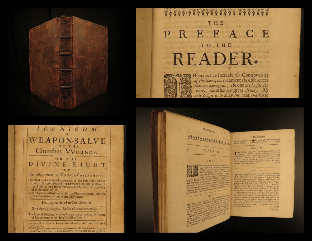 1662 Stillingfleet Irenicum Anglican Church Government vs Presbyterian ENGLISH Edward Stillingfleet was a 17 th -century British theologian known for his defensive views on Anglicanism. His first work, which (negatively) set the tone for his literary career, was ‘ The Irenicum’ , a work which advocated for compromise between the Presbyterian and Anglican Orthodox churches. While the root of the work is founded in theological church models and structures, Stillingfleet covers a variety of philosophical ideas including the state of natural law. According to Morison and Richardson, “‘The Irenicum’ was set forth the assuage the spirit of sectarian bitterness; it was an attempt to show that there was no plan of Church Order laid down in the New Testament; and it bears just as strongly against notions of divine institution of Presbyterianism.” ‘Irenicum’ was published before the church was re-established and contributed to debates about ecclesiastical restoration by showing the legitimacy of obeying decisions on rites and worship left undetermined in the Bible. (Rose, p.141ff). Stillingfleet made controversial claims about the legal authority the church had over the law – however, he did push the concept of strict obedience to the law as it was divinely inspired. Moreover, the church was responsible for advising on the content of the laws, but the actual governing power and law enforcement remained with the magistrate. (Rose, 143). Item number: #11914 Price: $599 STILLINGFLEET, Edward Irenicum. A weapon-salve for the churches wounds, or The divine right of particular forms of church-government London : Printed by R.I. for Henry Mortlock, at the Phoenix, and John Simmes, at the Cross-keyes in St. Pauls Church-yard, neer the little North door, 1662. Details : · Collation: Complete with all pages o [28], 447, [1] · References: Rose, Godly Kingship in Restoration England ; Morison & Richardson, The Church Review p. 209; · Language: English · Binding: Leather; tight & secure · Size : ~8in X 6in (20cm x 15cm) Our Guarantee: Very Fast. Very Safe. Free Shipping Worldwide. Customer satisfaction is our priority! Notify us with 7 days of receiving, and we will offer a full refund without reservation! 11914