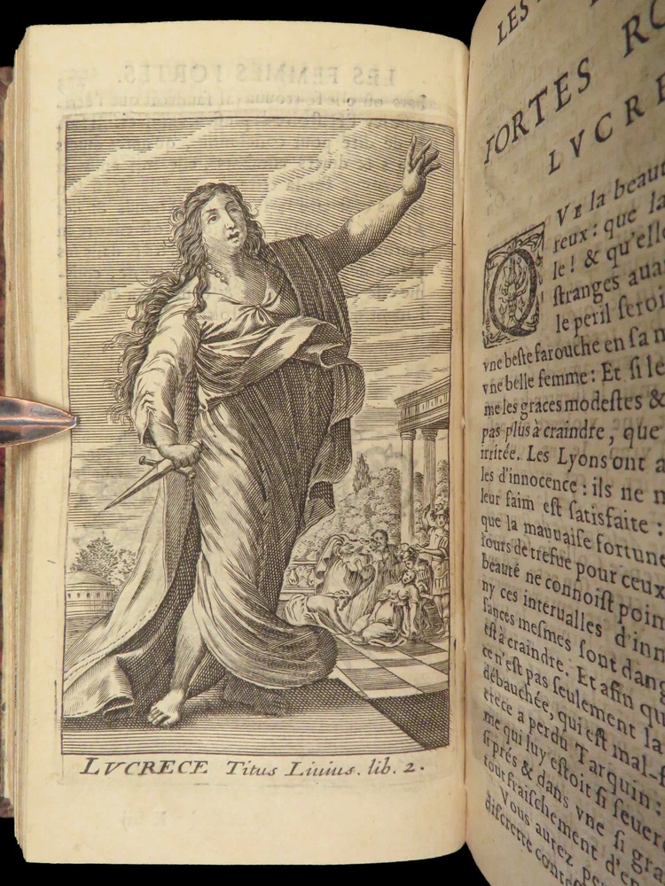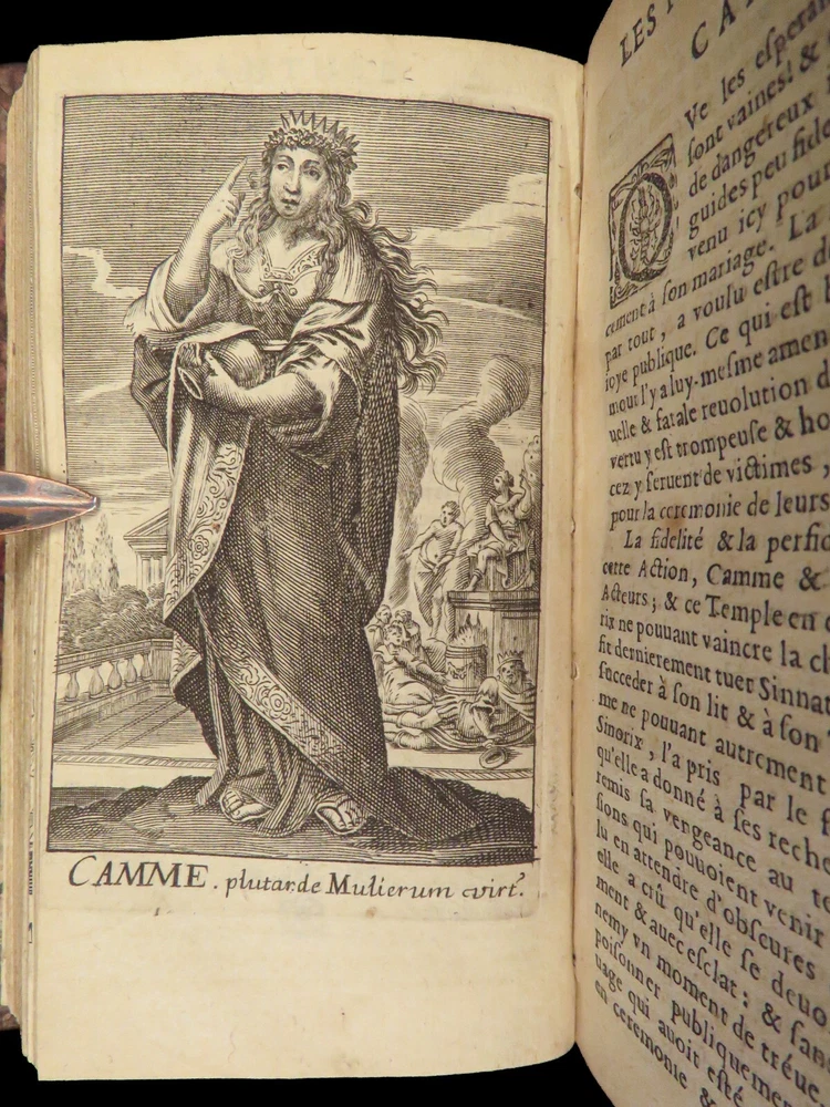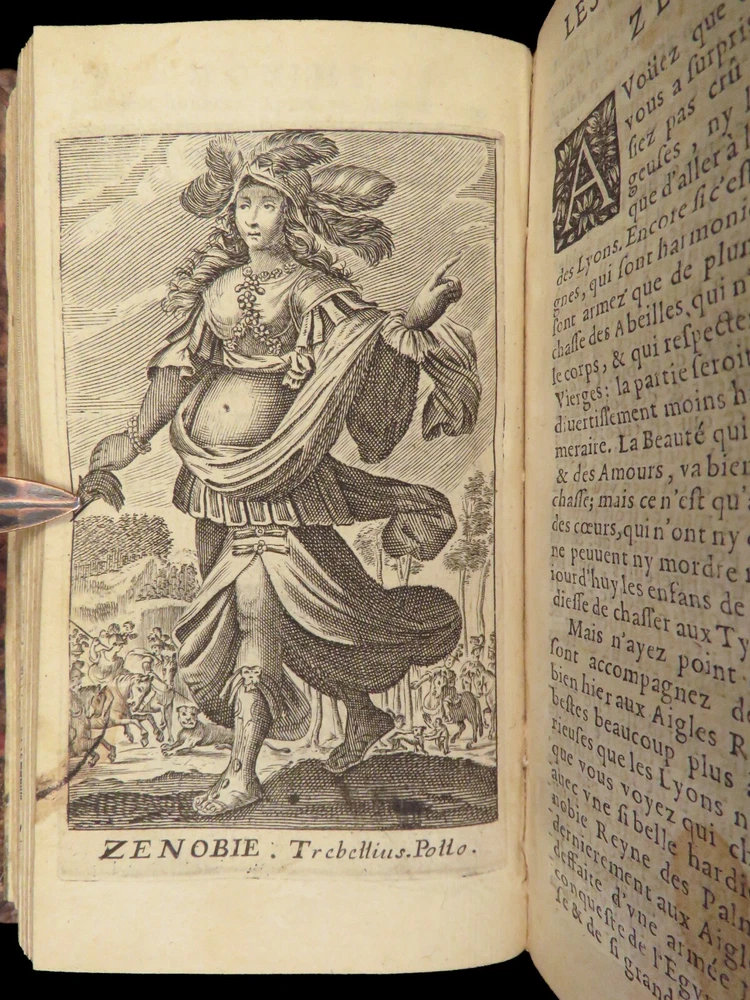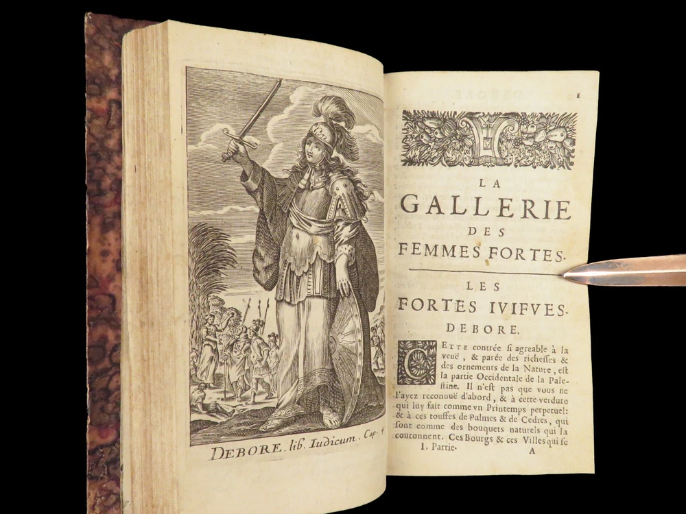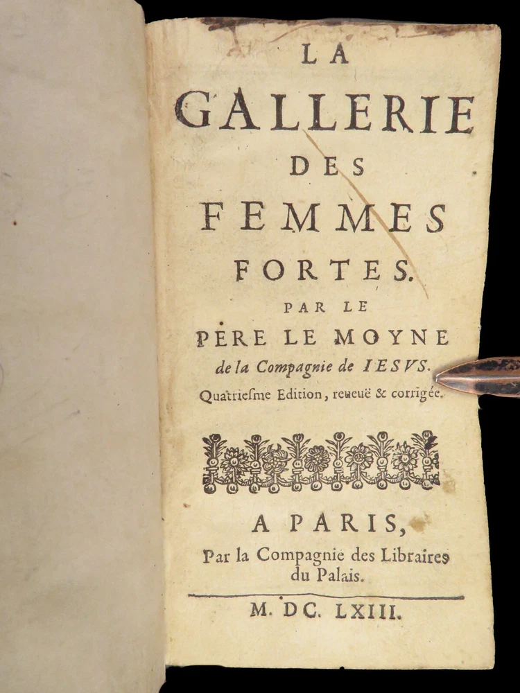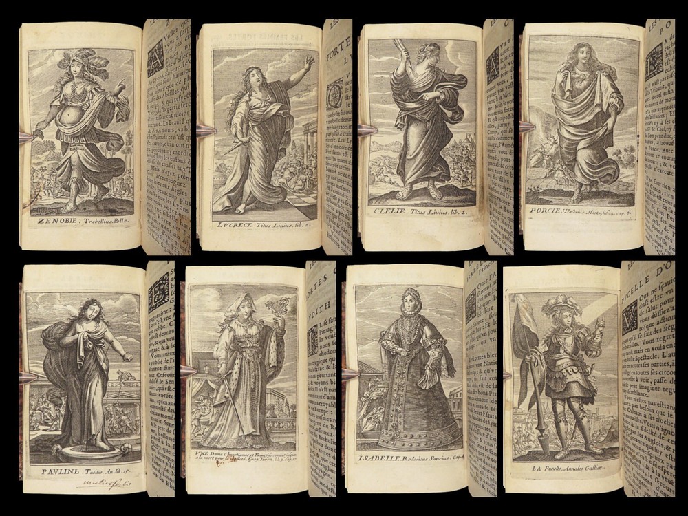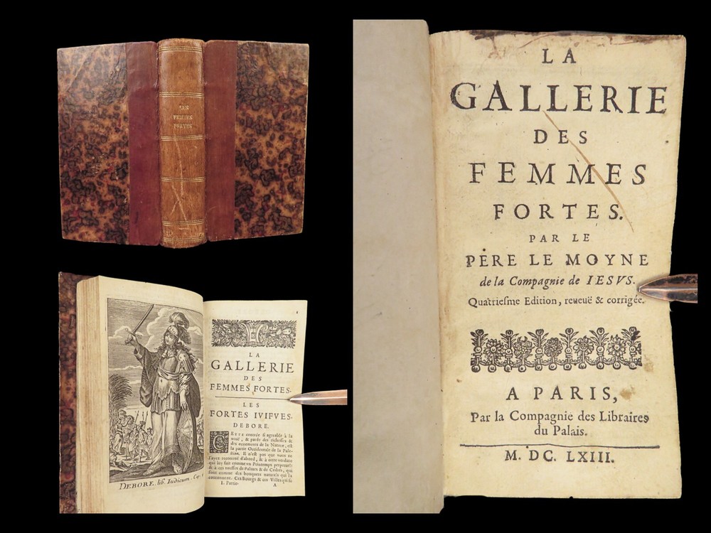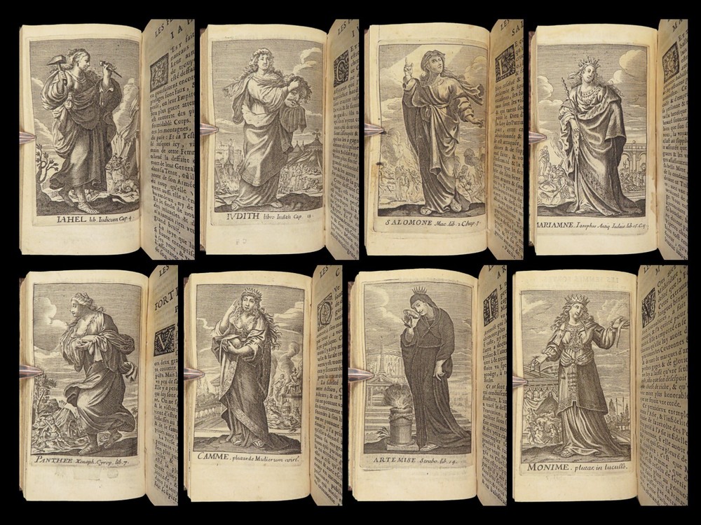 1663 Famous WOMEN Moyne Gallery Joan of Arc Marie Stuart Salome Artemis RARE Pierre le Moyne’s ‘ Le Gallerie des Femmes Fortes ’ is a fascinating 17 th -century biographical account of important historical women. Moyne discusses the role of these women and their influence on their and future cultures. Women covered in this work include: · Zenobia, queen of Palmyrene · Artemis, Greek goddess · Salome, daughter of Herod II · Mariamne the Hasmonean · Margaret of Austria · Theodelinda, Queen of Lombards · Marie Stuart · Joan of Arc · Isabella I of Castille Note that this 1663 edition includes 20 full-page engraved illustrations of each woman. Item number: #27716 Price: $750 MOYNE, Pierre le Le gallerie des femmes fortes Paris: Par la Compagnie des Libraires du Palais, 1663. Details : · Collation: Complete with all pages; 2 parts in 1 o Part I – [110], 309, [3] o Part II – [2], 251, [13] o 20 engraved plates · Language: French · Binding: Leather; tight and secure · Size : ~5.75in X 3.25in (14.5cm x 8.5cm) Our Guarantee: Very Fast. Very Safe. Free Shipping Worldwide. Customer satisfaction is our priority! Notify us with 7 days of receiving, and we will offer a full refund without reservation! 27716