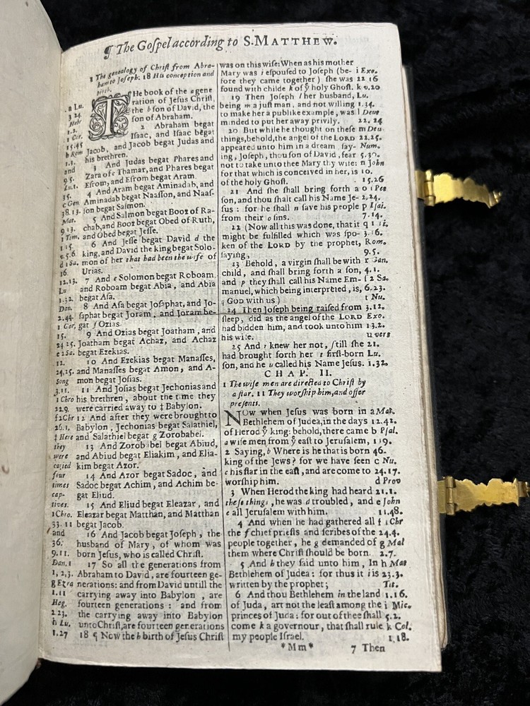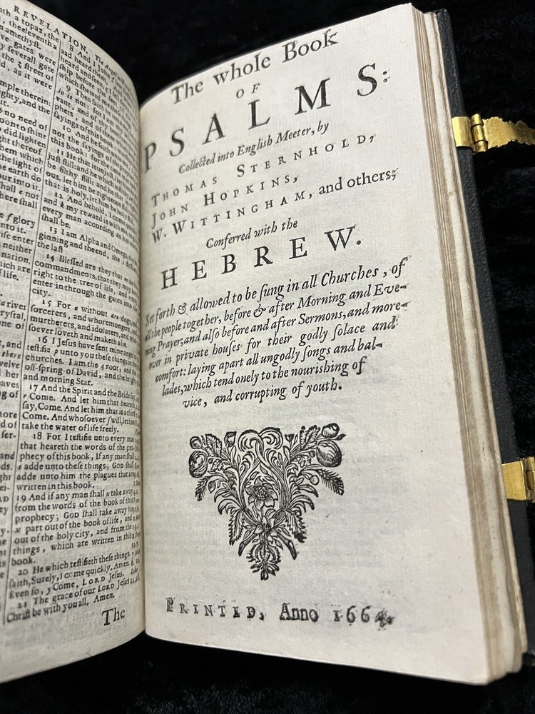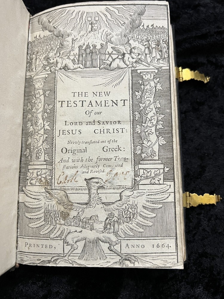 THE AUTHORIZED (KING JAMES) VERSION OF THE BIBLE "The Noblest Monument of English Prose" RARE SEPARATELY PRINTED NEW TESTAMENT WITH CANNE'S CROSS REFERENCE SYSTEM FIRST EDITION ENGRAVED TITLE 1664 The New Testament [Amsterdam ?], 1664. Duodecimo printing with Marginal References by John Canne. Together with The Whole Book of Psalms Collected in English Metre by Thomas Sternhold, John Hopkins, W. Wittingham and Others, Printed Anno. 1664. No doubt printed abroad, perhaps at Amsterdam. Biblical t ext ends on Yy4. No Apocrypha. (Luke 23:51, has deeds for deed.) Catch word indicates that the Book of Psalms was printed for inclusion with this Testament. Thus while comparable to Herbert's No. 688, this separately issued New Testament is unrecorded. Full leather binding with apparent sealskin over wooden boards, with later gold metallic clasps attached. The woodcut title-border represents: above, the giving of the Law; and below, a spread eagle, and Joseph meeting Jacob. The marginal references were prepared by John Canne (d. 1667) who lived for many years abroad and was styled by John Ball the leader of the English Brownists in Amsterdam.' His work represents the first full apparatus of carefully selected marginal references to appear in a King James Bible. Anderson (Vol. i, p. 559) mentions a quarto edition of this Bible printed in Amsterdam in 1644; D..B. gives 1647 as the date of the first authenticated edition. In 1653 he received an exclusive licence for seven years 'to print a Bible with annotations, being his own work, and that no man unless appointed by him, may print the said notes, either already printed or to be printed. (Calendar of State Papers, 9 June 1653.)