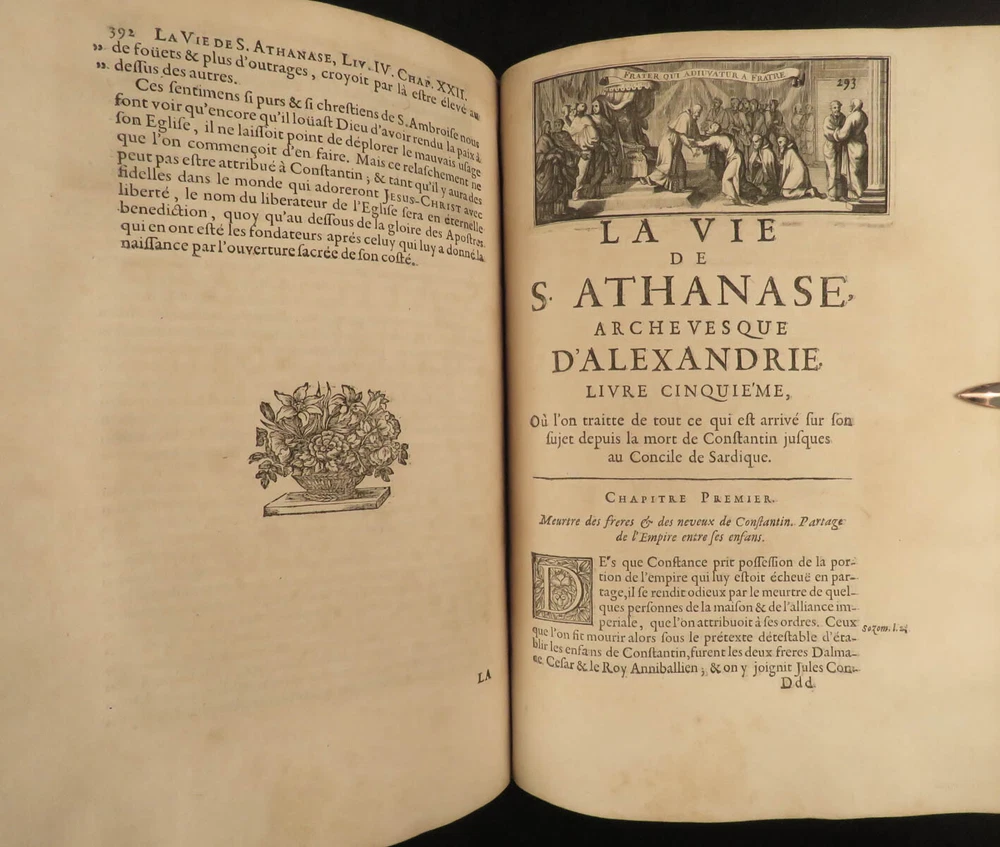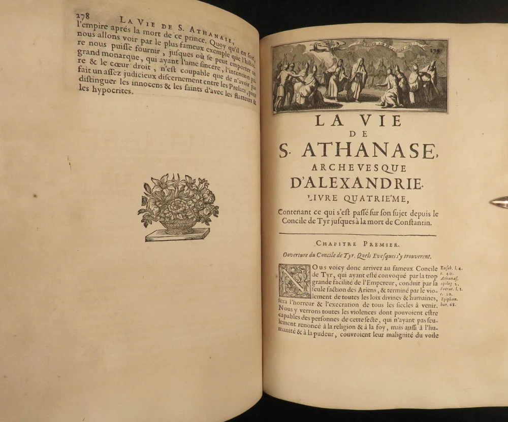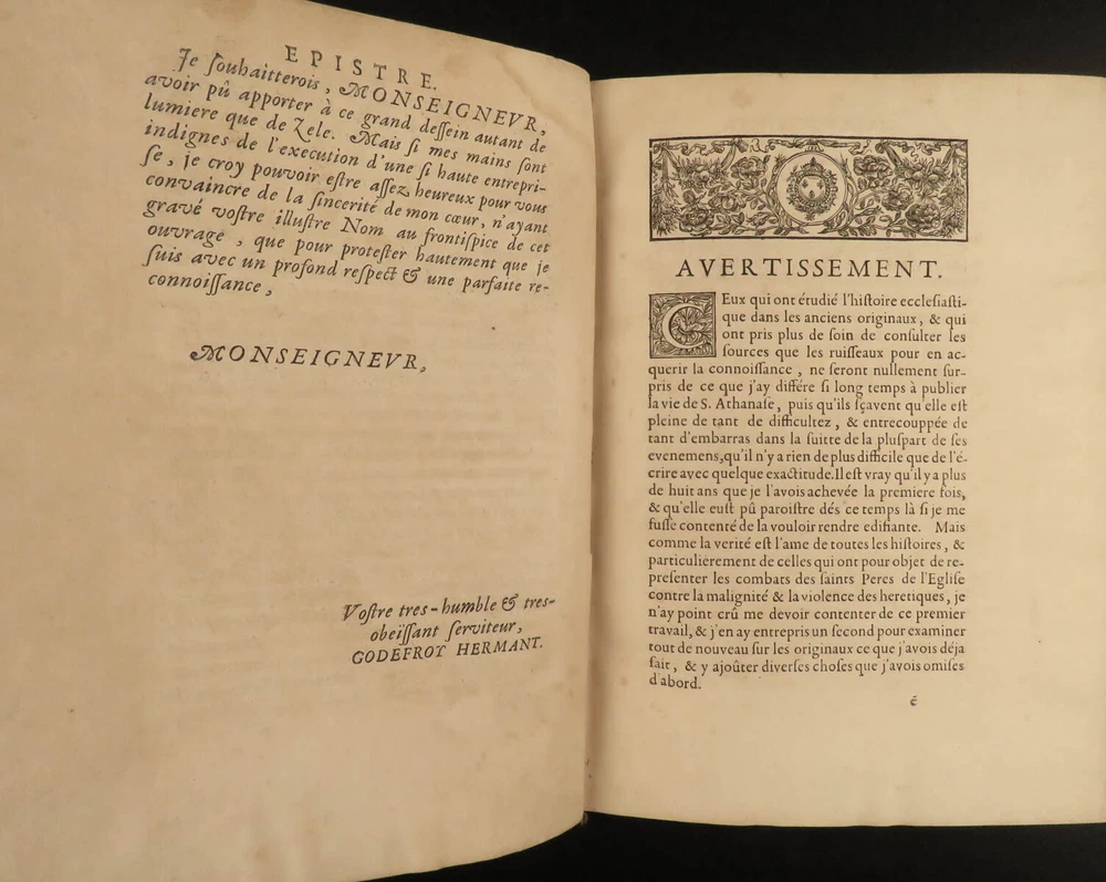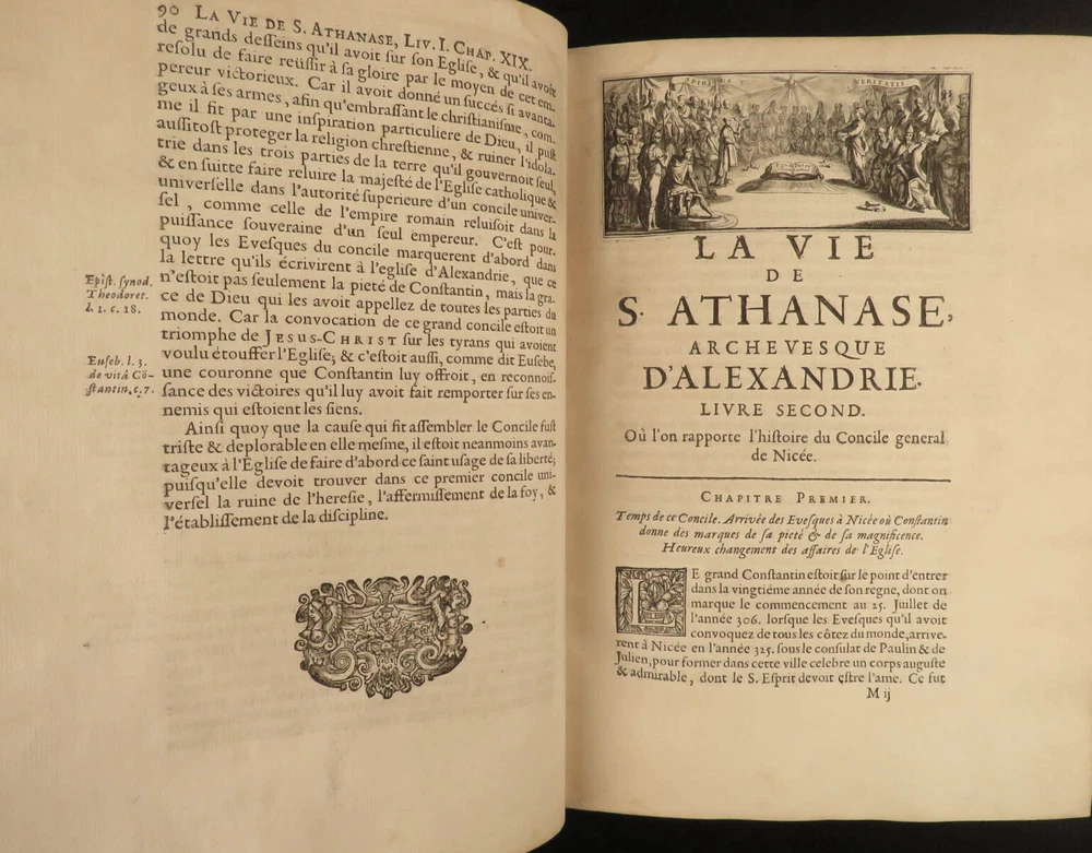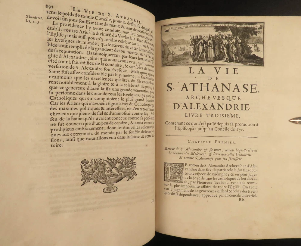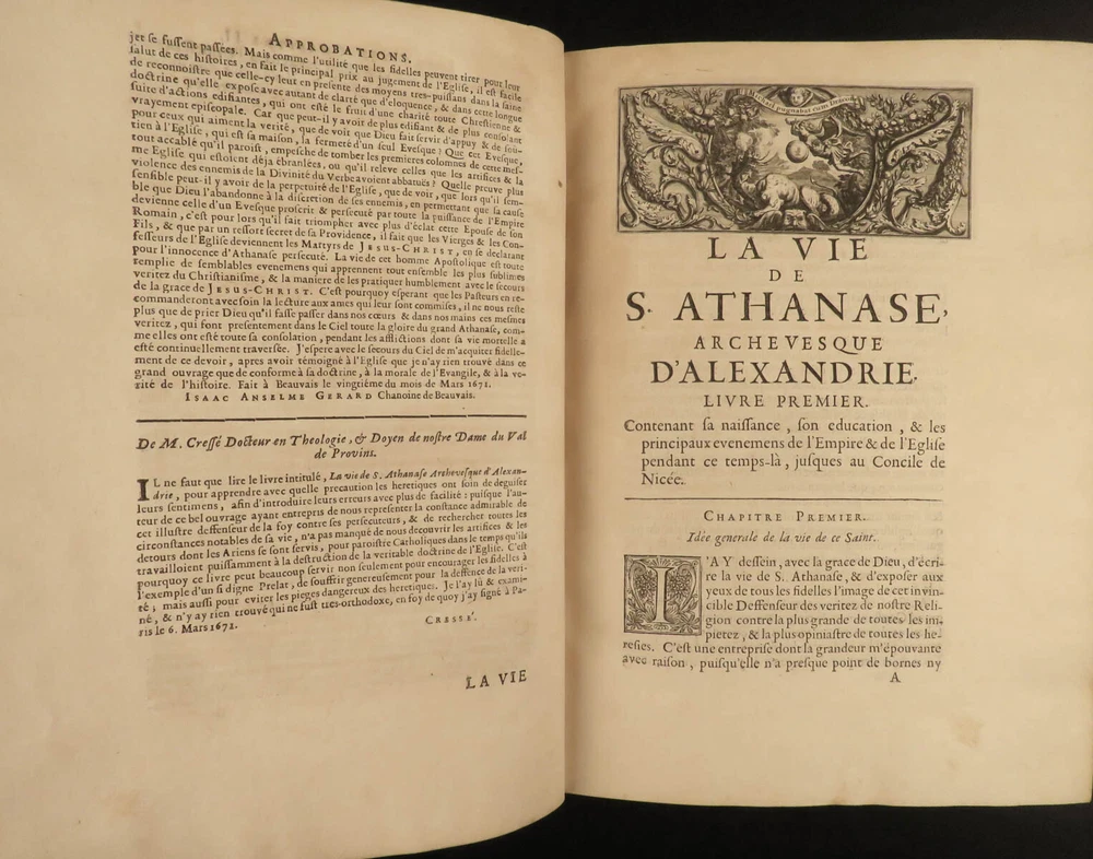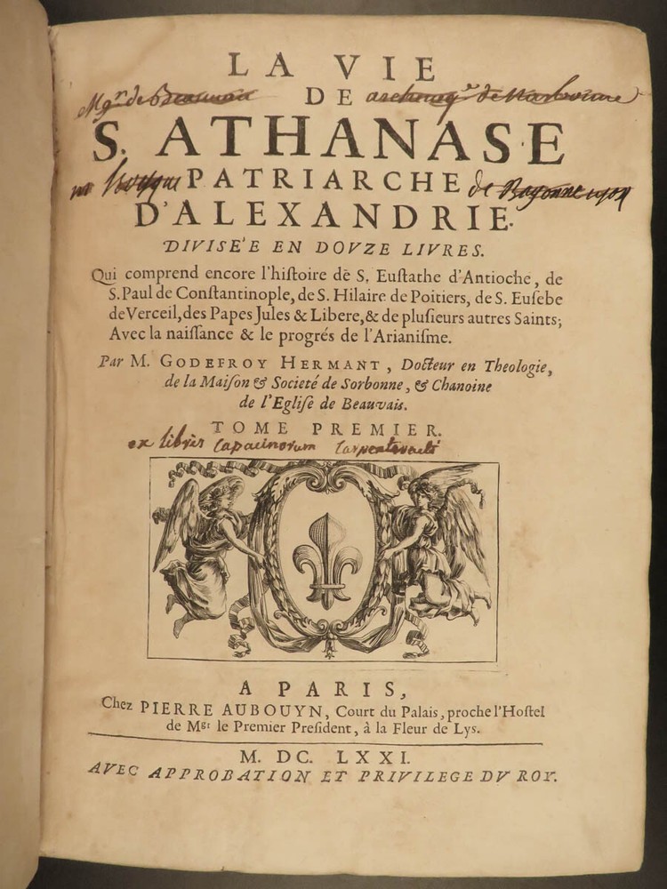 1671 1 ed Life of Saint Athanasius of Alexandria Greek Orthodox EGYPT Hermant 2v Godefroy Hermant was a 17 th -centuery Catholic theologian known for his canonical and ecclesiastical history works. Perhaps his best-known work was his biographical account of the life of Saint Athanasius of Alexandria, first published in 1671. Athanasius of Alexander was a 4 th -century early Church Father who was notably against Arianism. This impressive first edition features 12 fine engraved vignettes; complete in two volumes. Item number: #19336 Price: $750 HERMANT, Godefroy La vie de S. Athanase, patriarche d'Alexandrie. Divisée en dovze livres. Qui comprend encore l'histoire de S. Eustathe d'Antioche, de S. Paul de Constantinople, de S. Hilaire de Poitiers, de S. Eusebe de Verceil, des papes Jules & Libere, & de plusieurs autres saints; avec la naissance & le progrés de l'Arianisme A Paris, Chez Jean Du Puis, ruë Saint Jacques, à la Couronne d'or, 1671. First edition. Details : · Collation: Complete with all pages; 2 volumes o Vol. I – [26], 750, [2] o Vol. II – [2], 686, [2] · Language: French · Binding: Leather; tight and secure · Size : ~10.25in X 7.75in (26cm x 19.5cm) Our Guarantee: Very Fast. Very Safe. Free Shipping Worldwide. Customer satisfaction is our priority! Notify us with 7 days of receiving, and we will offer a full refund without reservation! 19336