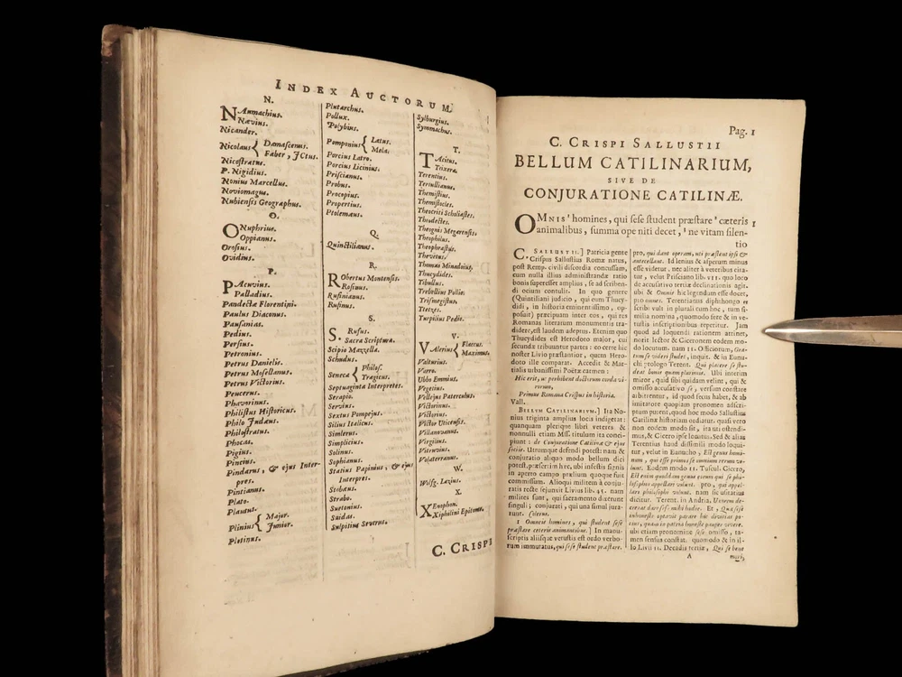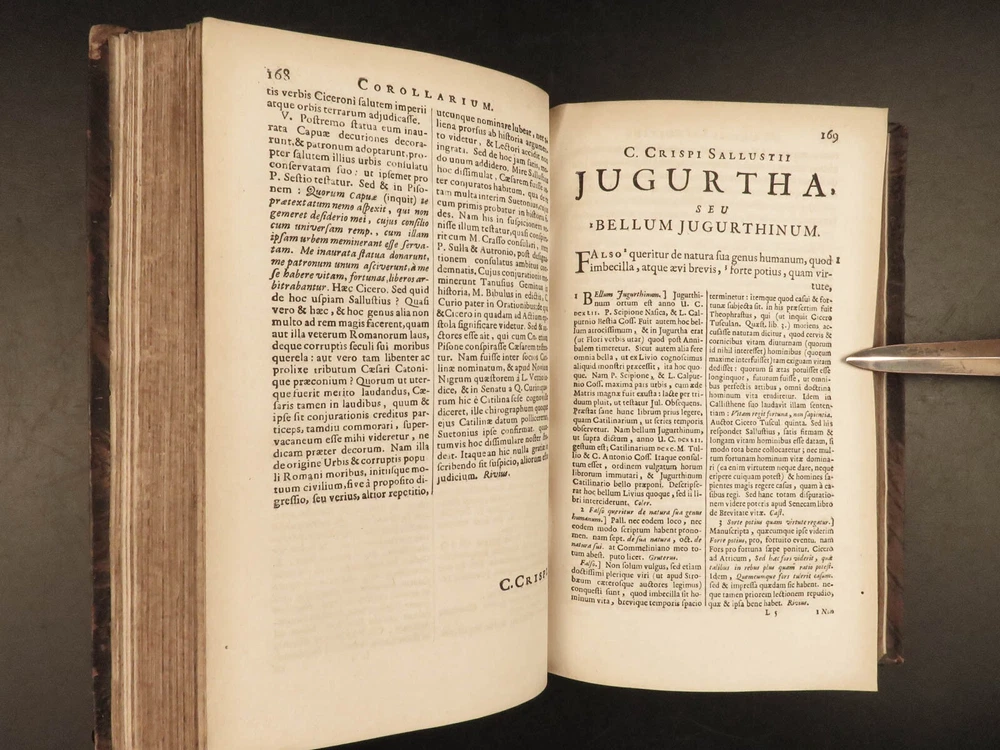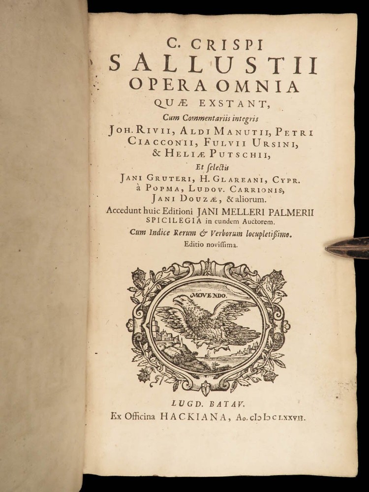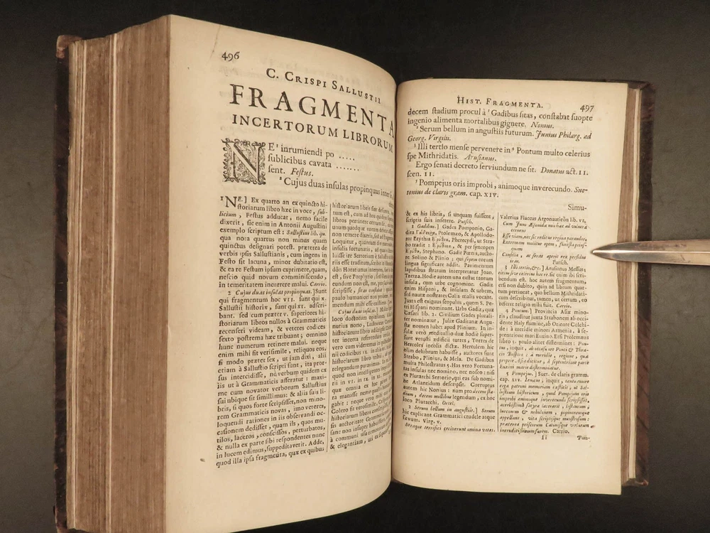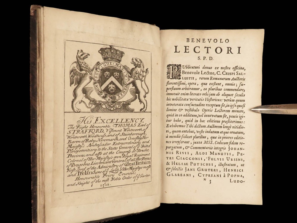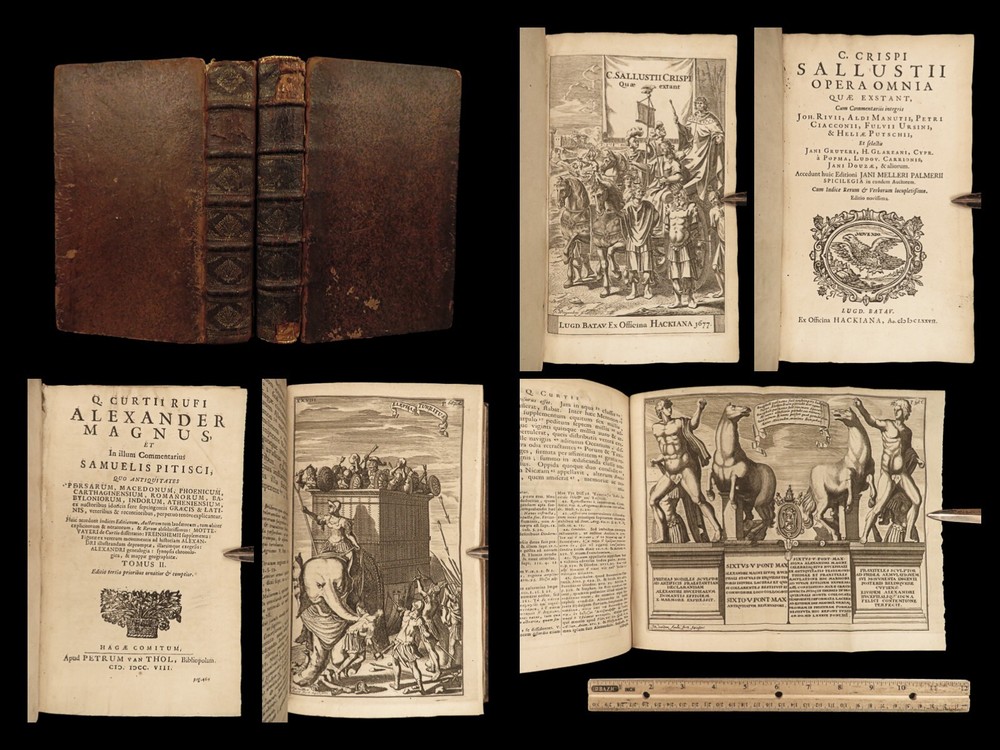 1677 Sallust Catiline Conspiracy Jugurthine War + 1708 Alexander the Great Rufus A rare pairing of two printings of ancient literature from Sallust and Curtius. Curtius Rufus is primarily remembered for his commentary on the life of Alexander the Great, perhaps the best early account of Alexander the Great’s reign. In addition to Curtius, this two-volume lot includes the works on the Catiline Conspiracy of Sallust with commentary by numerous contributions such as Johann Rivius, Janus Palmerius, and perhaps most famously Aldus Manutius. Item number: #23342 Price: $750 SALLUST C. Crispi Sallustii Opera omnia quae exstant, cum commentariis integris Joh. Rivii, Aldi Manutii, Petri Ciacconii, Fulvii Ursini, & Heliae Putschii, et selectia Jani Gruteri Lugd. Batavorum: Ex officina Hackiana, 1677. **WITH** RUFUS, Quintus Curtius Q. Curtii Rufi Alexander Magnus, et in illum commentarius Samuelis Pitisci, quo antiquitates Persarum, Macedonum, Phoenicum, Carthaginensium, Romanorum… tomus ii Hagae Comitum: apud Petrum van Thol, 1708. Details : · Collation: Complete with all pages; 2 works o Sallust – [28], 596, [38] o Curtius – [2], 469-855, [169] § 2 engraved plates (1 folding) · Provenance: Armorial Bookplate – Thomas Earl of Strafford, 1712 o Lieutenant-General Thomas Wentworth, 1st Earl of Strafford (of the 2nd creation), KG (1672–1739), was an English peer, diplomat and statesman who served as First Lord of the Admiralty under Queen Anne. He was a leading conspirator in the Atterbury Plot of 1720–1722 to restore the Stuarts to the throne, and was also a party to the Cornbury Plot of 1731–1735. · Language: Latin · Binding: Leather; tight and secure · Size : ~7.75in X 4.75in (19.5cm x 12.5cm) Our Guarantee: Very Fast. Very Safe. Free Shipping Worldwide. Customer satisfaction is our priority! Notify us with 7 days of receiving, and we will offer a full refund without reservation! 23342