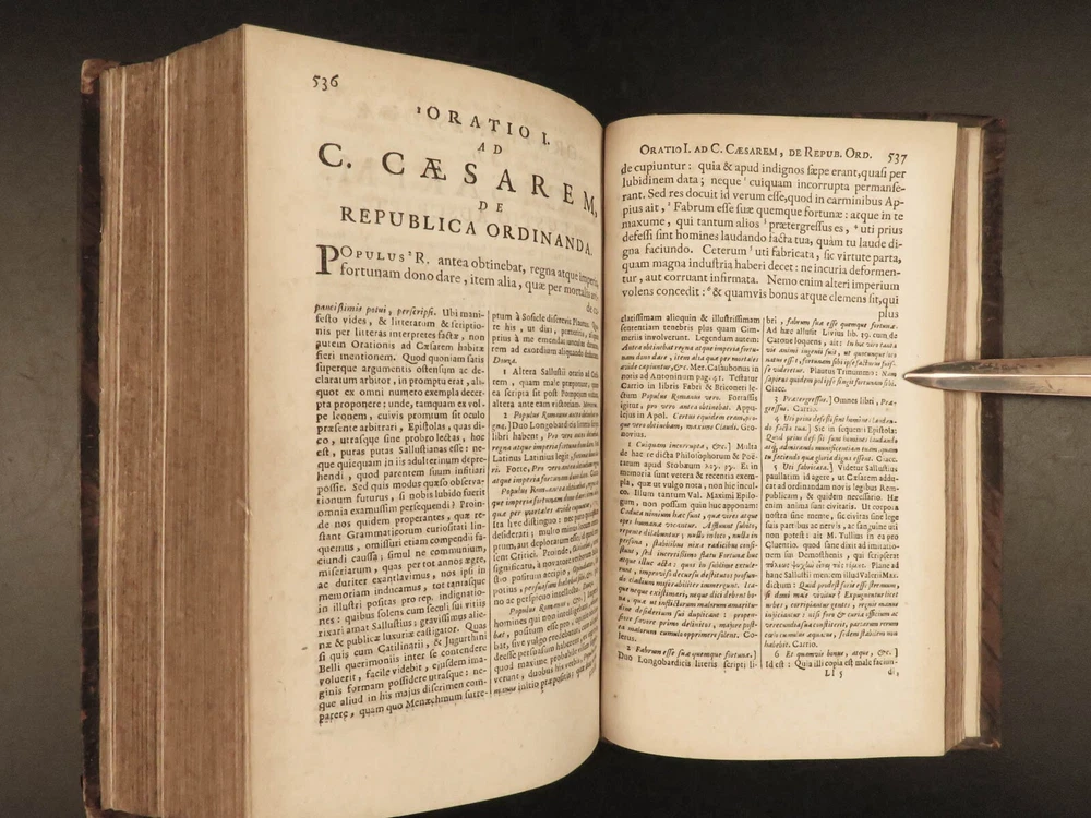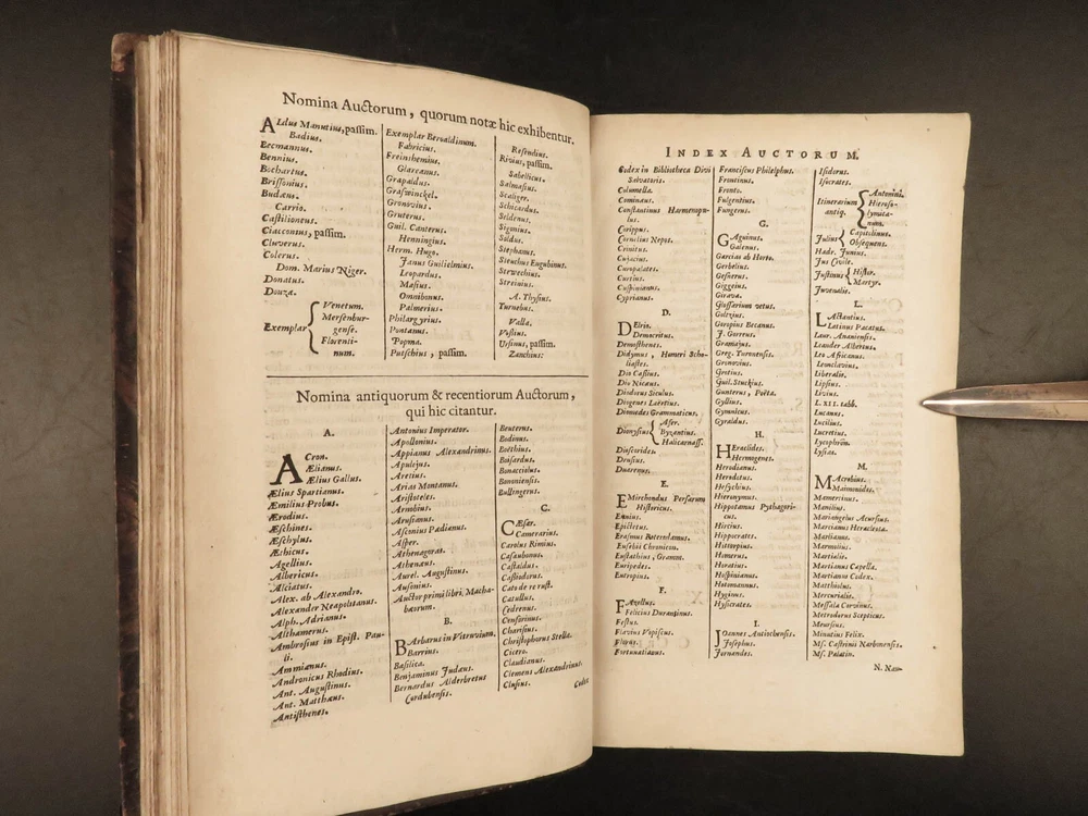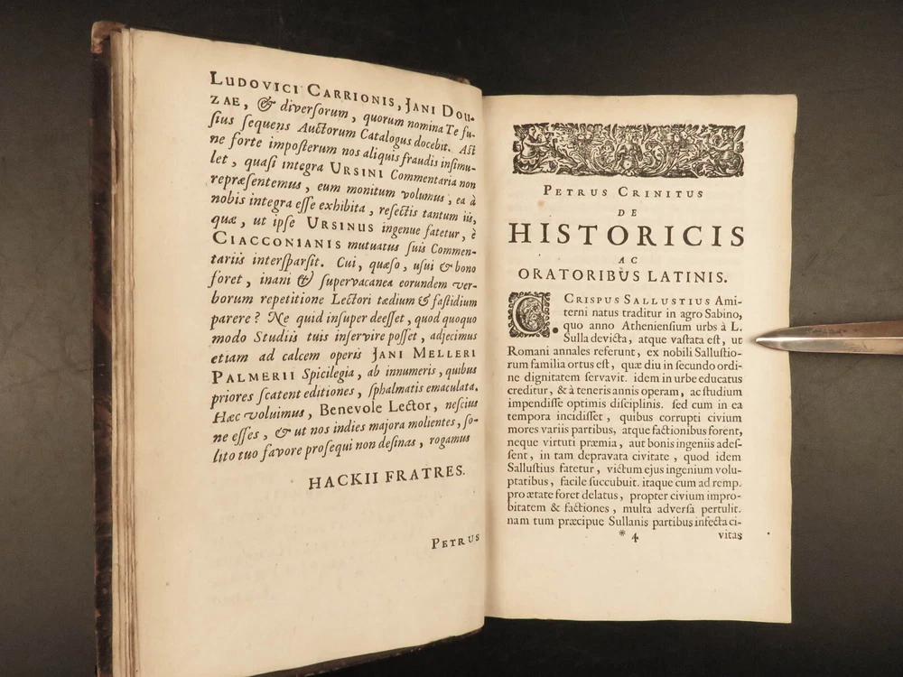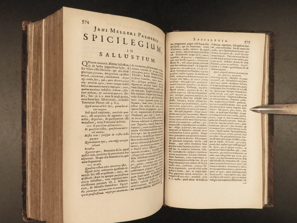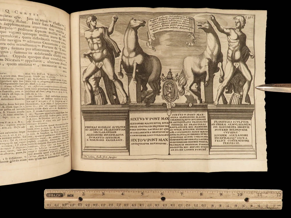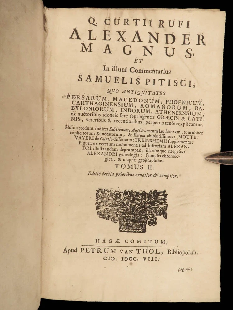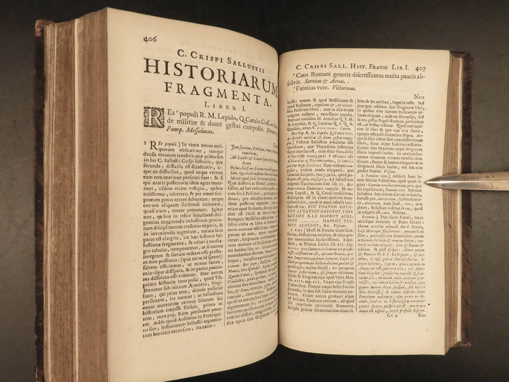 1677 Sallust Catiline Conspiracy Jugurthine War + 1708 Alexander the Great Rufus A rare pairing of two printings of ancient literature from Sallust and Curtius. Curtius Rufus is primarily remembered for his commentary on the life of Alexander the Great, perhaps the best early account of Alexander the Great’s reign. In addition to Curtius, this two-volume lot includes the works on the Catiline Conspiracy of Sallust with commentary by numerous contributions such as Johann Rivius, Janus Palmerius, and perhaps most famously Aldus Manutius. Item number: #23342 Price: $750 SALLUST C. Crispi Sallustii Opera omnia quae exstant, cum commentariis integris Joh. Rivii, Aldi Manutii, Petri Ciacconii, Fulvii Ursini, & Heliae Putschii, et selectia Jani Gruteri Lugd. Batavorum: Ex officina Hackiana, 1677. **WITH** RUFUS, Quintus Curtius Q. Curtii Rufi Alexander Magnus, et in illum commentarius Samuelis Pitisci, quo antiquitates Persarum, Macedonum, Phoenicum, Carthaginensium, Romanorum… tomus ii Hagae Comitum: apud Petrum van Thol, 1708. Details : · Collation: Complete with all pages; 2 works o Sallust – [28], 596, [38] o Curtius – [2], 469-855, [169] § 2 engraved plates (1 folding) · Provenance: Armorial Bookplate – Thomas Earl of Strafford, 1712 o Lieutenant-General Thomas Wentworth, 1st Earl of Strafford (of the 2nd creation), KG (1672–1739), was an English peer, diplomat and statesman who served as First Lord of the Admiralty under Queen Anne. He was a leading conspirator in the Atterbury Plot of 1720–1722 to restore the Stuarts to the throne, and was also a party to the Cornbury Plot of 1731–1735. · Language: Latin · Binding: Leather; tight and secure · Size : ~7.75in X 4.75in (19.5cm x 12.5cm) Our Guarantee: Very Fast. Very Safe. Free Shipping Worldwide. Customer satisfaction is our priority! Notify us with 7 days of receiving, and we will offer a full refund without reservation! 23342