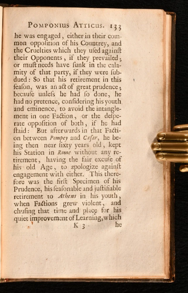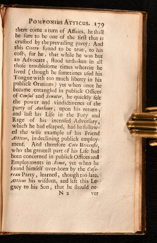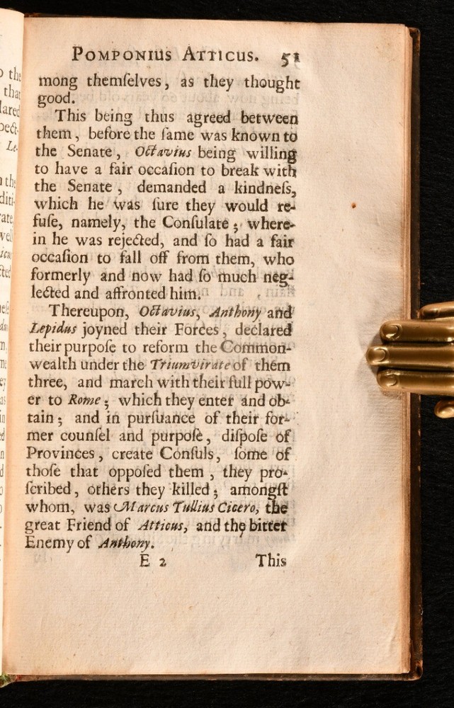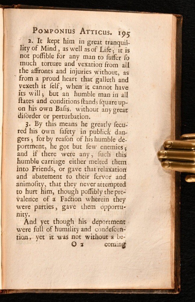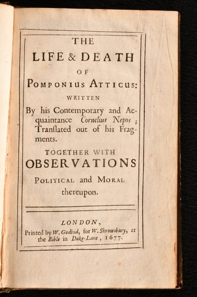 Click here to see our other books! The Life and Death of Pomponius Atticus Cornelius Nepos 1677 W. Godbid : London 7" by 4.5" [14], 242, [5pp] SUMMARY A scarce English translation of Cornelius Nepos' biography on his contemporary Pomponius Atticus, the affluent Roman figure. Leather Binding,Scarce Overall Condition: Good This book weighs 0.5 KG when packed UK Postage: £ 3.99 US Postage: £ 15.99 EU Postage : £ 13.99 European Postage: £ 14.99 Asia Postage: £ 18.99 Worldwide Postage: £ 19.99 DESCRIPTION A scarce work. ESTC citation number R3408. Final errata leaf and two final addenda leaves are present. A biography on Titus Pomponius Atticus by his contemporary, Cornelius Nepos, compiled from Nepos' fragments. Pomponius Atticus was a Roman editor, banker, and patron of letters, who lives from c.110BC to the 31st March 32BC. Atticus is now best remembered for his correspondence and friendship with Marcus Tullius Cicero. He was from a wealthy Roman family of the equestrian class, and was a close friend of Cicero from childhood. They often wrote their correspondence in a subtle code in order to disguise their political observations. Nepos is known for his critical biographies, including his parallel lives 'De Viris Illustribus'. Translated into English by Sir Matthew Hale. Ink mark to the recto to the front endpaper. CONDITION In the original full calf binding. Externally, generally smart, with a little rubbing and marking to the boards and spine. Minor bumping to the spine and extremities. Small chips to the spine label. Hinges are strained but remain firm. Ink mark to the recto to the front endpaper. Internally, firmly bound. Pages are lightly age-toned and generally clean with some spots. Overall Condition: Good GLOSSARY OF TERMS Overall Condition (Dustwrapper condition rating is shown after that for the book itself, where a dustwrapper is present) Fine - Very well preserved copy showing very little wear Very Good Indeed - Only one or two minor faults, really a very attractive copy Very Good - Quite a wide term meaning no major faults but probably several smaller ones often expected given the age of the book, but still a respectable copy Good - Meaning not very good. Some more serious faults as will be described in the condition report under 'condition' Good Only - Meaning one or more faults that could really do with repair Fair - As with good only above but with other faults leaving a compromised copy even after repair Poor - Really bad and possibly seriously incomplete. We only sell books in this condition where their rarity or value makes them attractive none the less. Major defects will be described. GUARANTEE We offer a full money back guarantee on our descriptions. Please ask for details and conditions. We prefer PAYPAL. If you pay via PAYPAL we will post the item off the same or the next working day with the postage you have selected. Please note we cannot accept USD cheques
