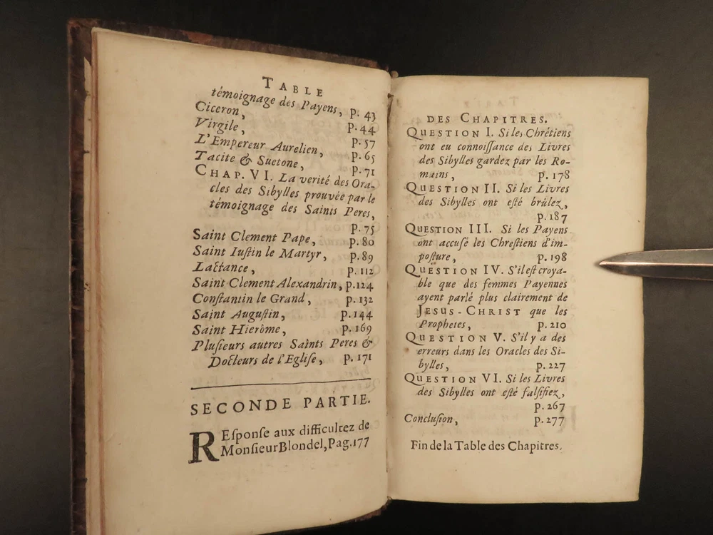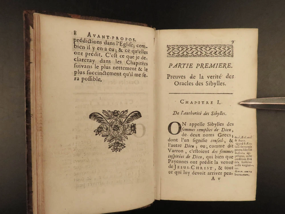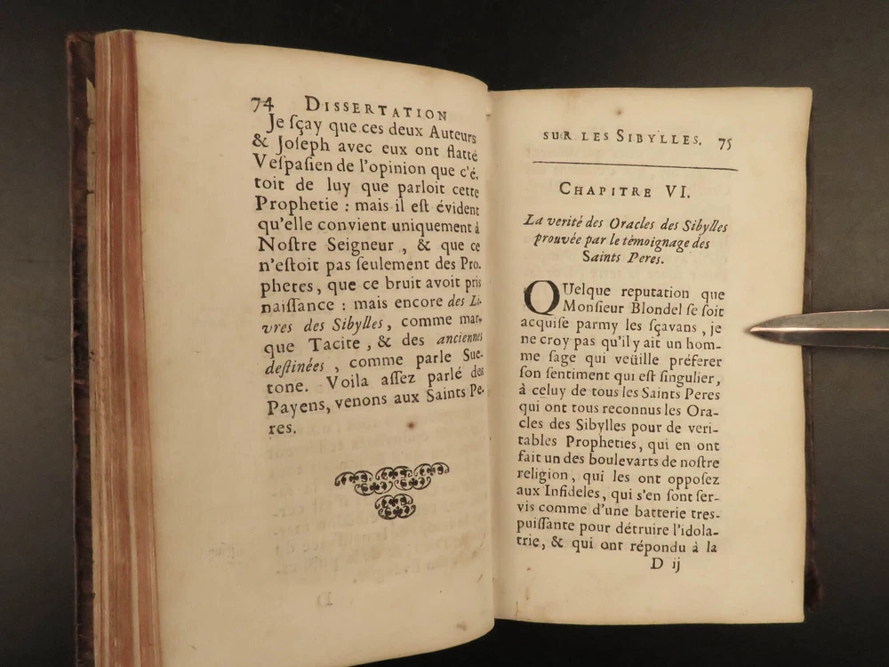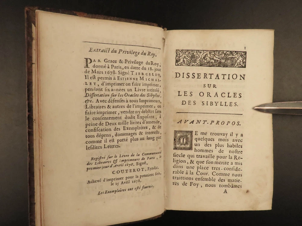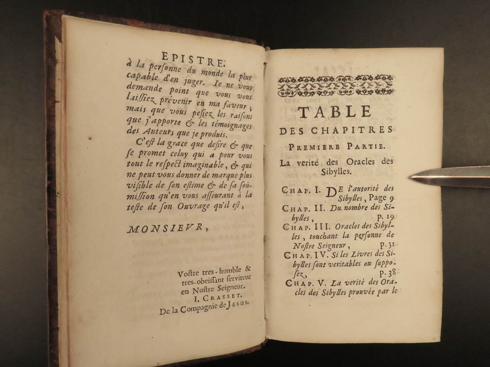 1678 1 ed Sibylline Oracles PAGAN Prophecy Occult Philosophy RARE Jesuit Crasset Jean Crasset was a 17 th -century French Jesuit who was best known for his treatises of asceticism and philosophy. One of his many books was ‘ Dissertation on the Oracles of Sibyl’ . At the end of the 17 th -century several treatises were written on the Sibylline Oracles many of which focused on the pagan origins of the oracles. Crasset, according to Buitenwerf, “firmly believed that the Sibylline Oracles were divine utterances of the Greek prophetess Sibyl.” Crasset sought to prove that the Sibylline Oracles were nothing more than false Christian narratives, He also defended the early church fathers who wrote that the Oracles were genuinely written by Sibyls, making references to great philosophers and historians such as Suetonius and Saint Augustine and his famous ‘City of God’ . Item number: #20488 Price: $550 CRASSET, Jean Dissertation sur les Oracles des Sibylles Paris: chez Estienne Michallet, 1678. First edition. Details : · Collation: Complete with all pages o [12], 282 · References: Rieuwerd Buitenwerf, ‘ Book III of the Sibylline Oracles and its Social Setting’ · Provenance: Handwritten – N. Froissard · Language: French · Binding: Leather; tight and secure · Size : ~6.25in X 3.75in (15.5cm x 9.5cm) Our Guarantee: Very Fast. Very Safe. Free Shipping Worldwide. Customer satisfaction is our priority! Notify us with 7 days of receiving, and we will offer a full refund without reservation! 20488