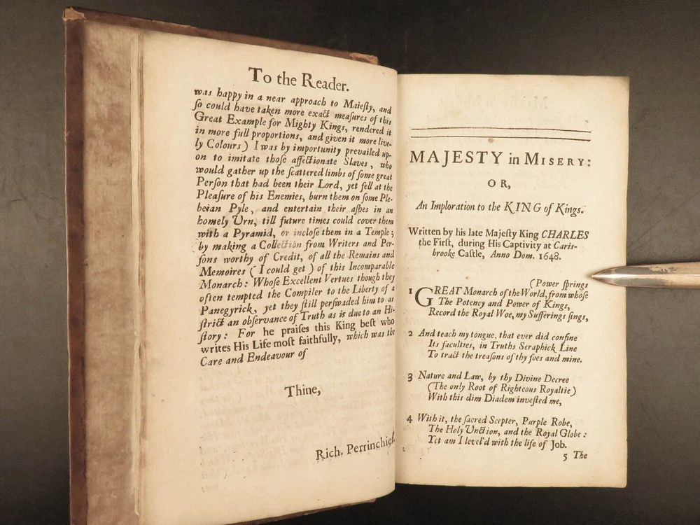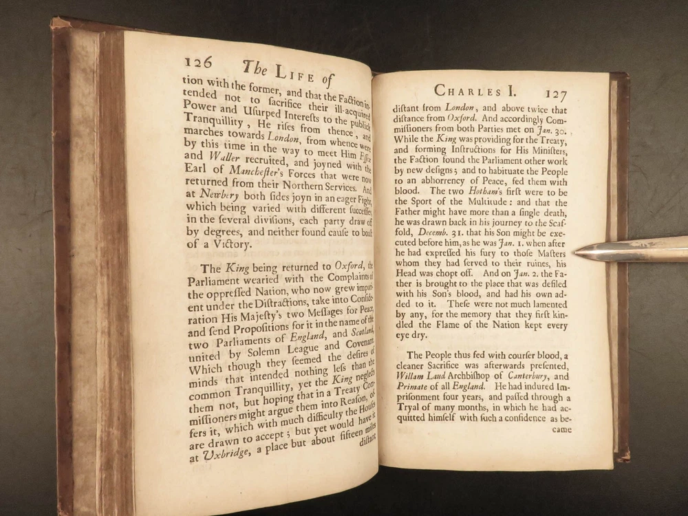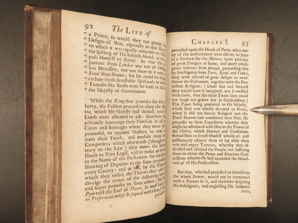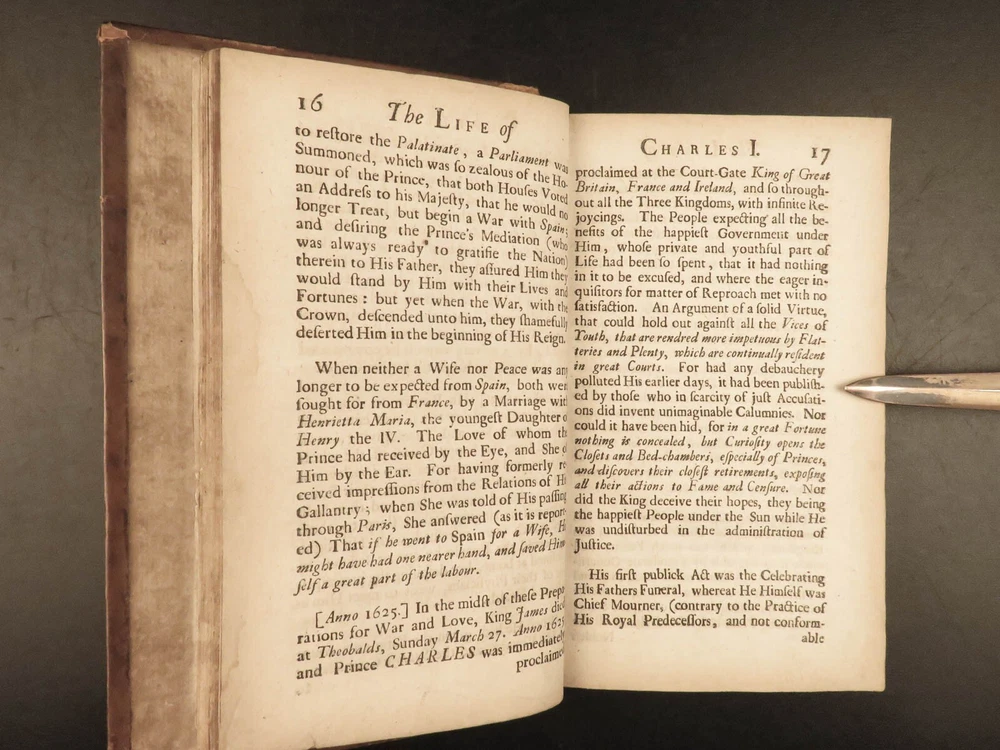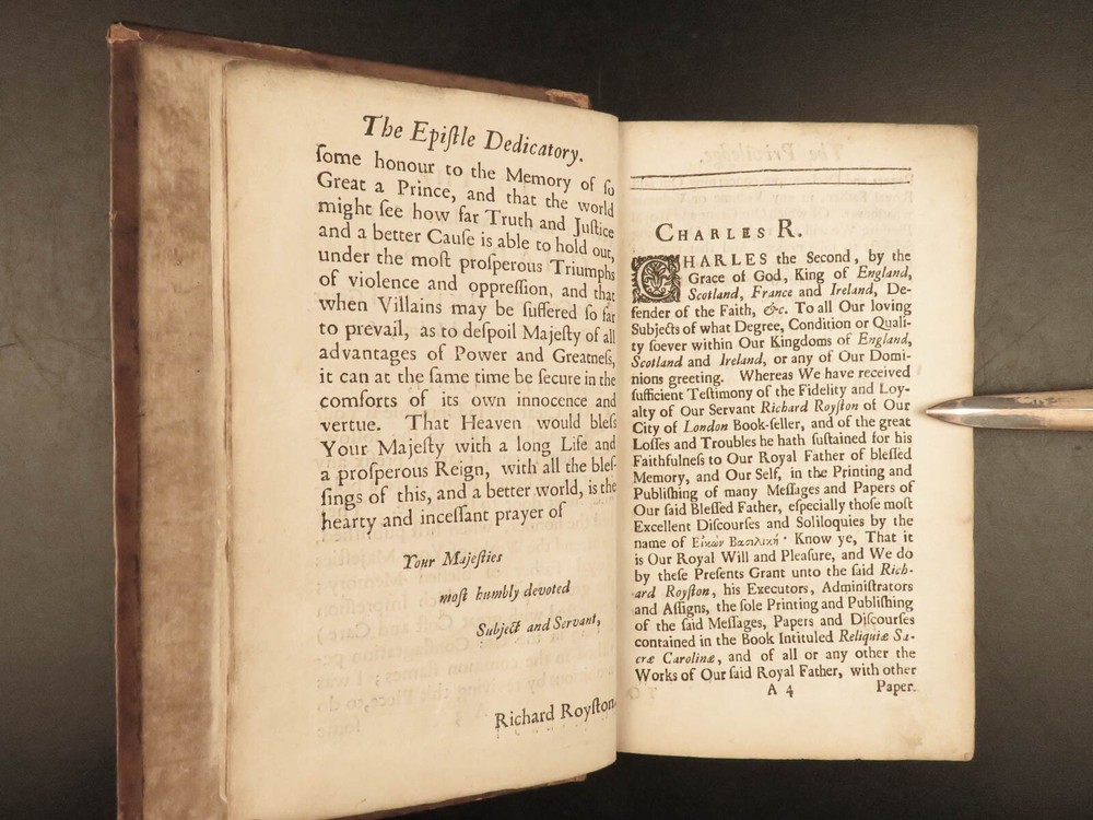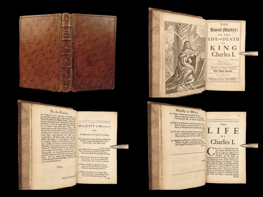 1684 King Charles I England Royal Martyr Perrinchief Queen Anne London Royalist Richard Perrinchief was a 17 th -century Royalist known for serving as a biographer for King Charles I. Following Charles I’s execution, Perrinchief published a survey of his life which included many of the writings of Charles himself. Perrinchief, like other royalists, wanted the death of Charles to not be in vain and wanted his legacy to be honored. It includes the state of the throne during and after Charles, on the death of Queen Anne, on the Battle of Naseby, the censure of Charles’ wealth and fortune, trial, and much more. Item number: #22922 Price: $750 PERRINCHIEF, Richard The royal martyr; or, The life and death of King Charles I London: Printed by J.M. for R. Royston, 1684. Details : · Collation: Complete with all pages o [12], 288, [10] o Engraved frontispiece · Language: English · Binding: Leather; tight and secure · Size : ~7.5in X 4.75in (18.5cm x 11.5cm) Our Guarantee: Very Fast. Very Safe. Free Shipping Worldwide. Customer satisfaction is our priority! Notify us with 7 days of receiving, and we will offer a full refund without reservation! 22922