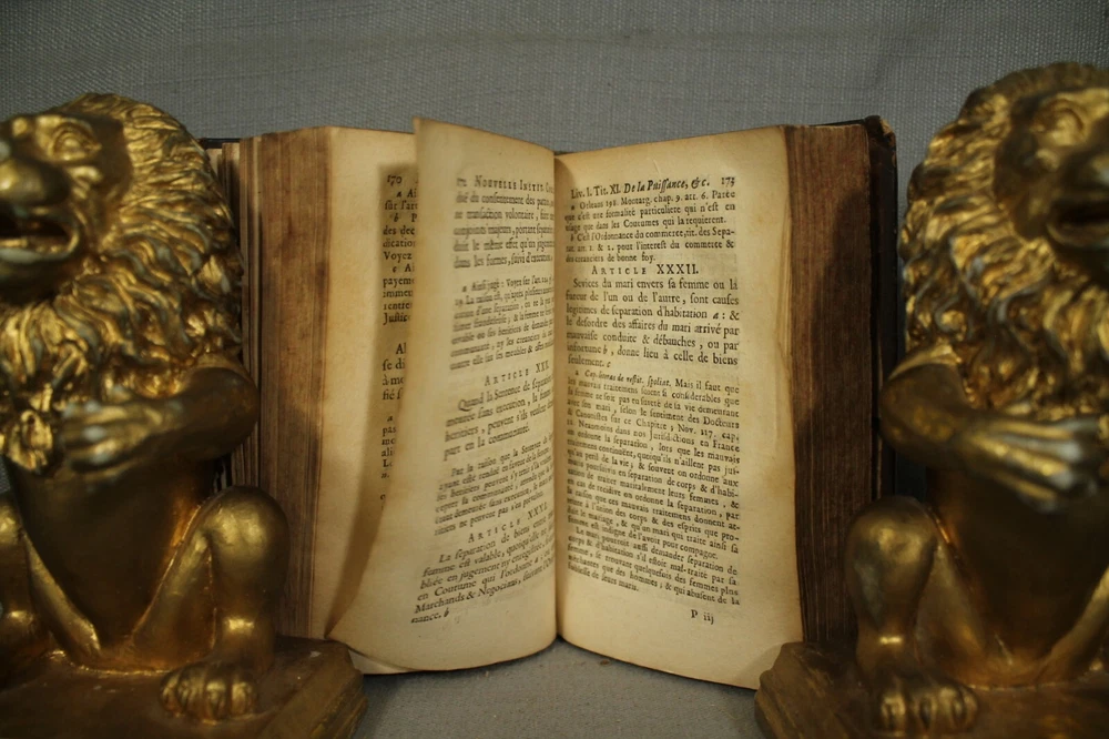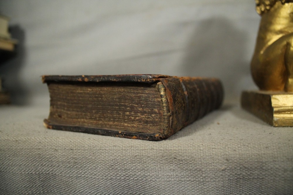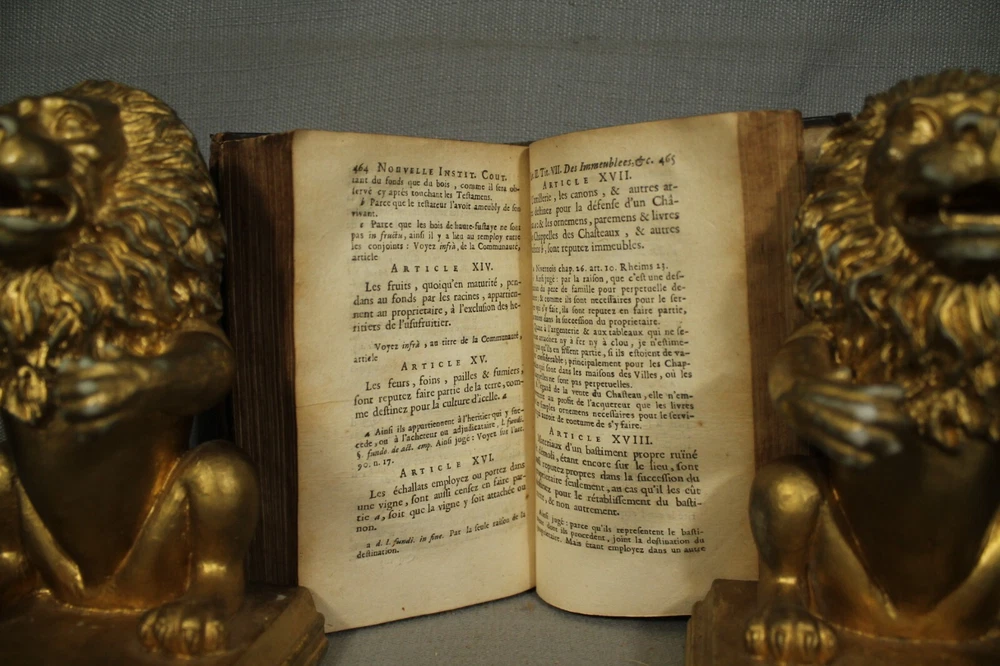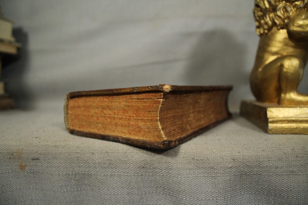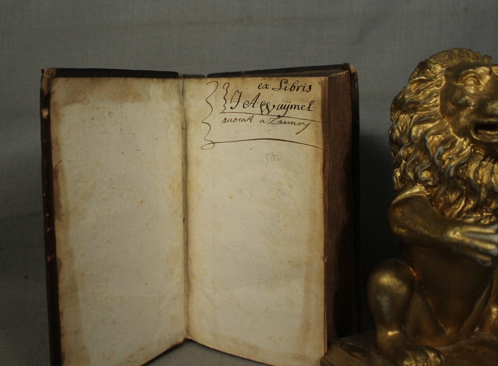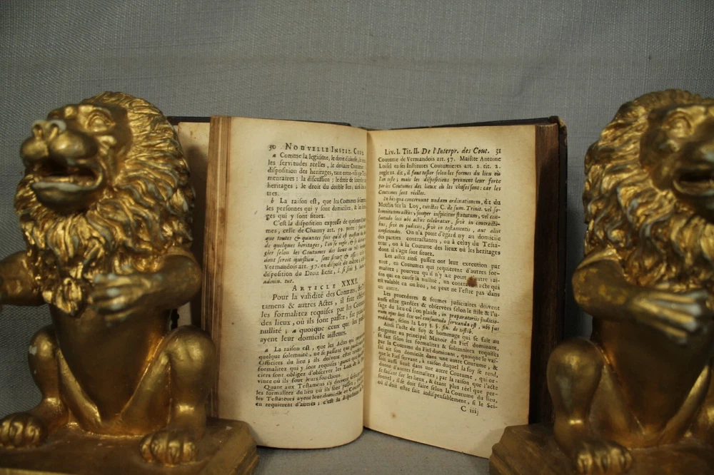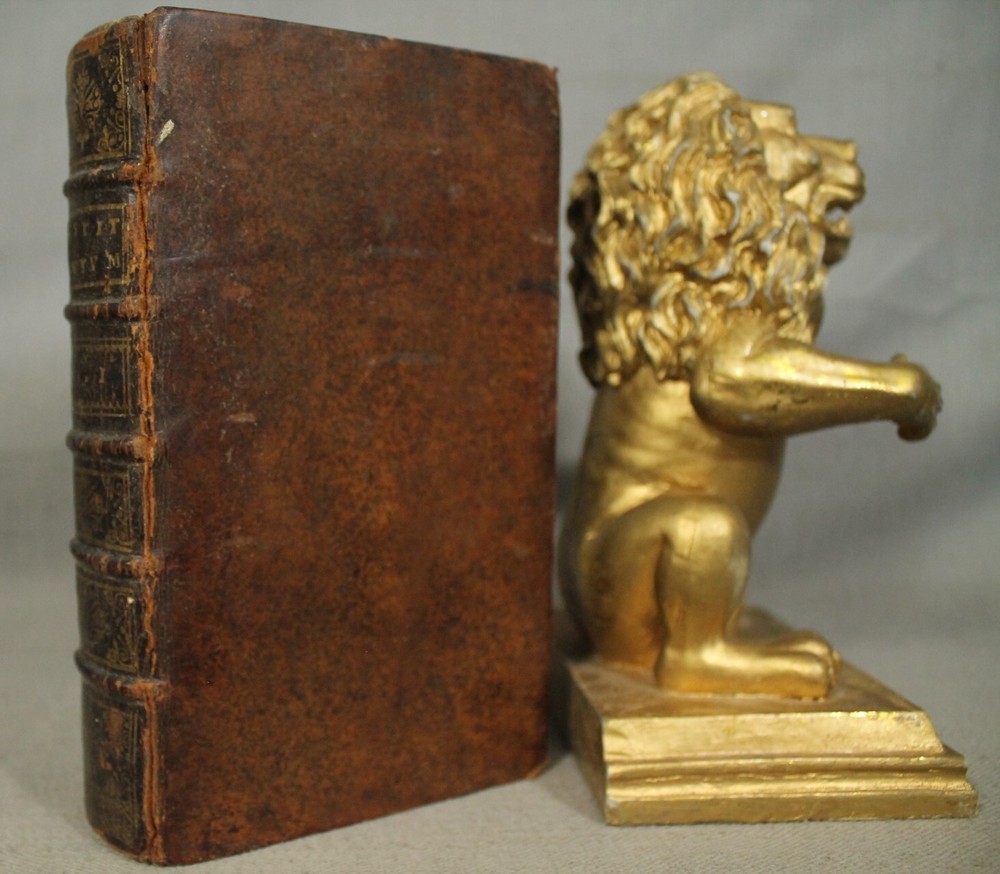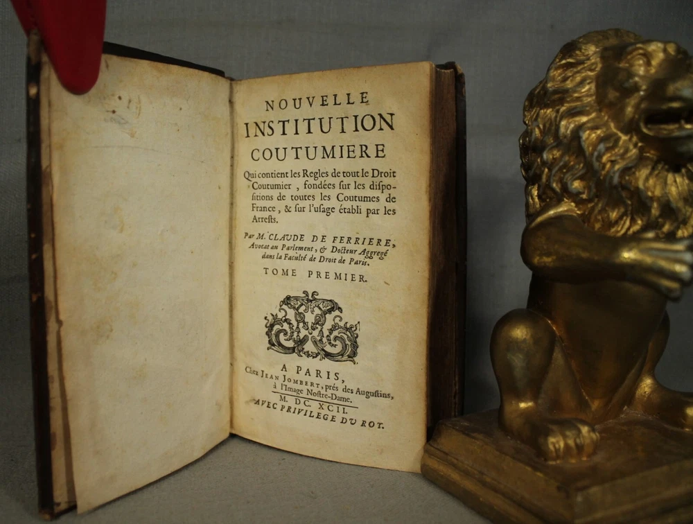 Antique old French law book Nouvelle Institution Coutumiere by M Claude De Ferriere Tome Premier published in Paris, Chez Jean Jombert, pres des Augustines a l'Image Nostre Dame in 1692. book measures 6 5/8" by 4 1/8" good leather binding with wear, edge wear, cracking along spine edges. rubbing, scuffing, spots. spots yellowing on endpapers, name. 584 pages overall good with various amounts of light yellowing/age toning. some small spots here or there. . please look at the photographs loc. upstairs hall yes.
