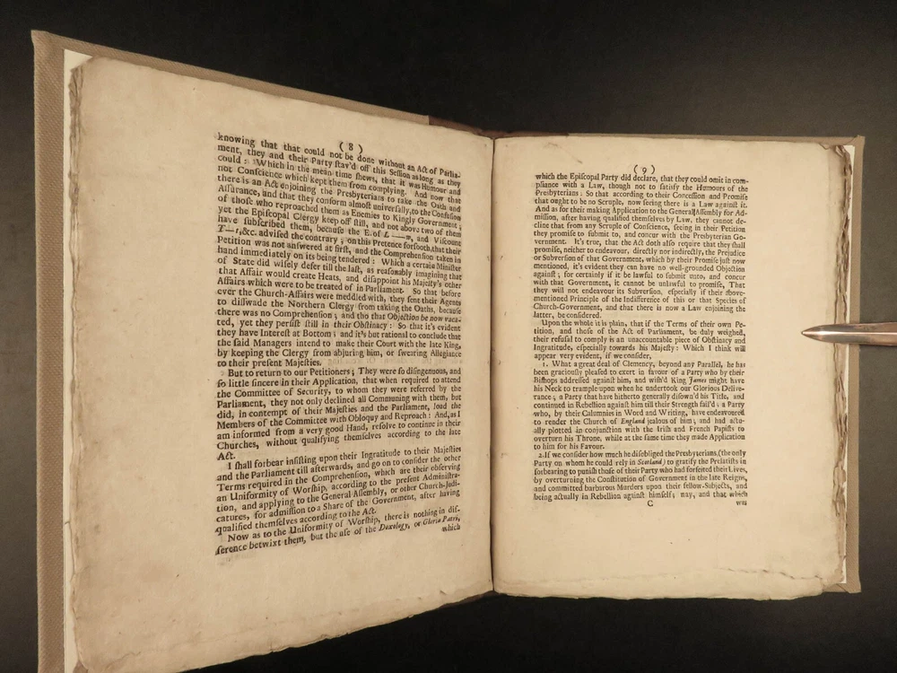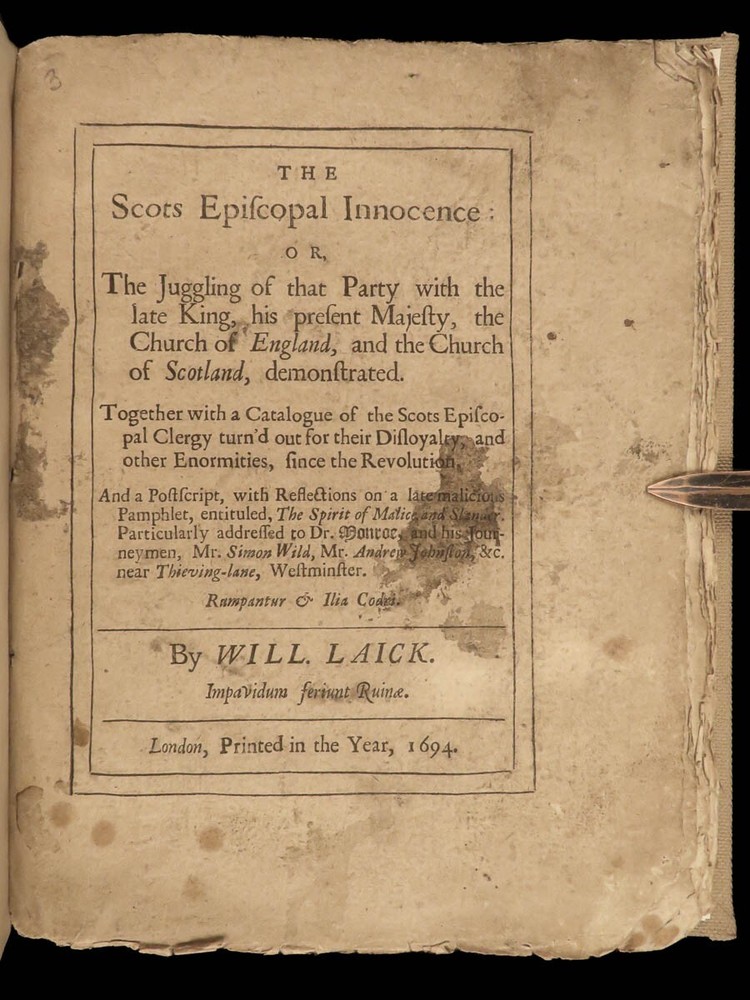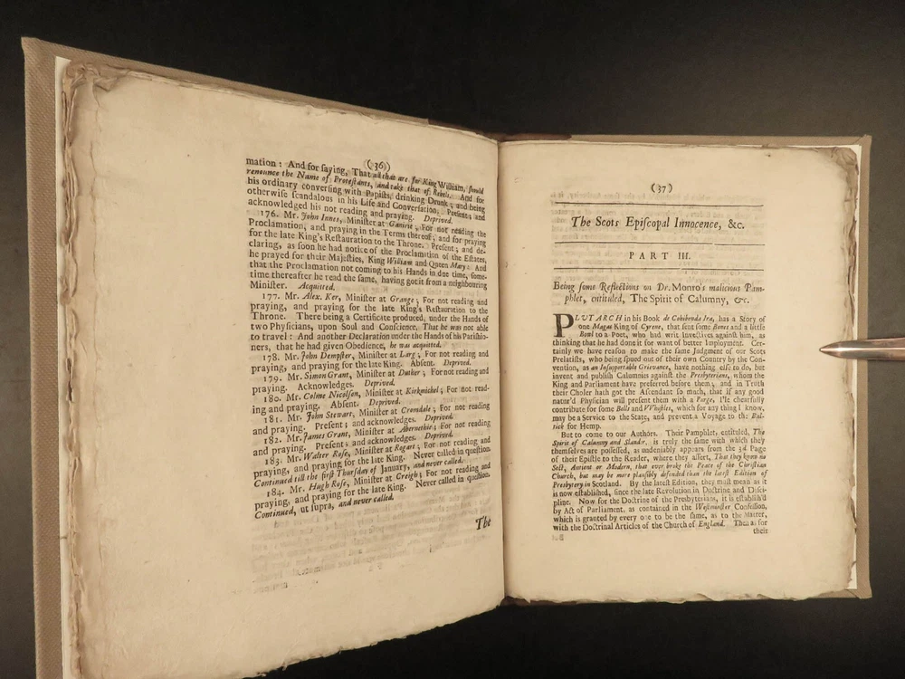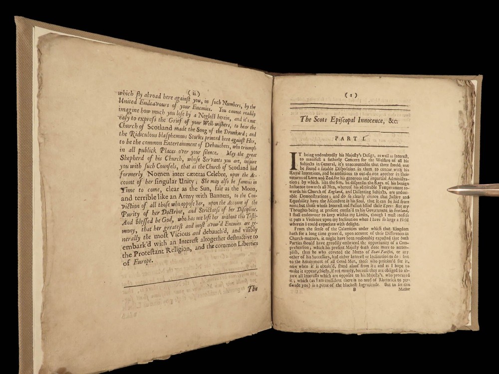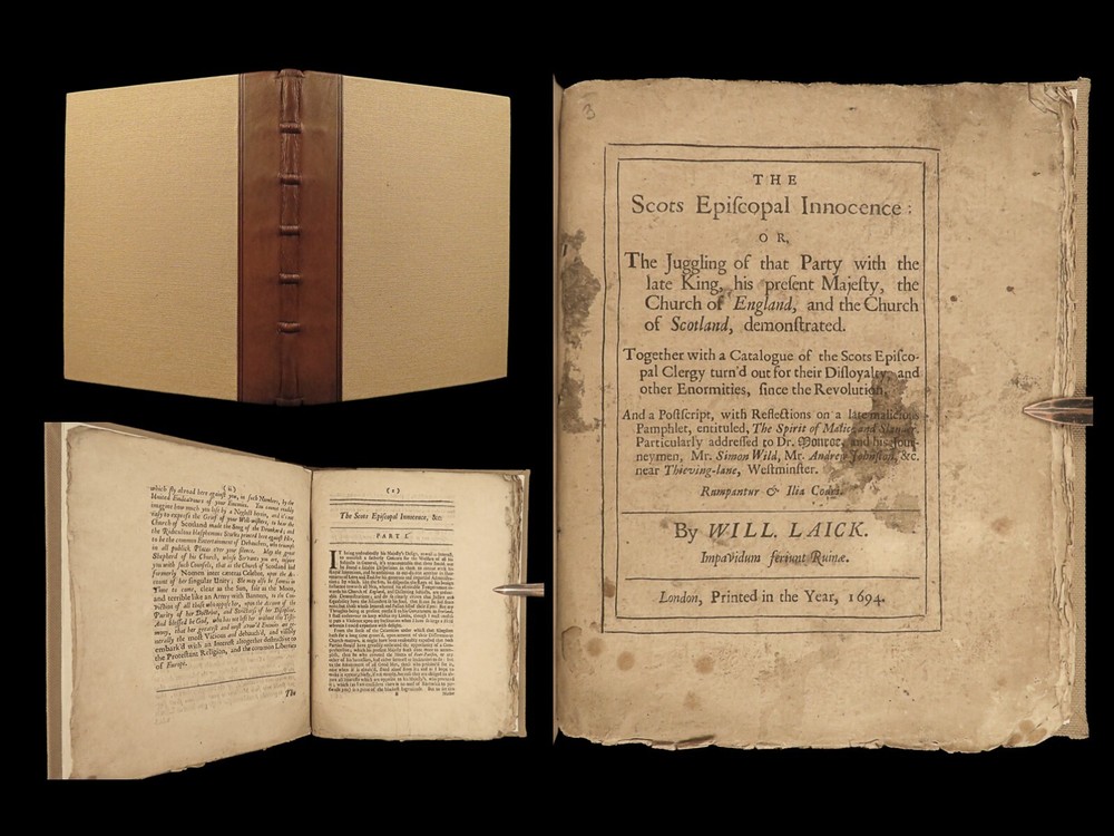 1694 SCOTLAND 1 ed Ridpath Scots Episcopal Innocence Scottish Treason Politics George Ridpath was a 17 th -century Scottish author following the Glorious Revolution. As a prominent Whig apologist, Ridpath published many of his more controversial works under the pseudonym Will Laick, including his attacks on the Scottish episcopal party. One work from these attacks was his “ Scots Episcopal Innocence ” – a short pamphlet identifying the failures of the party, accusations of treason, and the disloyalty of the Scottish clergy and their disregard for the Order of the State, King William, and Queen Mary. Item number: #22531 Price: $750 RIDPATH, George The Scots episcopal innocence, or, The juggling of that party with the late King London: printed in the year, 1694. First edition. Details : · Collation: Complete with all pages o [2], ii, 68 · References: Wing R 1465 · Language: English · Binding: Leather; tight and secure · Size : ~9.25in X 7.25in (23cm x 18.5cm) · quite rare Our Guarantee: Very Fast. Very Safe. Free Shipping Worldwide. Customer satisfaction is our priority! Notify us with 7 days of receiving, and we will offer a full refund without reservation! 22531