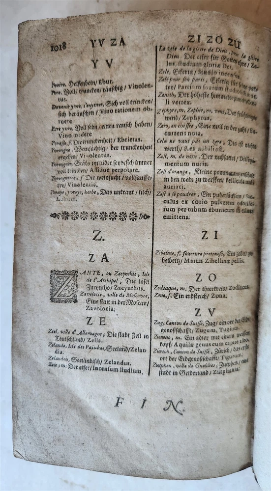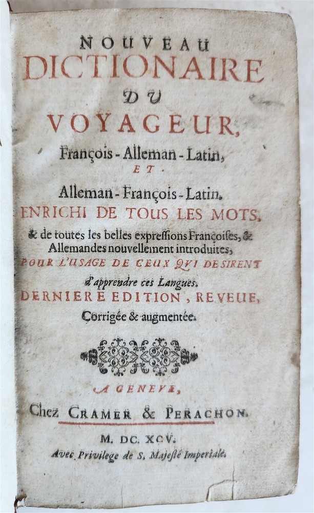 Nouveau Dictionaire du Voyageur Francois-Alleman-Latin... Derniere edition Geneva, Cramer & Perachon; 1695 3 lvs, 1018 pages Size 4 1/2 by 7 1/3" Original leather binding, spine with raised bands, gilt decorated, with title label Good condition ===================== Please see my other auctions Thank You Refund Policy: We will issue a FULL REFUND, 100% money back if you are not satisfied with your purchase. Items must be returned to us within 20 days in order to receive a refund or replacement. Buyer is responsible for shipping costs. Powered by SixBit's eCommerce Solution