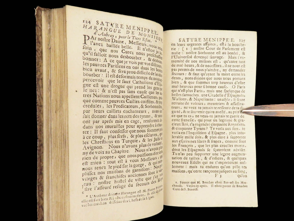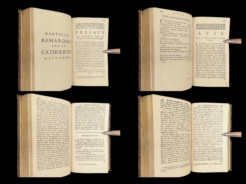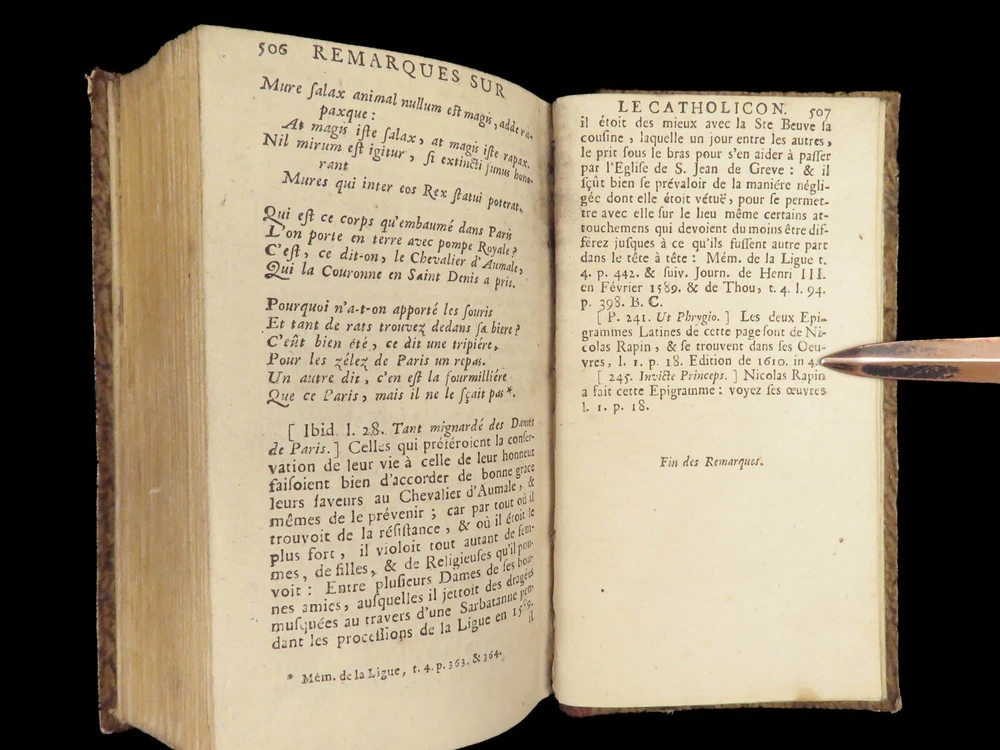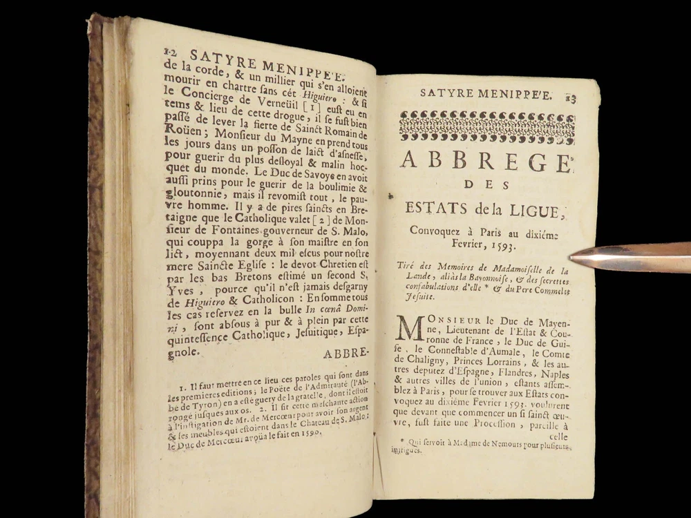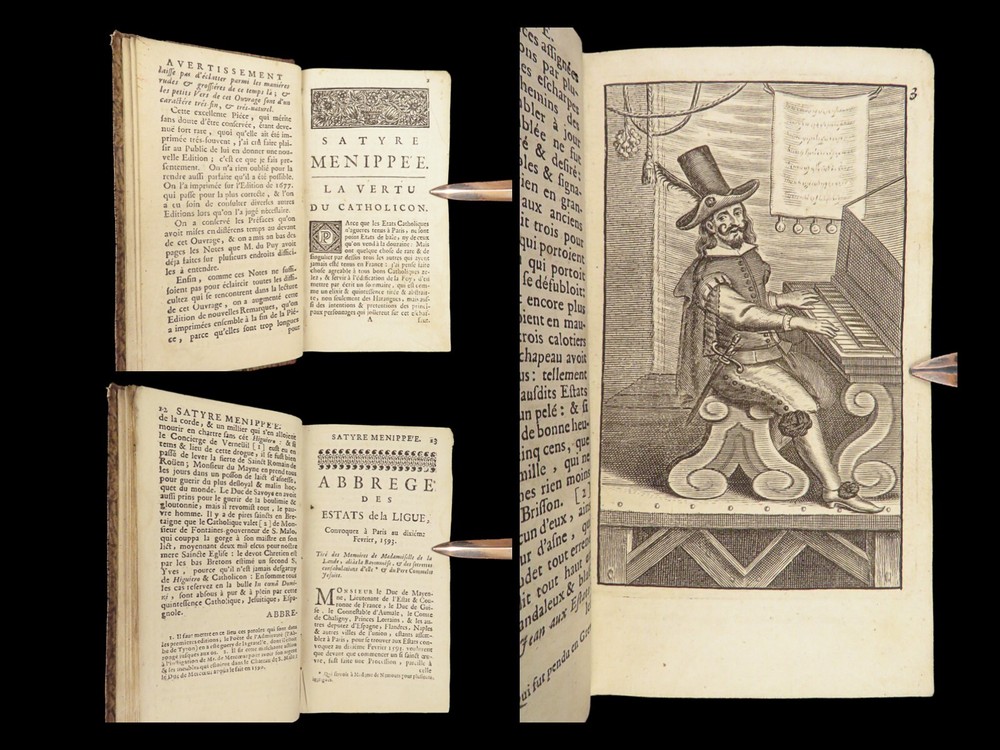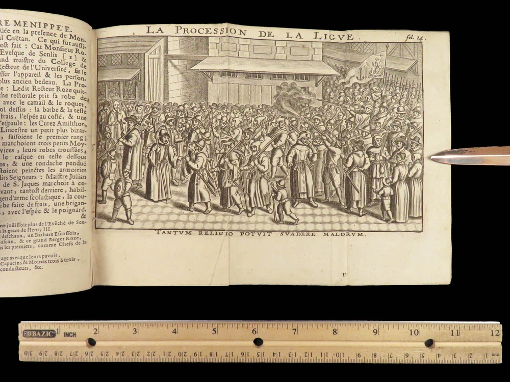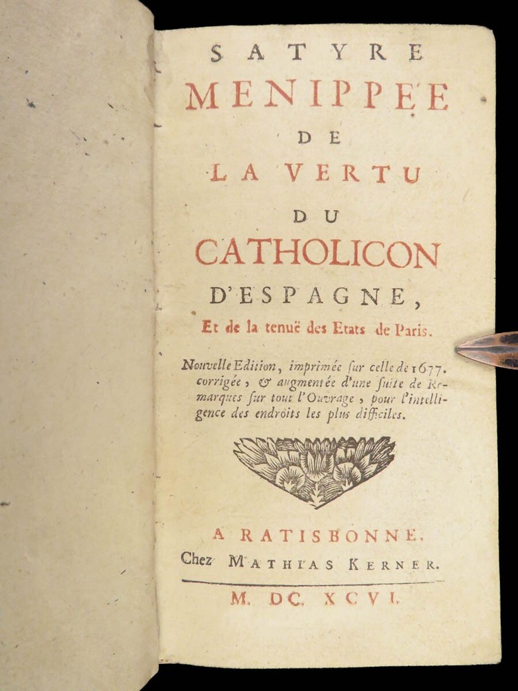 1696 Menippean Satire Catholic LEAGUE Spain France Religion Wars Elzevier A rare first edition of The Menippee Satire – a political work of prose and satire which criticized the Catholic League and Spain during the French Religious Wars. This fine printing features a beautiful and detailed engraving of the Catholic League procession. This book of prose and verse was collected by numerous authors including Jacques Gillot, Florent Chrestien, Nicolas Rapin, Pierre le Roy, Jean Passerat, Gilles Durant, and others. This edition, addressed to Brussels (Ratisbonne) actually comes from the presses of Foppens, which is attached to the Elzevier collection. This 1696 edition includes the Catholic League processional engraving. Item number: #26963 Price: $599 Catholic Church Satyre Menippée de la vertu du catholicon d'Espagne; et de la tenuë des Estats de Paris A Ratisbonne [i.e. Bruxelles] : Chez Mathias Kerner [i.e. François Foppens], 1696. Details : · Collation: Complete with all pages o [4], 507, [1] o 3 engravings (1 folding) · References: Burnet V 145; Willems 2007 · Language: French · Binding: Leather; tight and secure · Size : ~6in X 3.5in (15cm x 8.5cm) Our Guarantee: Very Fast. Very Safe. Free Shipping Worldwide. Customer satisfaction is our priority! Notify us with 7 days of receiving, and we will offer a full refund without reservation! 26963