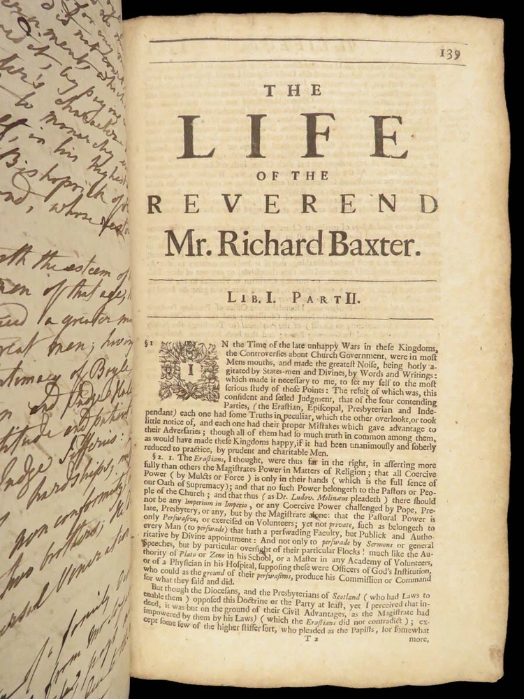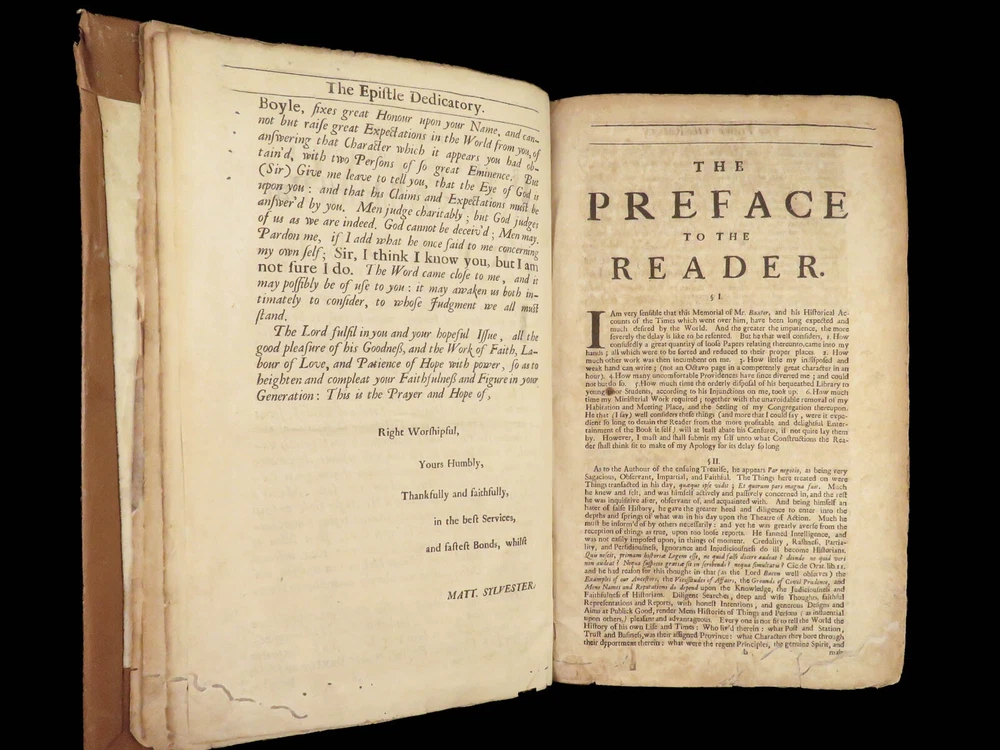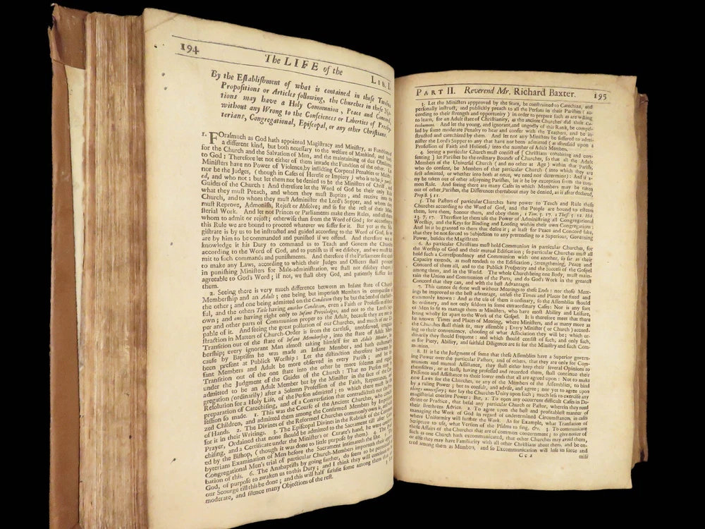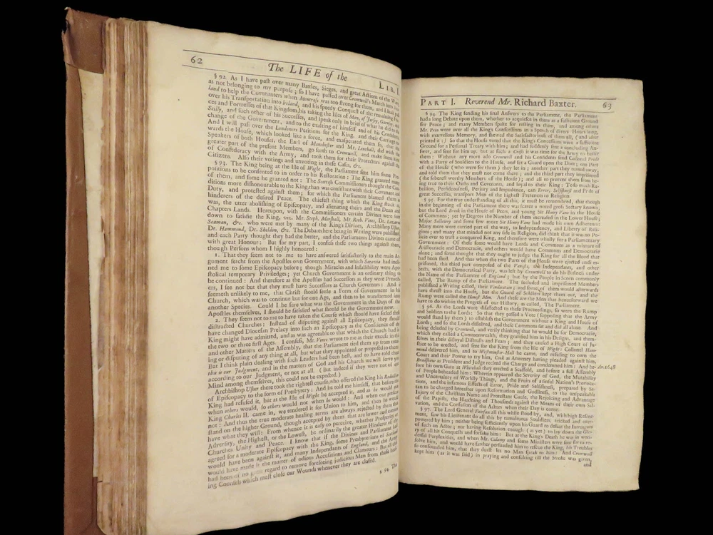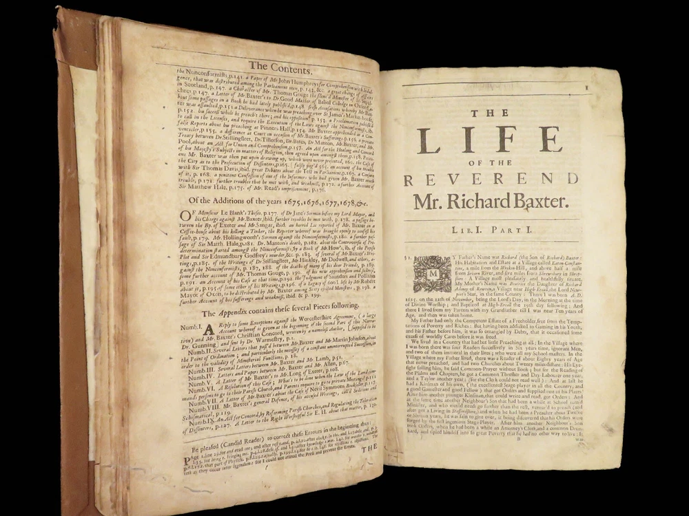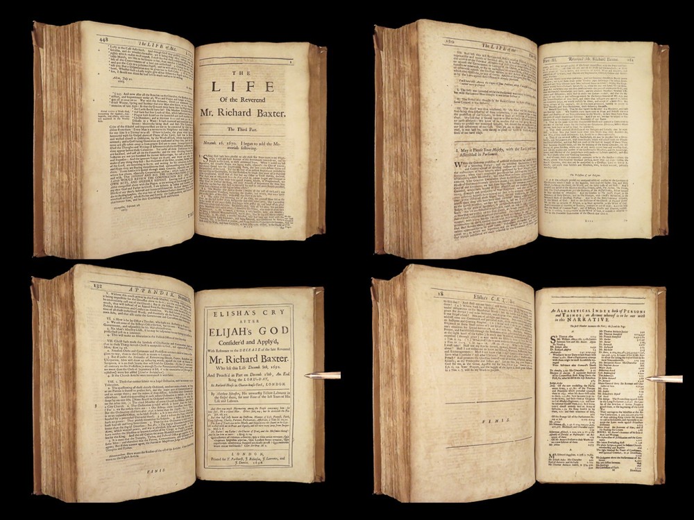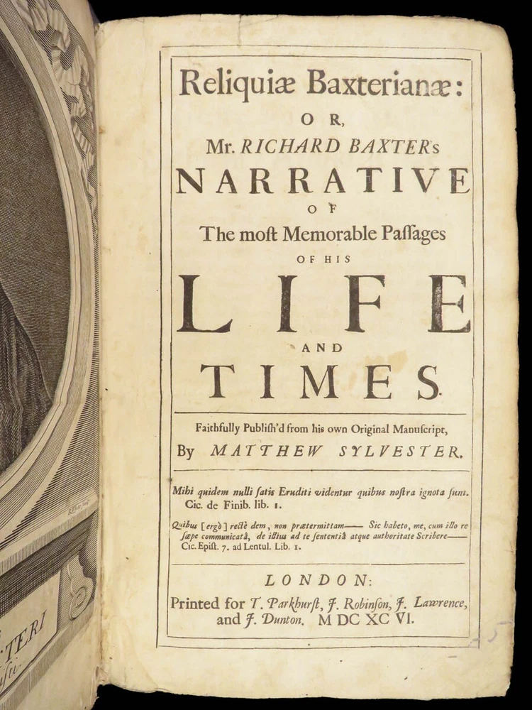 1696 Richard Baxter English Civil War Autobiography | 1 st Reliquiae Baxteriana “Lay siege to your sins, and starve them out by keeping away the food and fuel which is their maintenance and life.” ― Richard Baxter Richard Baxter was one of the most important 17 th -century English Puritan Nonconformist leaders. While best known for his work ‘ Saints Everlasting Rest ’, he published an autobiography entitled “ Reliquiae Baxterianae ” in which he describes the most notable events in his life. The most significant aspect of this book includes his role in the English Civil Wars, serving as a chaplain in the parliamentary army all while advocating for limiting the monarchy. He also describes his efforts to promote religious tolerance in a post-restoration England. This 1696 first edition was edited and collected by Matthew Sylvester, Baxter’s greatest advocate. Item number: #28280 Price: $1500 BAXTER, Richard Reliquiae Baxterianae, or, Mr. Richard Baxter's narrative of the most memorable passages of his life and times London : printed for T. Parkhurst, J. Robinson, J. Lawrence, and J. Dunton, 1696. First edition. Details : · Collation: Complete with all pages o Reliquiae Baxterianae – [28], 448, 200, 132 § Includes portrait frontispiece § Pagination errors expected o Elisha’s Cry – [2], 18, [8] § Includes separate title page · Provenance: Handwritten o John Stubbs, 1696 o [ Rushwood Bridgenorth, died 1793 ] · Language: English · Binding: Leather; tight and secure · Size: ~12.75in X 8.25in (32.5cm x 21.5cm) · VERY rare and desirable with auction records and price comparisons between $6600-$9100 Our Guarantee: Very Fast. Very Safe. Free Shipping Worldwide. Customer satisfaction is our priority! Notify us with 7 days of receiving, and we will offer a full refund without reservation!
