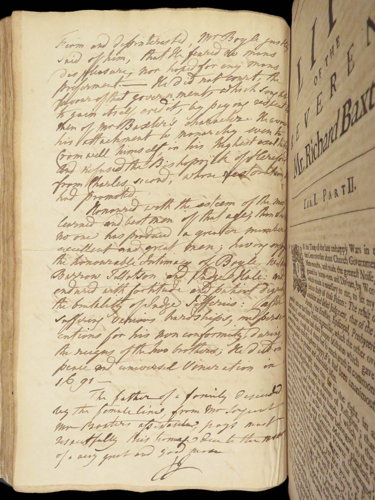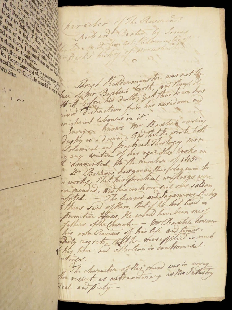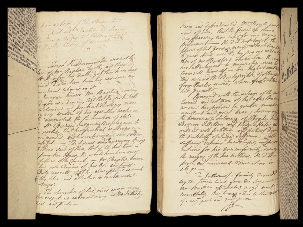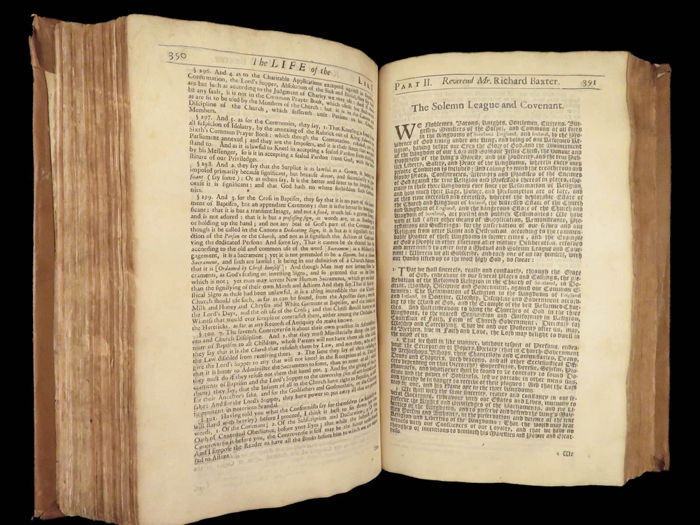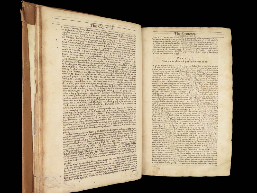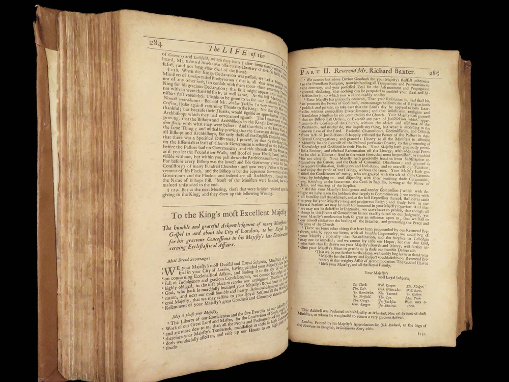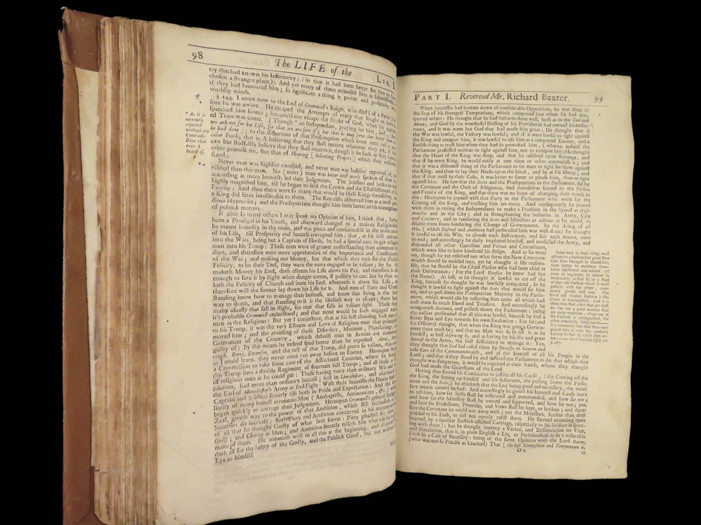 1696 Richard Baxter English Civil War Autobiography | 1 st Reliquiae Baxteriana “Lay siege to your sins, and starve them out by keeping away the food and fuel which is their maintenance and life.” ― Richard Baxter Richard Baxter was one of the most important 17 th -century English Puritan Nonconformist leaders. While best known for his work ‘ Saints Everlasting Rest ’, he published an autobiography entitled “ Reliquiae Baxterianae ” in which he describes the most notable events in his life. The most significant aspect of this book includes his role in the English Civil Wars, serving as a chaplain in the parliamentary army all while advocating for limiting the monarchy. He also describes his efforts to promote religious tolerance in a post-restoration England. This 1696 first edition was edited and collected by Matthew Sylvester, Baxter’s greatest advocate. Item number: #28280 Price: $1500 BAXTER, Richard Reliquiae Baxterianae, or, Mr. Richard Baxter's narrative of the most memorable passages of his life and times London : printed for T. Parkhurst, J. Robinson, J. Lawrence, and J. Dunton, 1696. First edition. Details : · Collation: Complete with all pages o Reliquiae Baxterianae – [28], 448, 200, 132 § Includes portrait frontispiece § Pagination errors expected o Elisha’s Cry – [2], 18, [8] § Includes separate title page · Provenance: Handwritten o John Stubbs, 1696 o [ Rushwood Bridgenorth, died 1793 ] · Language: English · Binding: Leather; tight and secure · Size: ~12.75in X 8.25in (32.5cm x 21.5cm) · VERY rare and desirable with auction records and price comparisons between $6600-$9100 Our Guarantee: Very Fast. Very Safe. Free Shipping Worldwide. Customer satisfaction is our priority! Notify us with 7 days of receiving, and we will offer a full refund without reservation!