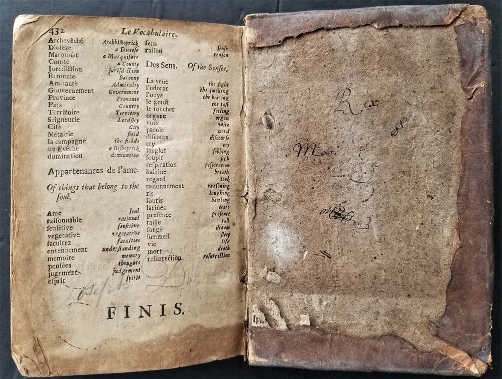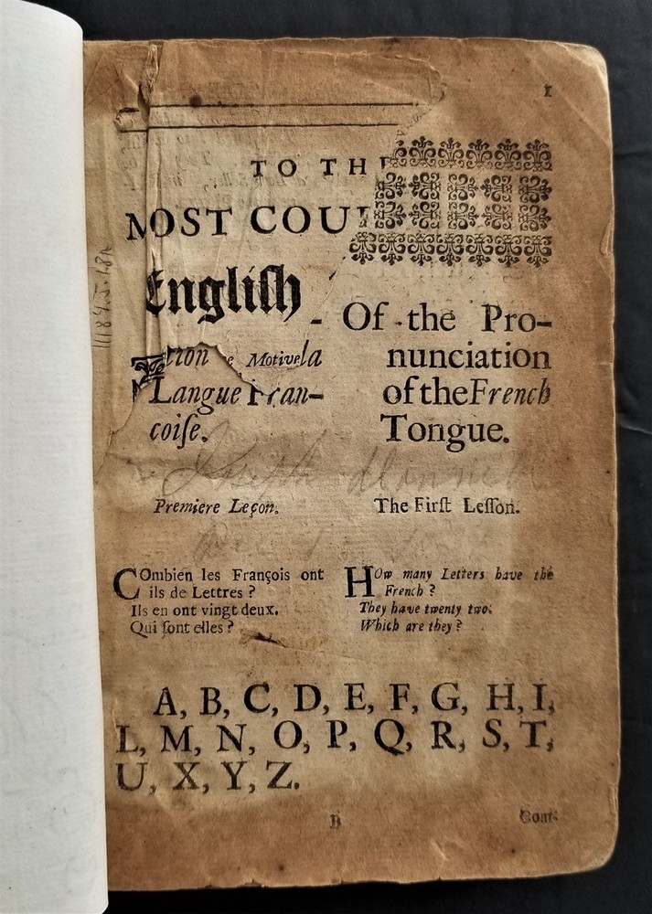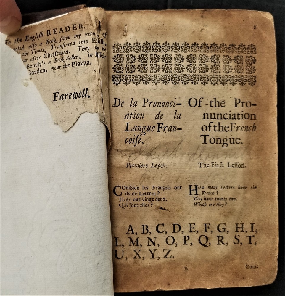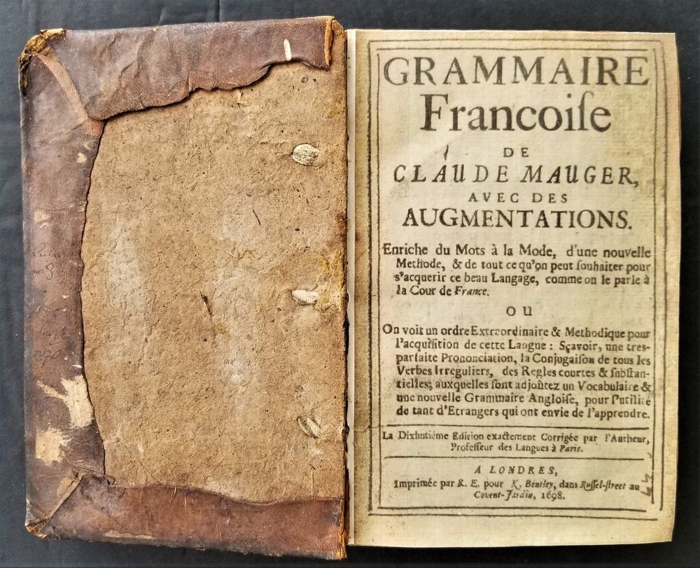 1698 antique MAUGERs FRENCH GRAMMAR grammaire francoise de claude mauger leather SCROLL DOWN for MORE PHOTOS in DESCRIPTION Click HERE to view or search ANTIQUE.COTTAGE listings. This listing is for the hardcover, leather over board book, 6.5"x4" with 432 pages with text in English and French. "Grammaire Francoise de Claude Mauger avec de augmentations. Enriche du Mots a' la Mode. [etc...]. La Dixhtieme Edition. A Londres, Imprimee par R. E. pour K. Bentley, dans RUssel-street au Covent-Jardin, 1698." CONDITION : See listing description and photos. **missing original title page - the present title page is a facsimile printed on 18th century laid paper**; missing front & rear end-papers; front spine edge cracked & split the entire length of the front board - the board is still attached securely by cords; vertical crack through center of spine; wrinkle in leather on front board;spine leather cracking, torn & chipping on edges; losses to leather along edges of boards; leather on spine & boards rubbed, worn & scratched; corners well worn, exposed & rounded; edges worn; missing majority of dedication page - only a small fragment of the upper left corner of the dedication remains; stains,age toning, & foxing spots throughout the entire contents; ink notations scattered throughout; ink & pencil scribbles on last page & inside rear board; - International buyers are responsible to pay VAT or other Taxes to their countries as required. - eBAY collects and remits sales tax on behalf of several states. If you are a dealer, you can write to eBay to file a form to become tax exempt. LOC: LOC2: BOOKBOX03-TMK Powered by SixBit's eCommerce Solution