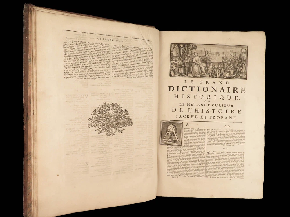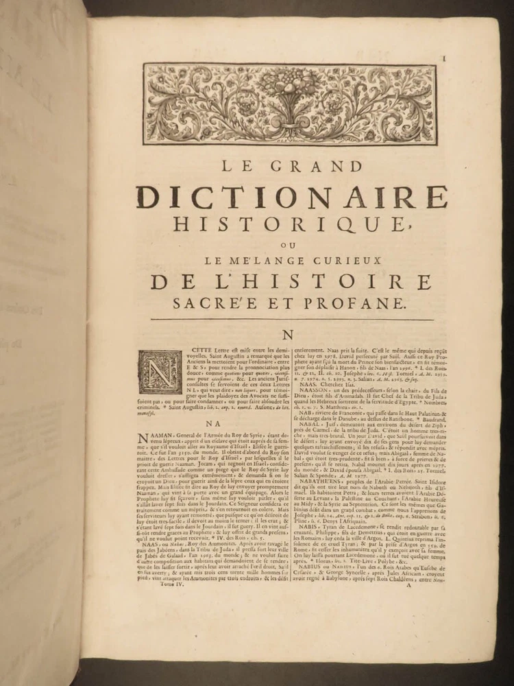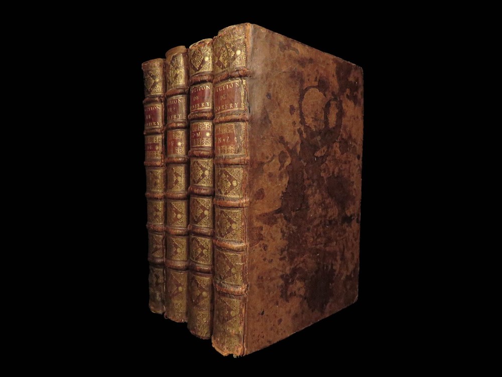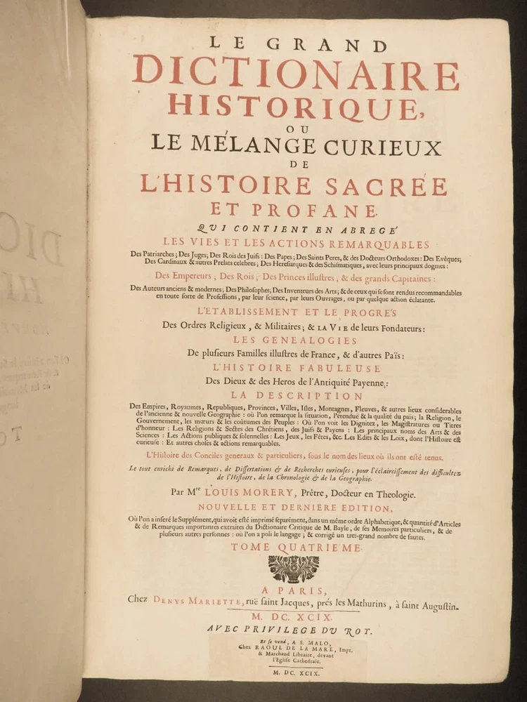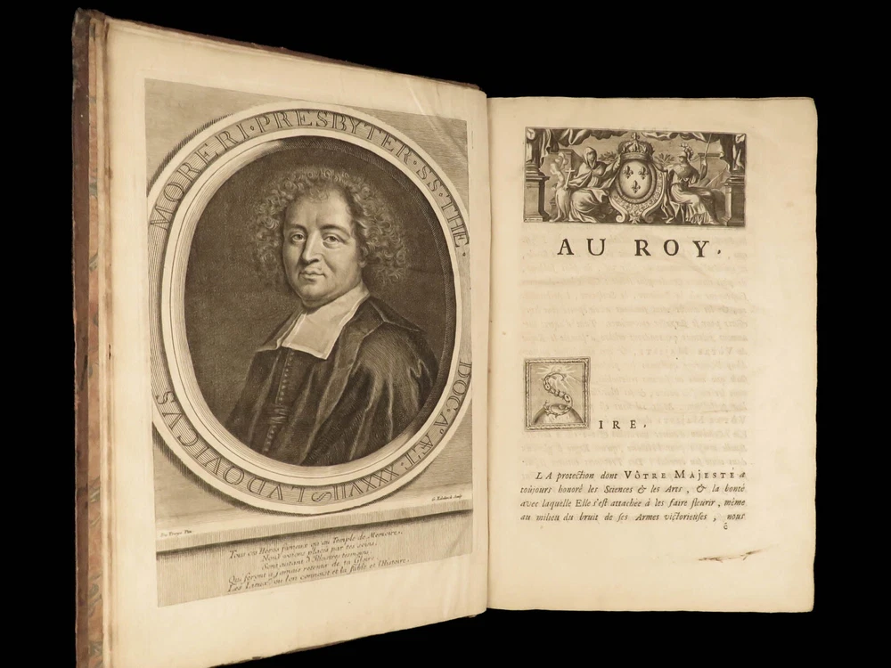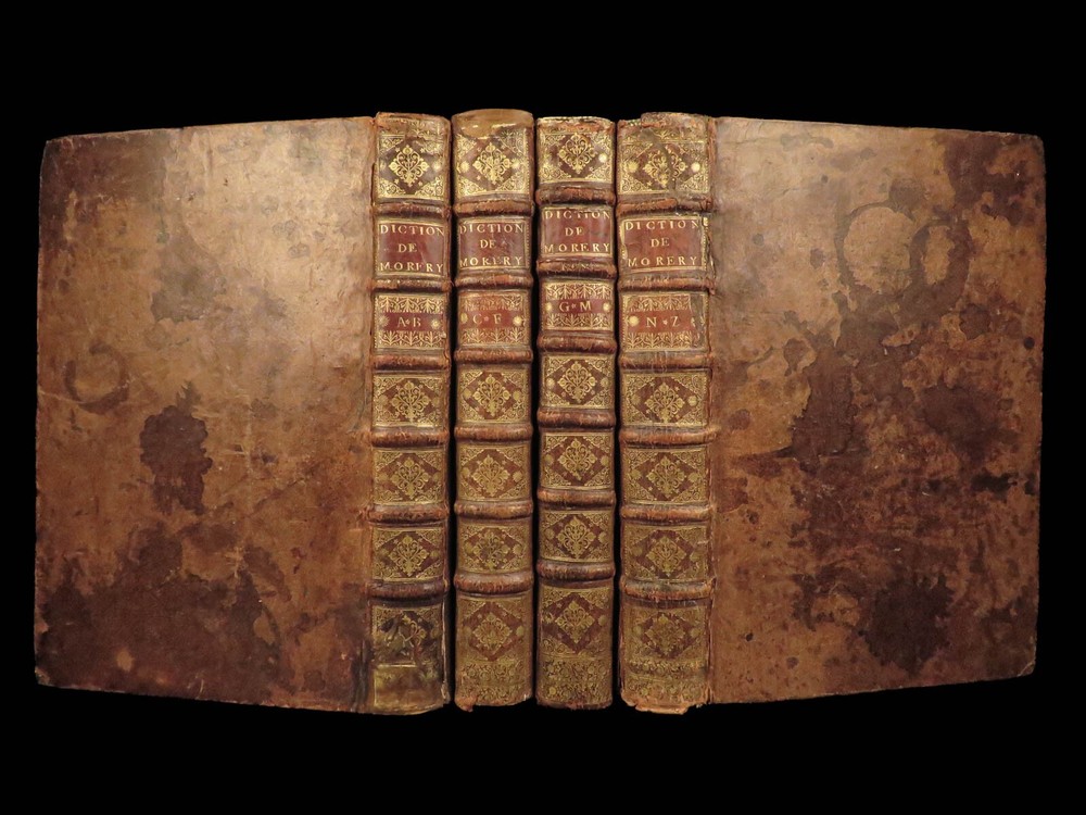 1699 FAMOUS Louis Moreri Historical Dictionary RARE Encyclopedia HUGE 4v SET Originally published in 1674, Louis Moreri’s “ Grand Dictionaire Historique ” was an encyclopedia focused on historical and biographical articles. The original French and English edition were critical in giving rise to more other dictionaries, such as Pierre Bayle’s “ Critical Dictionary ”. While this work was highly influential during its time , it was eventually replaced as the preeminent reference work when Diderot’s ‘ Encyclopedia’ was printed. This 1699 massive four-volume edition was published in Paris by Denys Mariette. Item number: #22787 Price: $1950 MORERI, Louis Le grand dictionaire historique, ou, Le mélange curieuz de l'histoire sacré et profane, qui contient en abrégé les vies et les actions Paris: Denys Mariette, 1699. Details : · Collation: Complete with all pages; 4 volumes o Vol. I (A-B) – [20], 588 § Added engraved title page and portrait o Vol. II (C-F) – [4], 656 o Vol. III (G-M) – [4], 677, [1] o Vol. IV (N-Z) – [4], 725, [3] · Provenance: Handwritten o [ Olivarius Baillehache ] , 1699 o [ Remiguin Françoise Macé ], 1797 · Language: French · Binding: Leather; tight and secure · Size : ~15.5in X 10.5in (39.5cm x 26.5cm) · very rare and desirable Our Guarantee: Very Fast. Very Safe. Free Shipping Worldwide. Customer satisfaction is our priority! Notify us with 7 days of receiving, and we will offer a full refund without reservation! 22787