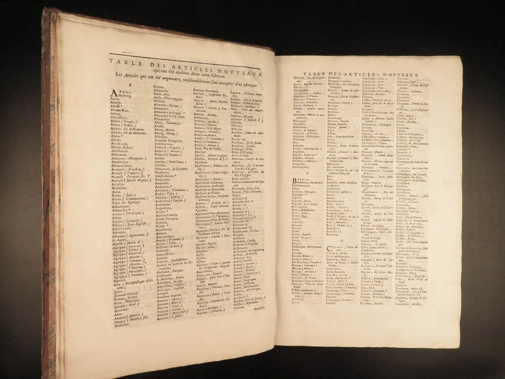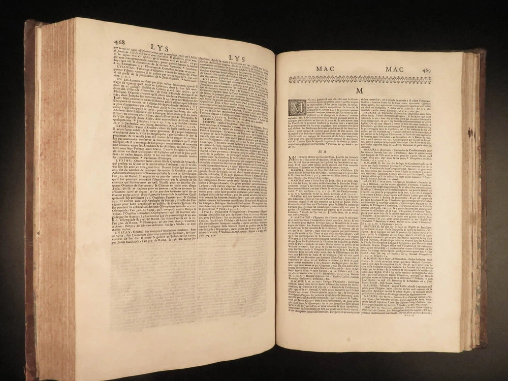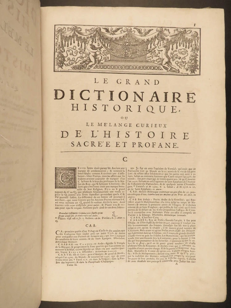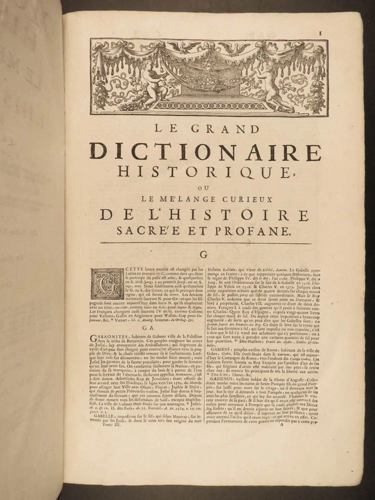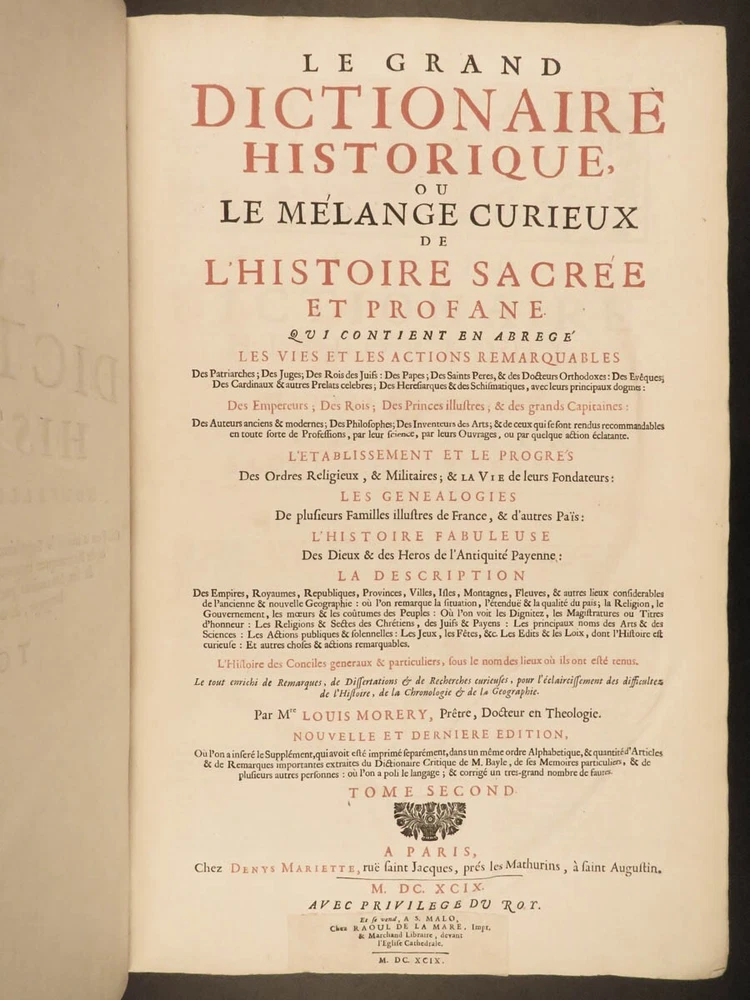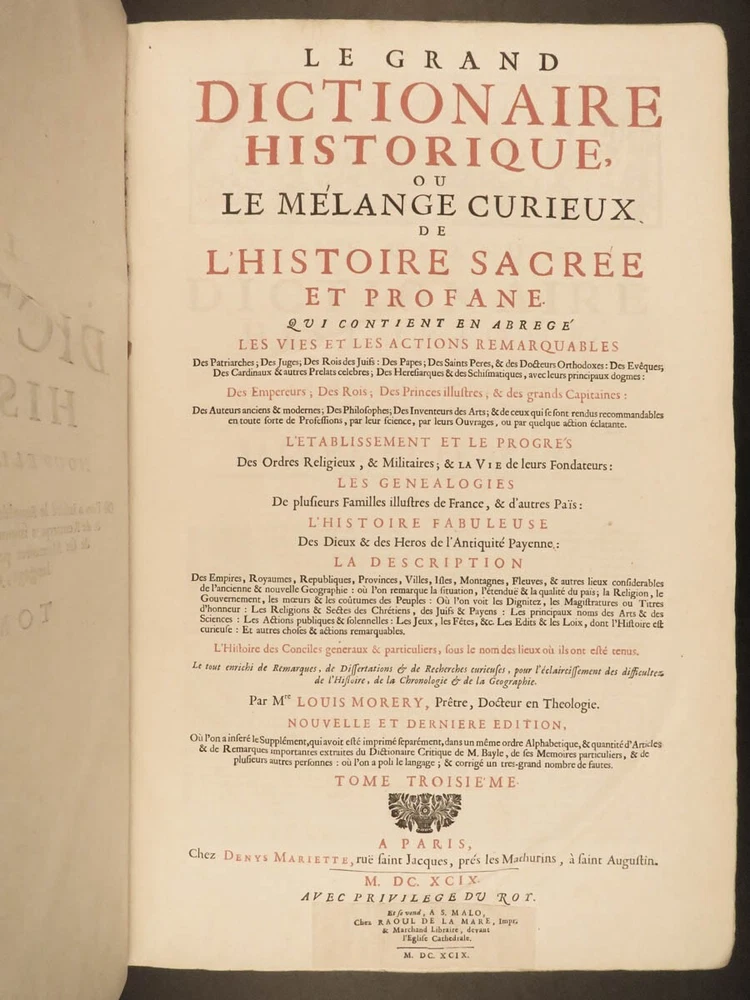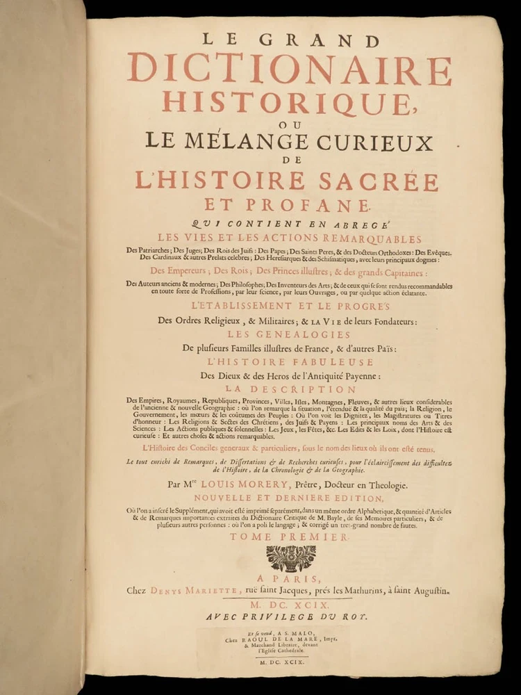 1699 FAMOUS Louis Moreri Historical Dictionary RARE Encyclopedia HUGE 4v SET Originally published in 1674, Louis Moreri’s “ Grand Dictionaire Historique ” was an encyclopedia focused on historical and biographical articles. The original French and English edition were critical in giving rise to more other dictionaries, such as Pierre Bayle’s “ Critical Dictionary ”. While this work was highly influential during its time , it was eventually replaced as the preeminent reference work when Diderot’s ‘ Encyclopedia’ was printed. This 1699 massive four-volume edition was published in Paris by Denys Mariette. Item number: #22787 Price: $1950 MORERI, Louis Le grand dictionaire historique, ou, Le mélange curieuz de l'histoire sacré et profane, qui contient en abrégé les vies et les actions Paris: Denys Mariette, 1699. Details : · Collation: Complete with all pages; 4 volumes o Vol. I (A-B) – [20], 588 § Added engraved title page and portrait o Vol. II (C-F) – [4], 656 o Vol. III (G-M) – [4], 677, [1] o Vol. IV (N-Z) – [4], 725, [3] · Provenance: Handwritten o [ Olivarius Baillehache ] , 1699 o [ Remiguin Françoise Macé ], 1797 · Language: French · Binding: Leather; tight and secure · Size : ~15.5in X 10.5in (39.5cm x 26.5cm) · very rare and desirable Our Guarantee: Very Fast. Very Safe. Free Shipping Worldwide. Customer satisfaction is our priority! Notify us with 7 days of receiving, and we will offer a full refund without reservation! 22787