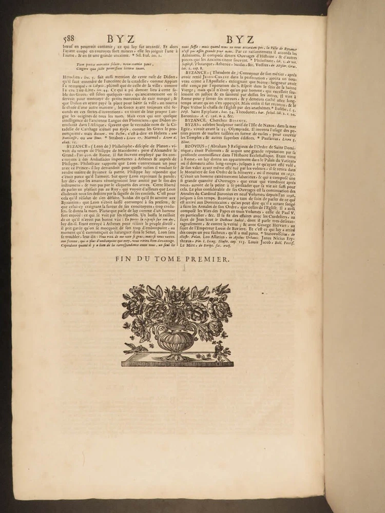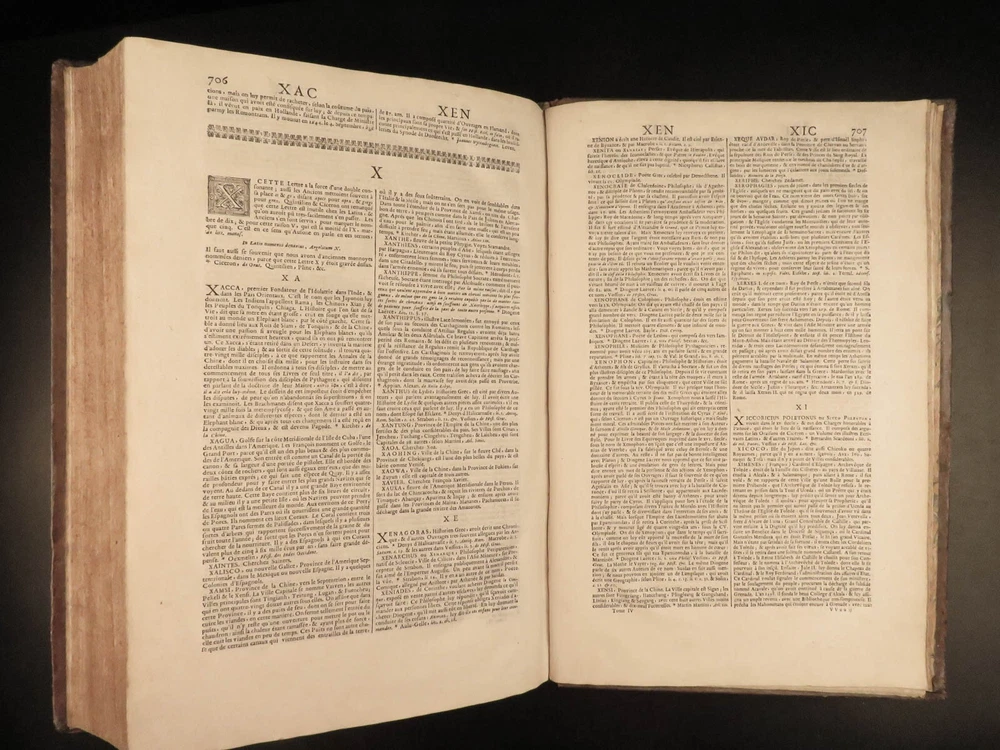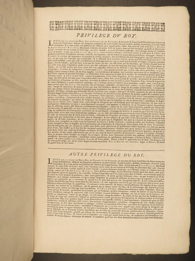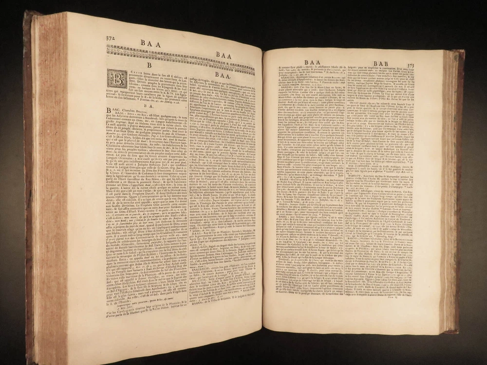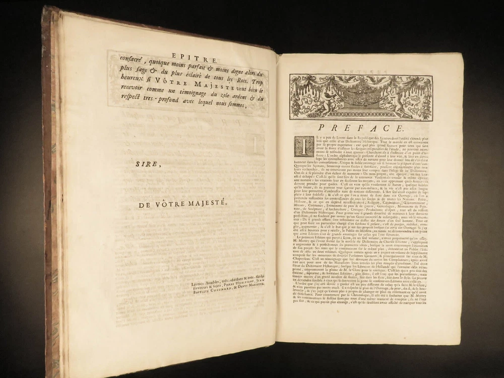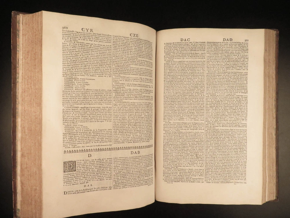 1699 FAMOUS Louis Moreri Historical Dictionary RARE Encyclopedia HUGE 4v SET Originally published in 1674, Louis Moreri’s “ Grand Dictionaire Historique ” was an encyclopedia focused on historical and biographical articles. The original French and English edition were critical in giving rise to more other dictionaries, such as Pierre Bayle’s “ Critical Dictionary ”. While this work was highly influential during its time , it was eventually replaced as the preeminent reference work when Diderot’s ‘ Encyclopedia’ was printed. This 1699 massive four-volume edition was published in Paris by Denys Mariette. Item number: #22787 Price: $1950 MORERI, Louis Le grand dictionaire historique, ou, Le mélange curieuz de l'histoire sacré et profane, qui contient en abrégé les vies et les actions Paris: Denys Mariette, 1699. Details : · Collation: Complete with all pages; 4 volumes o Vol. I (A-B) – [20], 588 § Added engraved title page and portrait o Vol. II (C-F) – [4], 656 o Vol. III (G-M) – [4], 677, [1] o Vol. IV (N-Z) – [4], 725, [3] · Provenance: Handwritten o [ Olivarius Baillehache ] , 1699 o [ Remiguin Françoise Macé ], 1797 · Language: French · Binding: Leather; tight and secure · Size : ~15.5in X 10.5in (39.5cm x 26.5cm) · very rare and desirable Our Guarantee: Very Fast. Very Safe. Free Shipping Worldwide. Customer satisfaction is our priority! Notify us with 7 days of receiving, and we will offer a full refund without reservation! 22787