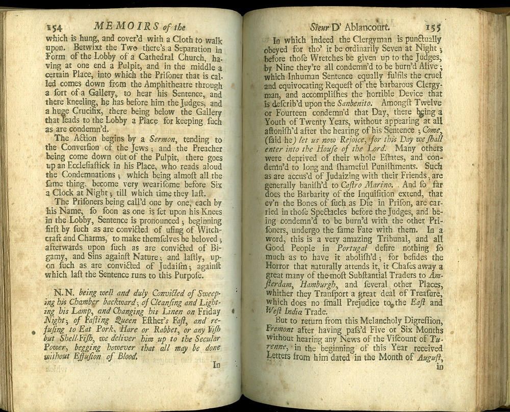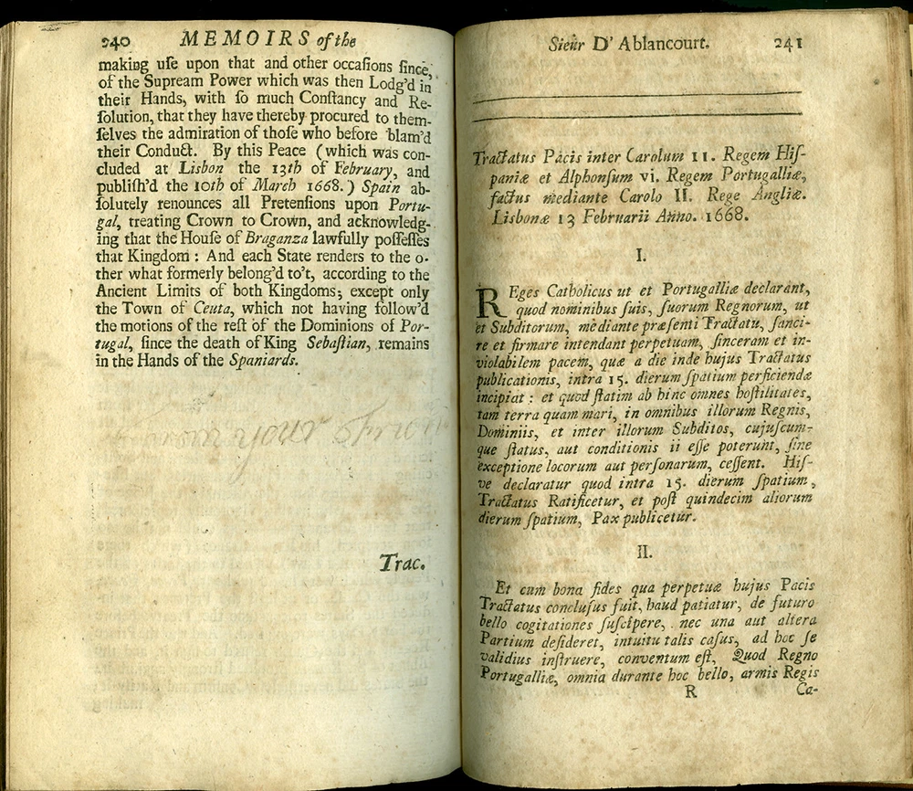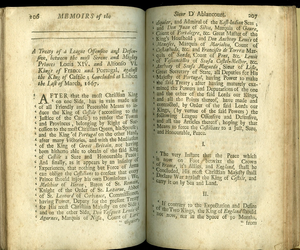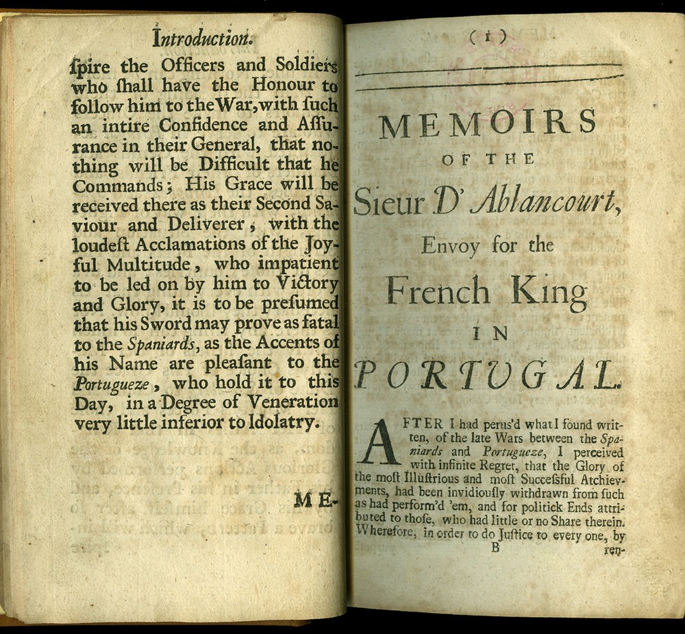 16th - 19th Century Fine and Rare Books, Maps, Manuscripts, and Atlases SIEUR d' ABLANCOURT MEMOIRS of the Sieur d'Ablancourt (Memoires De Monsieur d'Ablancourt) CONTAINING General History of the Court and Kingdom of Portugal from the Pyrenean Treaty to the Year 1668... Translated from the French Copy printed at Paris, 1701 Envoy - French King - Portugal - Pyrenean Treaty London 1703 FIRST ENGLISH EDITION ABLANCOURT, SIEUR d'. (1621-1696) Memoirs of the Sieur d'Ablancourt (Memoires De Monsieur D'Ablancourt) Containing a General History of the Court and Kingdom of Portugal, from the Pyrenean Treaty to the Year 1668... Translated from the French Copy printed at Paris, 1701 CONTAINING: A General History of the Court and Kingdom of Portugal, from the Pyrenean Treaty, to the Year 1668. With a full Relation of all the Battels and Sieges in the War between Spain and Portugal, under the Command of the late Duke of Schomberg, then in the Portugueze Service. With the Character and some material Passages of that Great General's Life: As also an exact Account of the deposing of the late King Alfonso, and the Accession of Don Pedro, his present Portugueze Majesty; and other remarkable Transactions, whereby will appear the Genius, Policy and Strength of that Nation, and its Interest with respect to Foreign Courts: Also the Treaty of Peace between Portugal and Spain, and the League Offensive and Defensive between France and Portugal. Printed for Ralph Smith, under the Royal-Exchange, Cornhill; and James Round in Exchange-Alley, 1703. Bound in full Calf Leather, its leaves crisp with minimal foxing. - [8], 262, [2] pages. (8vo) - Quite Rare FIRST ENGLISH EDITION PAYMENT - CREDIT CARDS DISCOVER - MASTERCARD - VISA - AMERICAN EXPRESS SHIPPING - USPS / FEDEX