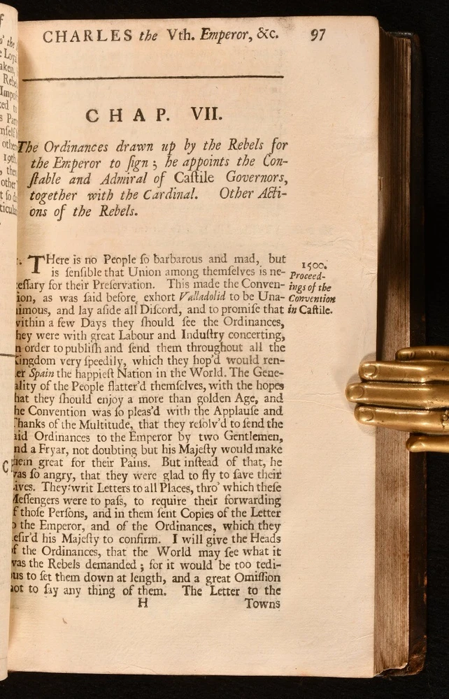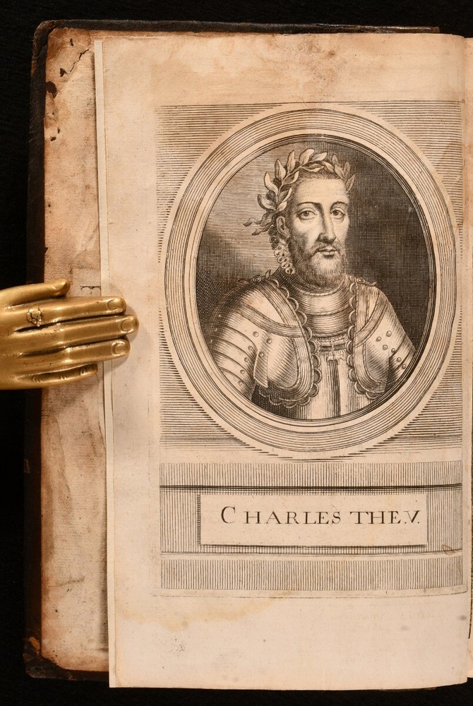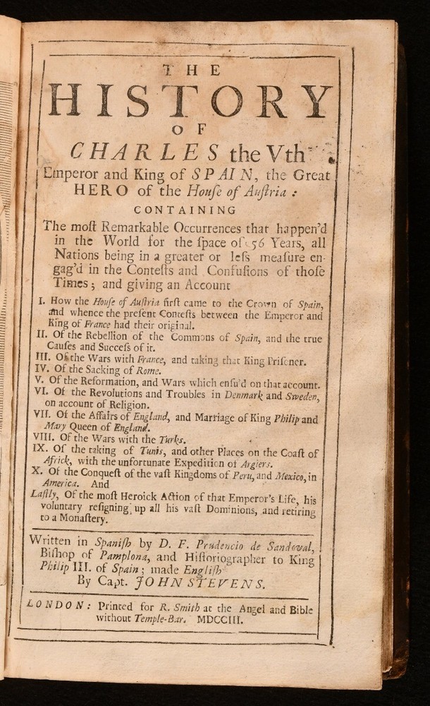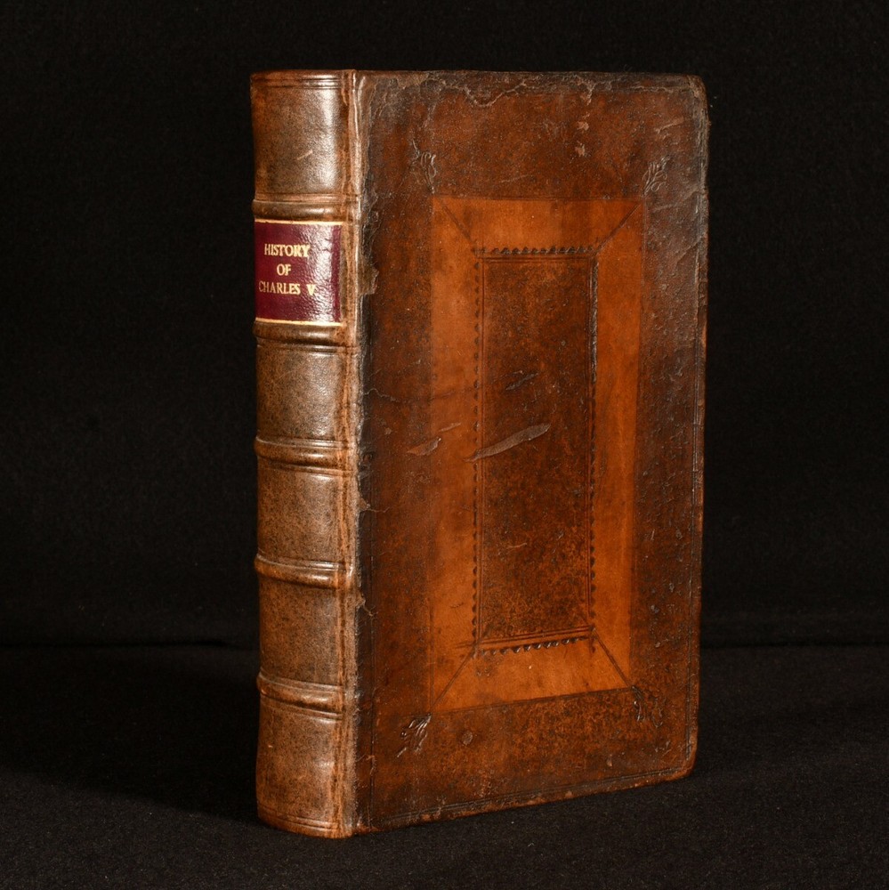 Click here to see our other books! The History of Charles the Vth Emperor and King of Spain, the Great Hero of the House of Austria D. F. Prudencio de Sandoval; John Stevens 1703 R. Smith : London 7.5" by 5" [16], 464, [7pp] SUMMARY A very scarce first edition in English of Prudencio de Sandoval's important history of Emperor Charles V, a sought after work illustrated with a portrait frontispiece. First Edition,Illustrated,Leather Binding,Very Scarce Overall Condition: Very Good This book weighs 0.75 KG when packed UK Postage: £ 3.99 US Postage: £ 19.99 EU Postage : £ 15.99 European Postage: £ 16.99 Asia Postage: £ 21.99 Worldwide Postage: £ 25.99 DESCRIPTION The very scarce first edition of this work in English. ESTC citation number T153443. Illustrated with a portrait frontispiece. Register is irregular but text is complete and continuous. Collated, complete. Originally written in Spanish and published between 1604 and 1606. A detailed biography and history on the life and reign of Emperor Charles V. This biography is a very important source of information on the reign of Charles and its importance. Charles V was a member of the House of Habsburg, and saw the family rise in ranks and situation throughout his life as he was at the head. Charles also held the titles of the Archduke of Austria, the King of Spain, and Lord of the Netherlands as Duke of Burgundy. Written by Prudencio de Sandoval, a Spanish historian, and Benedictine monk. Translated into English by John Stevens. Two bookplates to the front paste down, of Tortworth Rectory and Richard Luckett. CONDITION In a full calf binding, rebacked with the original boards restored. Externally, generally smart. Some light rubbing and discolouration to the original boards. Minor bumping to the extremities. Only a few small marks to the boards. Front paste down and endpaper are discoloured and a little worn, with a repaired chip to the head of the front endpaper. Internally, firmly bound. Pages are lightly age-toned and generally clean with the occasional spot. Tide mark to the frontispiece and first couple of pages, smaller tide mark to the head of the last few pages. Overall Condition: Very Good GLOSSARY OF TERMS Overall Condition (Dustwrapper condition rating is shown after that for the book itself, where a dustwrapper is present) Fine - Very well preserved copy showing very little wear Very Good Indeed - Only one or two minor faults, really a very attractive copy Very Good - Quite a wide term meaning no major faults but probably several smaller ones often expected given the age of the book, but still a respectable copy Good - Meaning not very good. Some more serious faults as will be described in the condition report under 'condition' Good Only - Meaning one or more faults that could really do with repair Fair - As with good only above but with other faults leaving a compromised copy even after repair Poor - Really bad and possibly seriously incomplete. We only sell books in this condition where their rarity or value makes them attractive none the less. Major defects will be described. GUARANTEE We offer a full money back guarantee on our descriptions. Please ask for details and conditions. We prefer PAYPAL. If you pay via PAYPAL we will post the item off the same or the next working day with the postage you have selected. Please note we cannot accept USD cheques