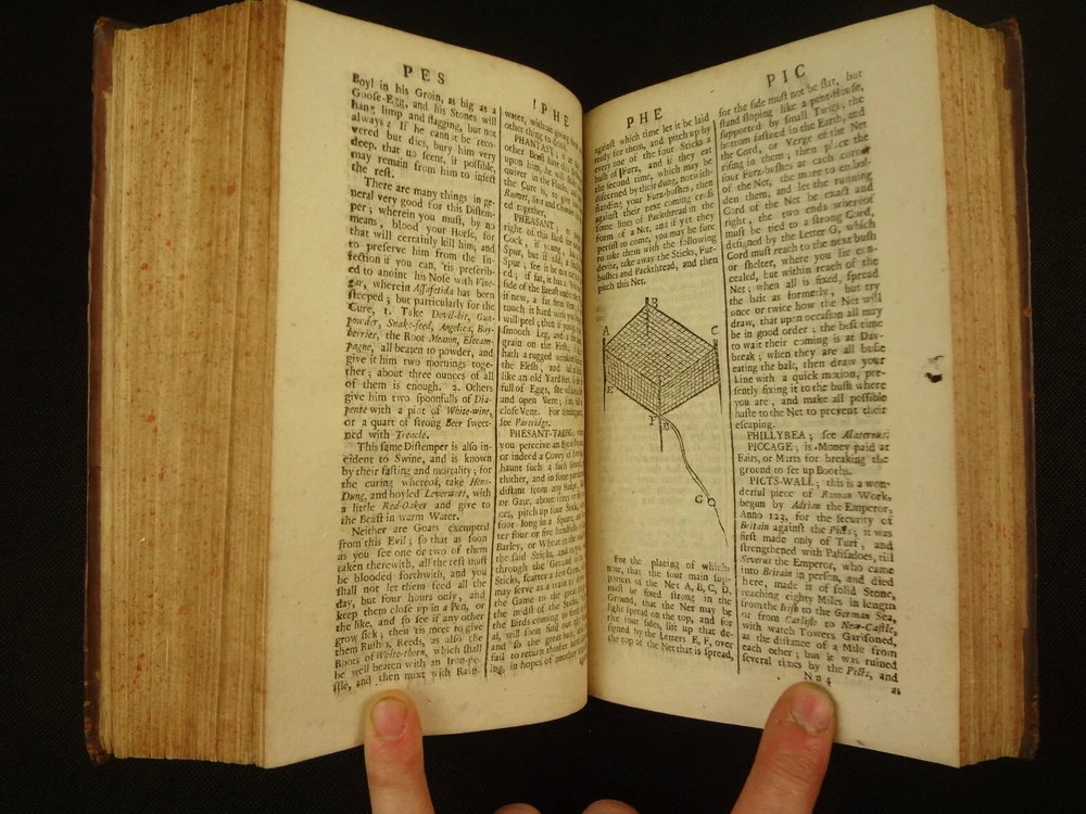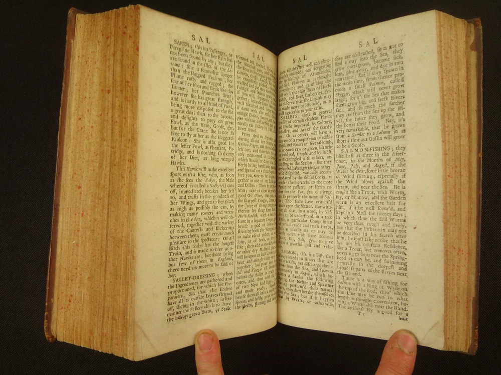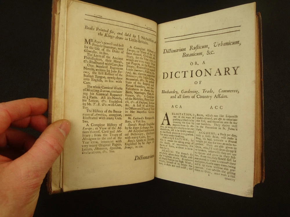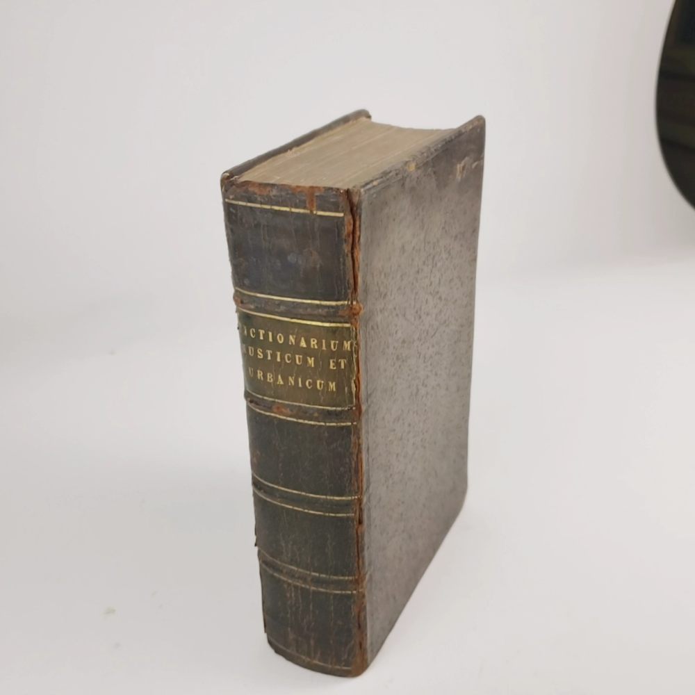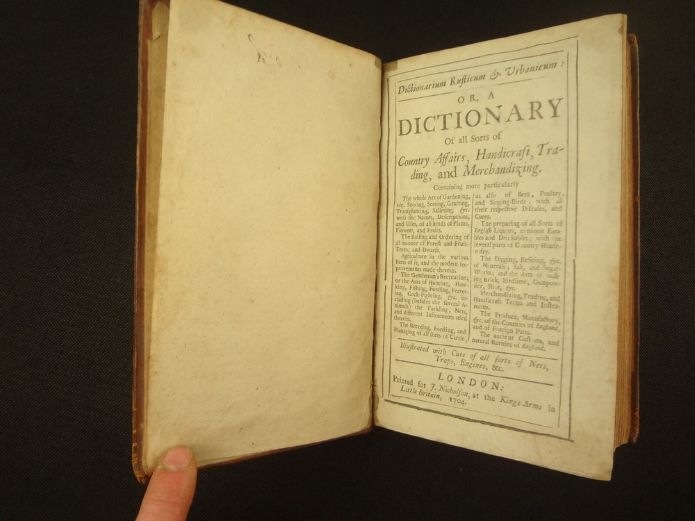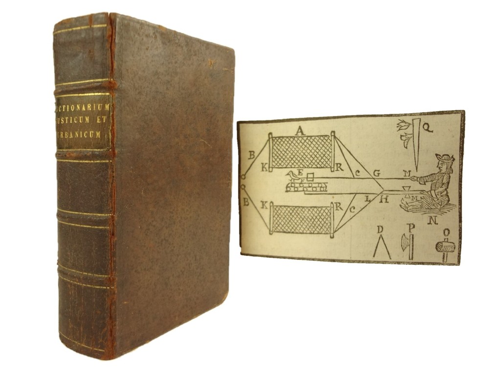 The 1st edition of the Dictionarium Rusticum et Urbanicum: Or, a Dictionary of All Sorts of Country Affairs... A remarkable work, that covers farming, fishing, birding, gunpowder, beer-making, cooking, etc. See the (very) full descriptive title below. A remarkable, practical, and useful work for those wishing to apply scientific advances to rural life. This work met with success and was immediately followed by a second issue, identified by a different name at the printer's mark. It was reprinted several times in the following decades, each time being expanded. Full Descriptive Title - Dictionarium rusticum & urbanicum: or, a dictionary of all sorts of country affairs, handicraft, trading, and merchandizing. Containing more particularly the whole art of gardening, viz. sowing, setting, grafting, transplanting, salleting, &c. with the names, descriptions, and uses, of all kinds of plants, flowers, and fruits. The raising and ordering of all manner of forest and fruit-trees, and dwarfs. Agriculture in the various parts of it, and the modern improvements made therein. The gentleman’s recreation; or the arts of hunting, hawking, fishing, fowling, ferreting, cock-fighting, &c. including (besides the several animals) the tackling, nets, and different instruments used therein. The breeding, feeding, and managing of all sorts of cattle, as also of bees, poultry, and singing-birds; with all their respective diseases, and cures. The preparing of all sorts of English liquors, common eatables and drinkables; with the several parts of country housewifry. The digging, refining, &c. of minerals; salt, and sugar-works; and the arts of making brick, birdlime, gunpowder, shot, &c. merchandizing, trading, and handicraft terms and instruments. The produce, manufactory, &c. of the counties of England, and of foreign parts. The ancient customs, and natural rarities of England. Illustrated with cuts of all sorts of nets, traps, engines, &c. About the Author - Because the author is not stated, it has been attributed to Nathan Bailey and John Worlidge. Mr. Worlidge printed, "Systema Agriculturae..." in 1669, with further additions following, in which is found a "Dictionarium Rusticum" glossary; it is much smaller in scope than the full work here printed, but shares some of the odder words, like, "Ablactation", and "Ablaqueation". Bailey printed Dictionaries in a similar style, but his first known edition was around 1720. It seems likely that Worlidge was the author. Regarding Worlidge, little is known other than that he printed several treatises on agriculture and hailed from Petersfield in the county of Hampshire, Gentleman. It seems his family included one estate manager, and the botanist John Goodyer. Bibliographic Details - English Short Title Catalogue number T138447. Worldcat OCLC numbers 1049459131 and 45210536 Goldsmiths'-Kress Library of Economic Literature - no. 4047 Physical Attributes - Measures approx. 20 x 12 x 4.5 cm. Leather binding. Boards with blind fillet frame. Board edges rolled with gilt tool. Spine with title in gilt on black morocco in one compartment; four raised bands. Sprinkled edges. Occasional illustrations. Pages - Not numbered, based on collation 834 Collation - A5, B-3G8. The odd A5 matches the catalogue entries. Condition - See pictures. Leather binding is dry; some crazing to spine (cracks). Joints cracked. Edge and corner wear. Some rubs to boards. Turn-ins ghosted endpapers. Lots of writing at front endpaper, some in old hands (shelfmarks), others newer. Looks like an ink spill settled into the gutter at front endpaper. Some separation between endpaper and text block at gutter. The first three leaves were opened poorly, leaving rough edges and chipping to the edges; bottom corner of second leaf missing. Some toning throughout, with occasional fox spots. Occasional thumb, dog-eared page, etc.. Occasional deckled-edge to page. Small candle ember hole in fore-edge margin of Low leaf. More toned at last ten leaves. Moisture mark from top-edge into margin at last third. Hinge cracked at rear, "080" on pastedown.