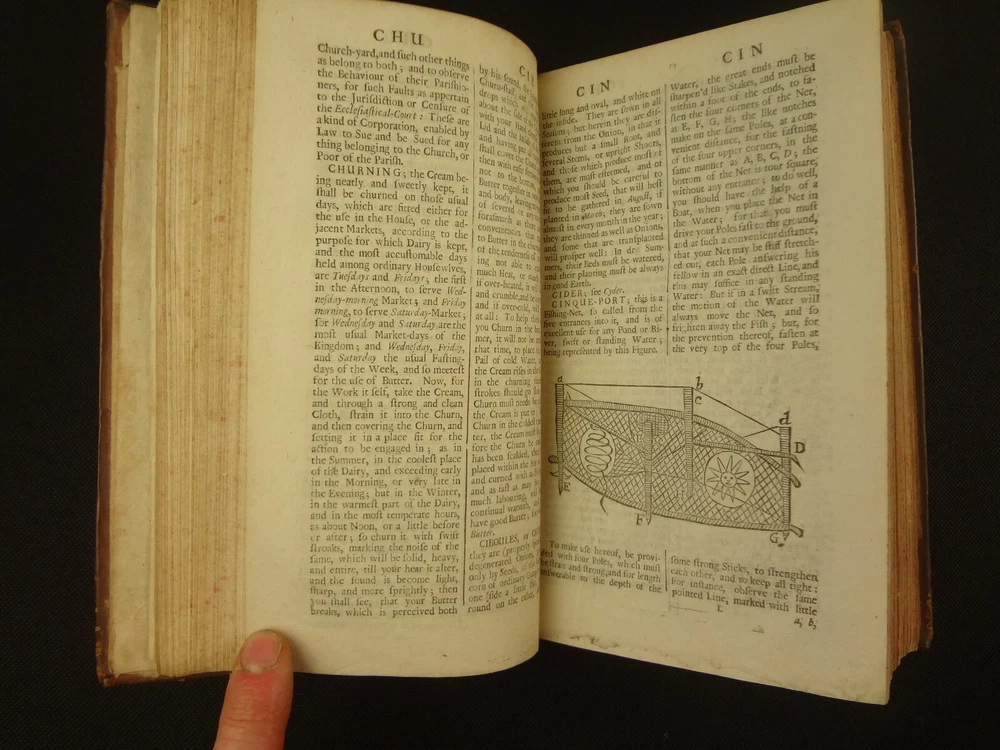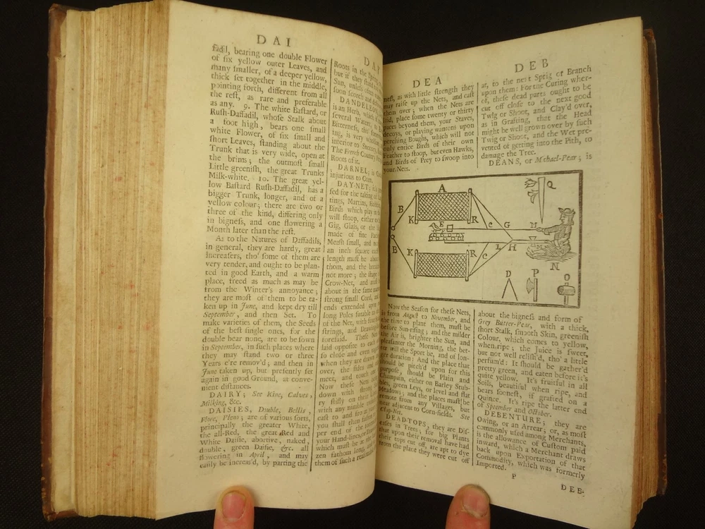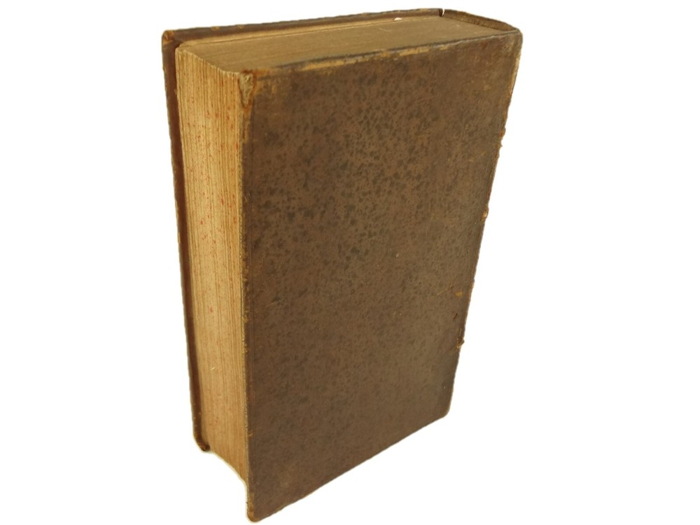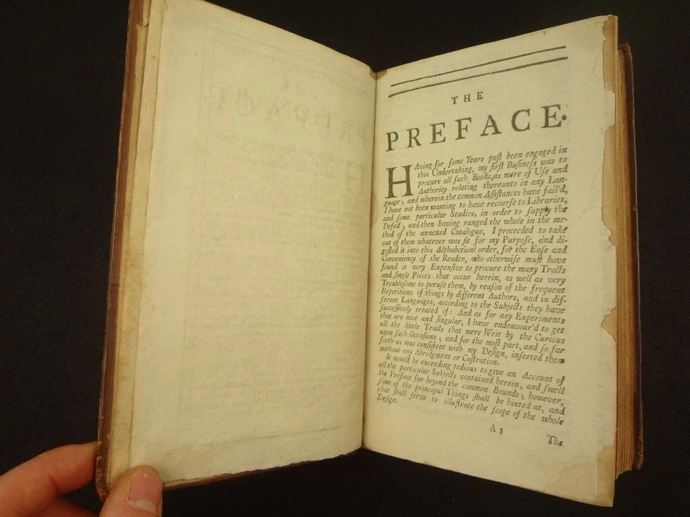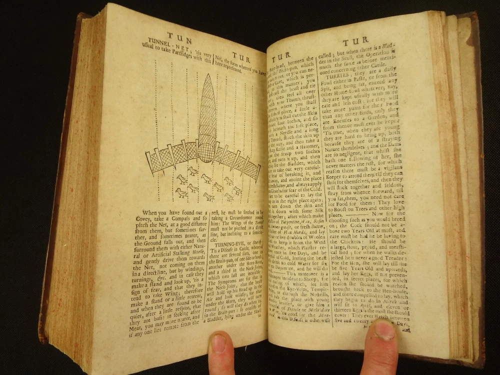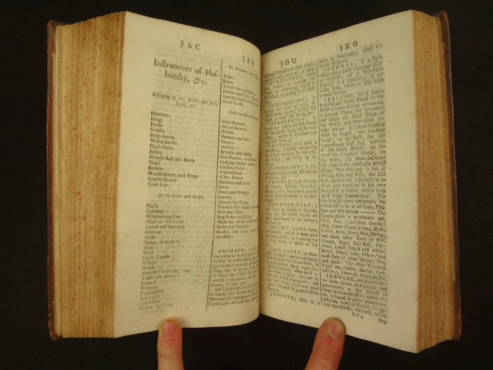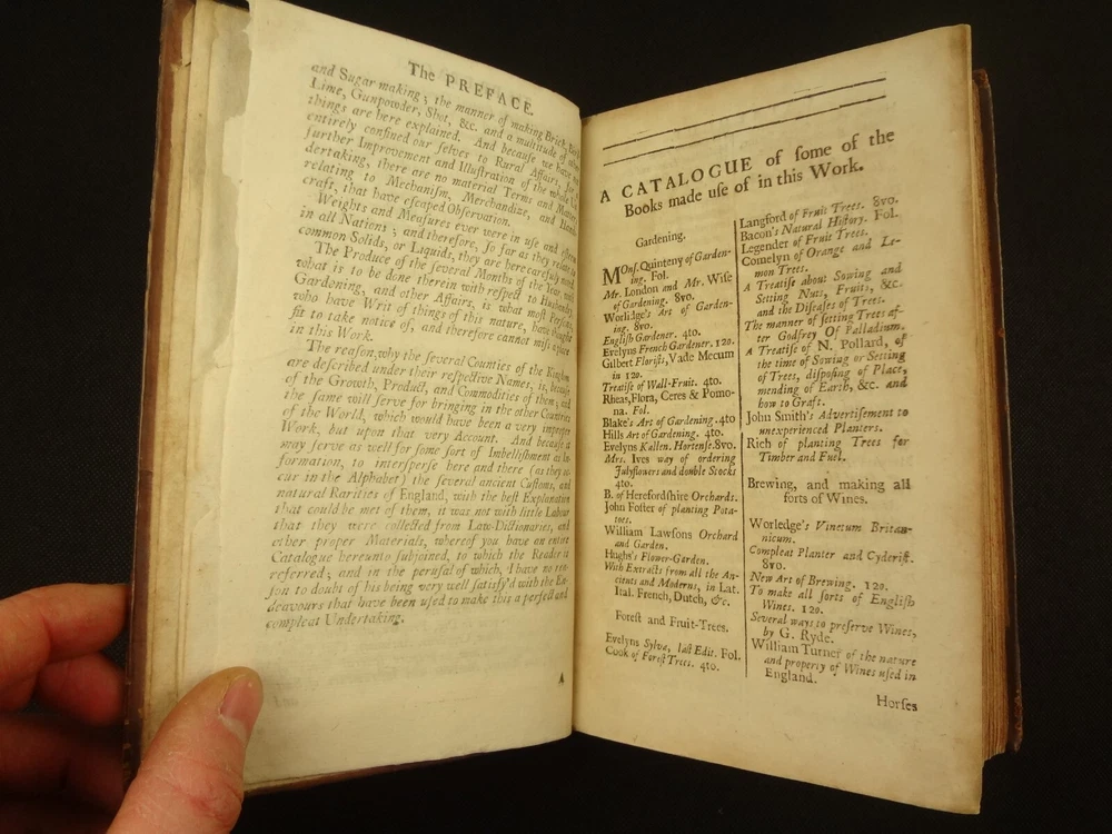 The 1st edition of the Dictionarium Rusticum et Urbanicum: Or, a Dictionary of All Sorts of Country Affairs... A remarkable work, that covers farming, fishing, birding, gunpowder, beer-making, cooking, etc. See the (very) full descriptive title below. A remarkable, practical, and useful work for those wishing to apply scientific advances to rural life. This work met with success and was immediately followed by a second issue, identified by a different name at the printer's mark. It was reprinted several times in the following decades, each time being expanded. Full Descriptive Title - Dictionarium rusticum & urbanicum: or, a dictionary of all sorts of country affairs, handicraft, trading, and merchandizing. Containing more particularly the whole art of gardening, viz. sowing, setting, grafting, transplanting, salleting, &c. with the names, descriptions, and uses, of all kinds of plants, flowers, and fruits. The raising and ordering of all manner of forest and fruit-trees, and dwarfs. Agriculture in the various parts of it, and the modern improvements made therein. The gentleman’s recreation; or the arts of hunting, hawking, fishing, fowling, ferreting, cock-fighting, &c. including (besides the several animals) the tackling, nets, and different instruments used therein. The breeding, feeding, and managing of all sorts of cattle, as also of bees, poultry, and singing-birds; with all their respective diseases, and cures. The preparing of all sorts of English liquors, common eatables and drinkables; with the several parts of country housewifry. The digging, refining, &c. of minerals; salt, and sugar-works; and the arts of making brick, birdlime, gunpowder, shot, &c. merchandizing, trading, and handicraft terms and instruments. The produce, manufactory, &c. of the counties of England, and of foreign parts. The ancient customs, and natural rarities of England. Illustrated with cuts of all sorts of nets, traps, engines, &c. About the Author - Because the author is not stated, it has been attributed to Nathan Bailey and John Worlidge. Mr. Worlidge printed, "Systema Agriculturae..." in 1669, with further additions following, in which is found a "Dictionarium Rusticum" glossary; it is much smaller in scope than the full work here printed, but shares some of the odder words, like, "Ablactation", and "Ablaqueation". Bailey printed Dictionaries in a similar style, but his first known edition was around 1720. It seems likely that Worlidge was the author. Regarding Worlidge, little is known other than that he printed several treatises on agriculture and hailed from Petersfield in the county of Hampshire, Gentleman. It seems his family included one estate manager, and the botanist John Goodyer. Bibliographic Details - English Short Title Catalogue number T138447. Worldcat OCLC numbers 1049459131 and 45210536 Goldsmiths'-Kress Library of Economic Literature - no. 4047 Physical Attributes - Measures approx. 20 x 12 x 4.5 cm. Leather binding. Boards with blind fillet frame. Board edges rolled with gilt tool. Spine with title in gilt on black morocco in one compartment; four raised bands. Sprinkled edges. Occasional illustrations. Pages - Not numbered, based on collation 834 Collation - A5, B-3G8. The odd A5 matches the catalogue entries. Condition - See pictures. Leather binding is dry; some crazing to spine (cracks). Joints cracked. Edge and corner wear. Some rubs to boards. Turn-ins ghosted endpapers. Lots of writing at front endpaper, some in old hands (shelfmarks), others newer. Looks like an ink spill settled into the gutter at front endpaper. Some separation between endpaper and text block at gutter. The first three leaves were opened poorly, leaving rough edges and chipping to the edges; bottom corner of second leaf missing. Some toning throughout, with occasional fox spots. Occasional thumb, dog-eared page, etc.. Occasional deckled-edge to page. Small candle ember hole in fore-edge margin of Low leaf. More toned at last ten leaves. Moisture mark from top-edge into margin at last third. Hinge cracked at rear, "080" on pastedown.