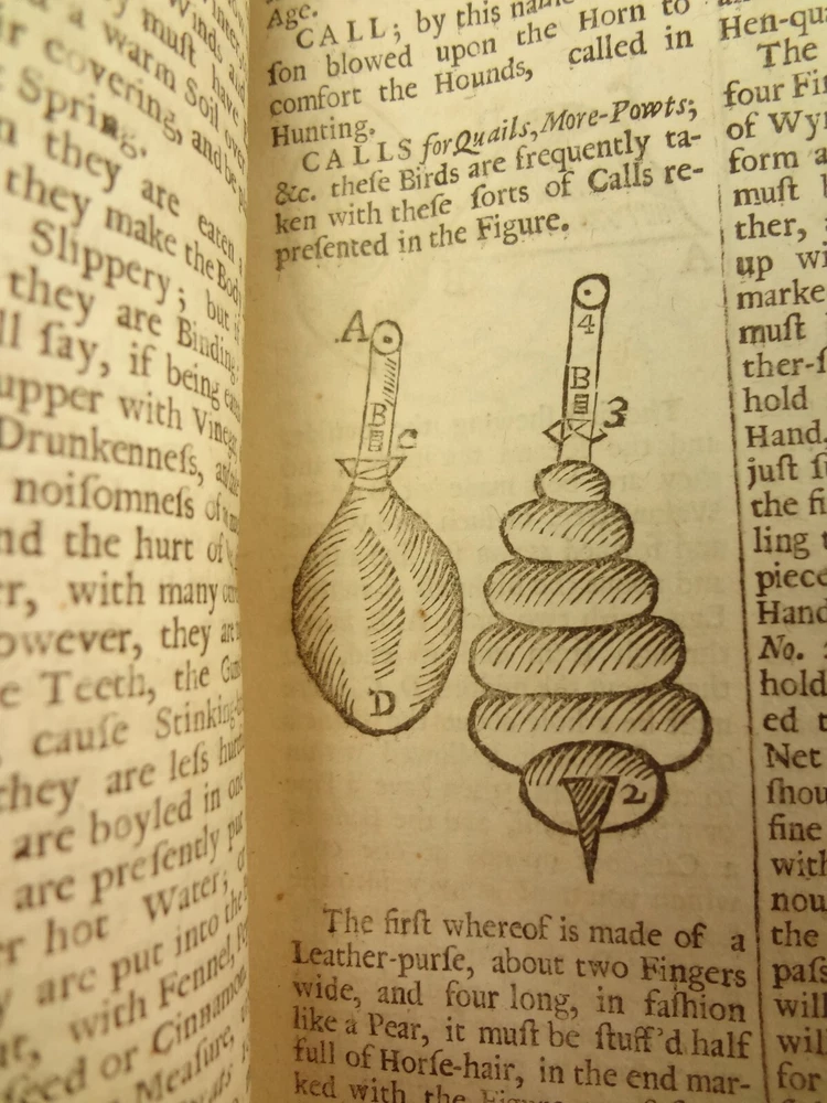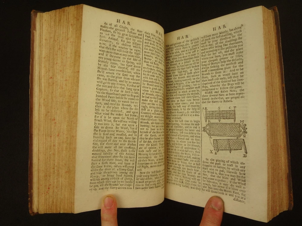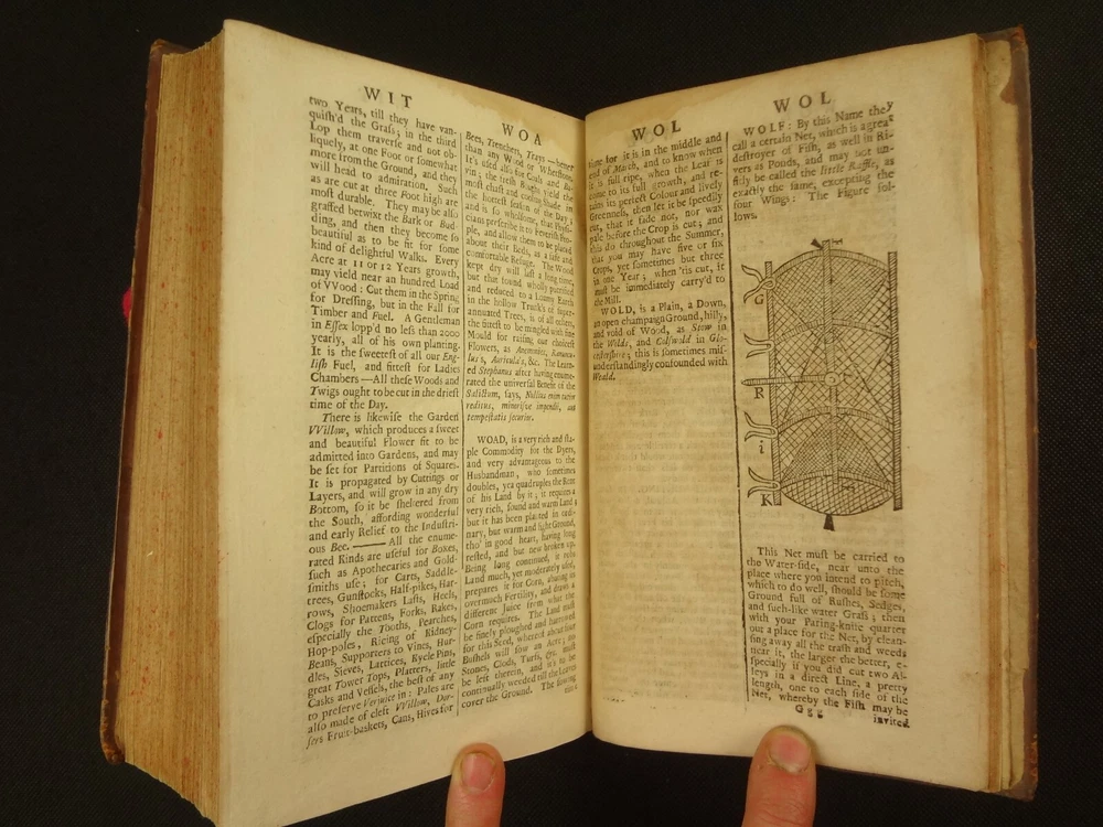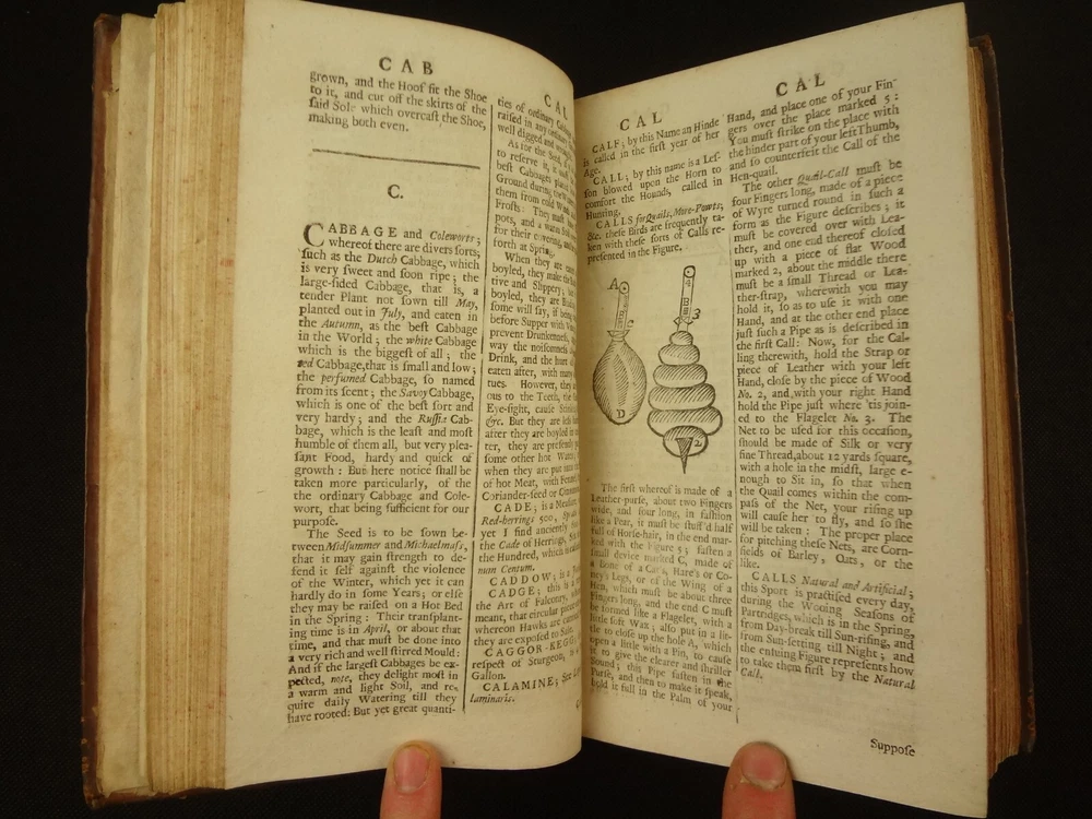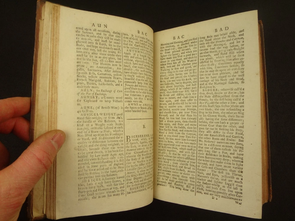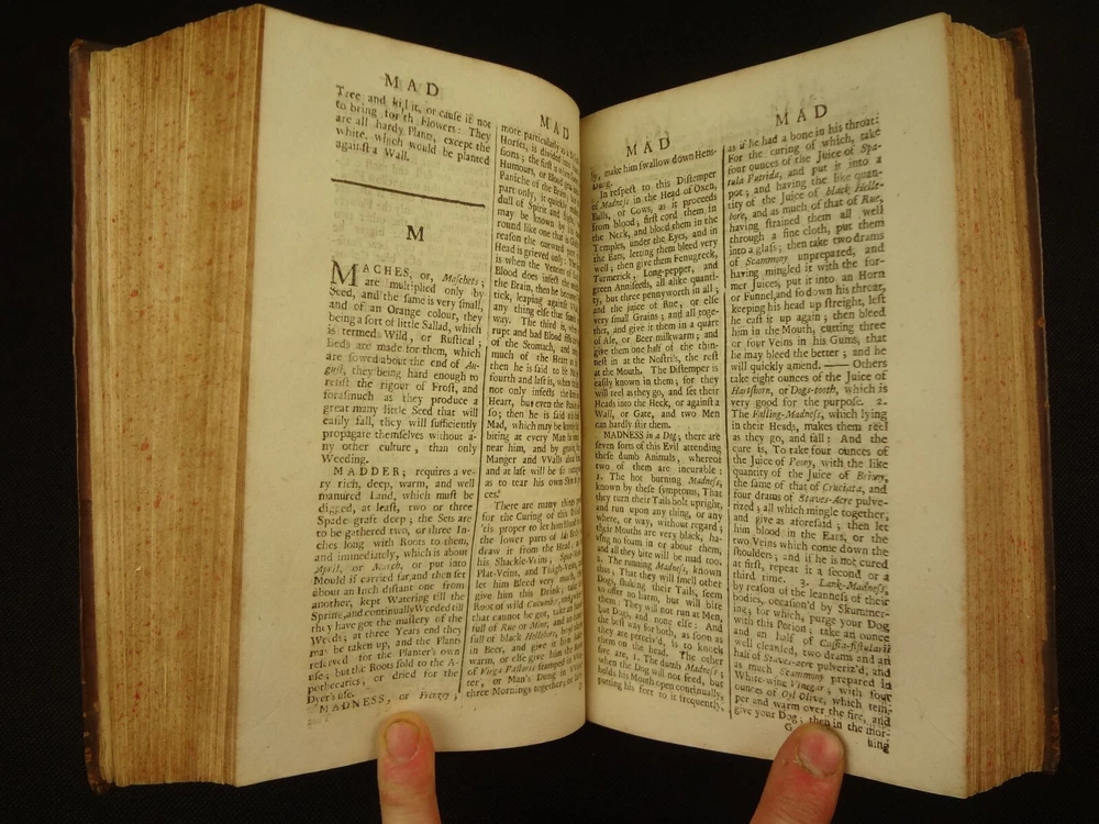The 1st edition of the Dictionarium Rusticum et Urbanicum: Or, a Dictionary of All Sorts of Country Affairs... A remarkable work, that covers farming, fishing, birding, gunpowder, beer-making, cooking, etc. See the (very) full descriptive title below. A remarkable, practical, and useful work for those wishing to apply scientific advances to rural life. This work met with success and was immediately followed by a second issue, identified by a different name at the printer's mark. It was reprinted several times in the following decades, each time being expanded. Full Descriptive Title - Dictionarium rusticum & urbanicum: or, a dictionary of all sorts of country affairs, handicraft, trading, and merchandizing. Containing more particularly the whole art of gardening, viz. sowing, setting, grafting, transplanting, salleting, &c. with the names, descriptions, and uses, of all kinds of plants, flowers, and fruits. The raising and ordering of all manner of forest and fruit-trees, and dwarfs. Agriculture in the various parts of it, and the modern improvements made therein. The gentleman’s recreation; or the arts of hunting, hawking, fishing, fowling, ferreting, cock-fighting, &c. including (besides the several animals) the tackling, nets, and different instruments used therein. The breeding, feeding, and managing of all sorts of cattle, as also of bees, poultry, and singing-birds; with all their respective diseases, and cures. The preparing of all sorts of English liquors, common eatables and drinkables; with the several parts of country housewifry. The digging, refining, &c. of minerals; salt, and sugar-works; and the arts of making brick, birdlime, gunpowder, shot, &c. merchandizing, trading, and handicraft terms and instruments. The produce, manufactory, &c. of the counties of England, and of foreign parts. The ancient customs, and natural rarities of England. Illustrated with cuts of all sorts of nets, traps, engines, &c. About the Author - Because the author is not stated, it has been attributed to Nathan Bailey and John Worlidge. Mr. Worlidge printed, "Systema Agriculturae..." in 1669, with further additions following, in which is found a "Dictionarium Rusticum" glossary; it is much smaller in scope than the full work here printed, but shares some of the odder words, like, "Ablactation", and "Ablaqueation". Bailey printed Dictionaries in a similar style, but his first known edition was around 1720. It seems likely that Worlidge was the author. Regarding Worlidge, little is known other than that he printed several treatises on agriculture and hailed from Petersfield in the county of Hampshire, Gentleman. It seems his family included one estate manager, and the botanist John Goodyer. Bibliographic Details - English Short Title Catalogue number T138447. Worldcat OCLC numbers 1049459131 and 45210536 Goldsmiths'-Kress Library of Economic Literature - no. 4047 Physical Attributes - Measures approx. 20 x 12 x 4.5 cm. Leather binding. Boards with blind fillet frame. Board edges rolled with gilt tool. Spine with title in gilt on black morocco in one compartment; four raised bands. Sprinkled edges. Occasional illustrations. Pages - Not numbered, based on collation 834 Collation - A5, B-3G8. The odd A5 matches the catalogue entries. Condition - See pictures. Leather binding is dry; some crazing to spine (cracks). Joints cracked. Edge and corner wear. Some rubs to boards. Turn-ins ghosted endpapers. Lots of writing at front endpaper, some in old hands (shelfmarks), others newer. Looks like an ink spill settled into the gutter at front endpaper. Some separation between endpaper and text block at gutter. The first three leaves were opened poorly, leaving rough edges and chipping to the edges; bottom corner of second leaf missing. Some toning throughout, with occasional fox spots. Occasional thumb, dog-eared page, etc.. Occasional deckled-edge to page. Small candle ember hole in fore-edge margin of Low leaf. More toned at last ten leaves. Moisture mark from top-edge into margin at last third. Hinge cracked at rear, "080" on pastedown.